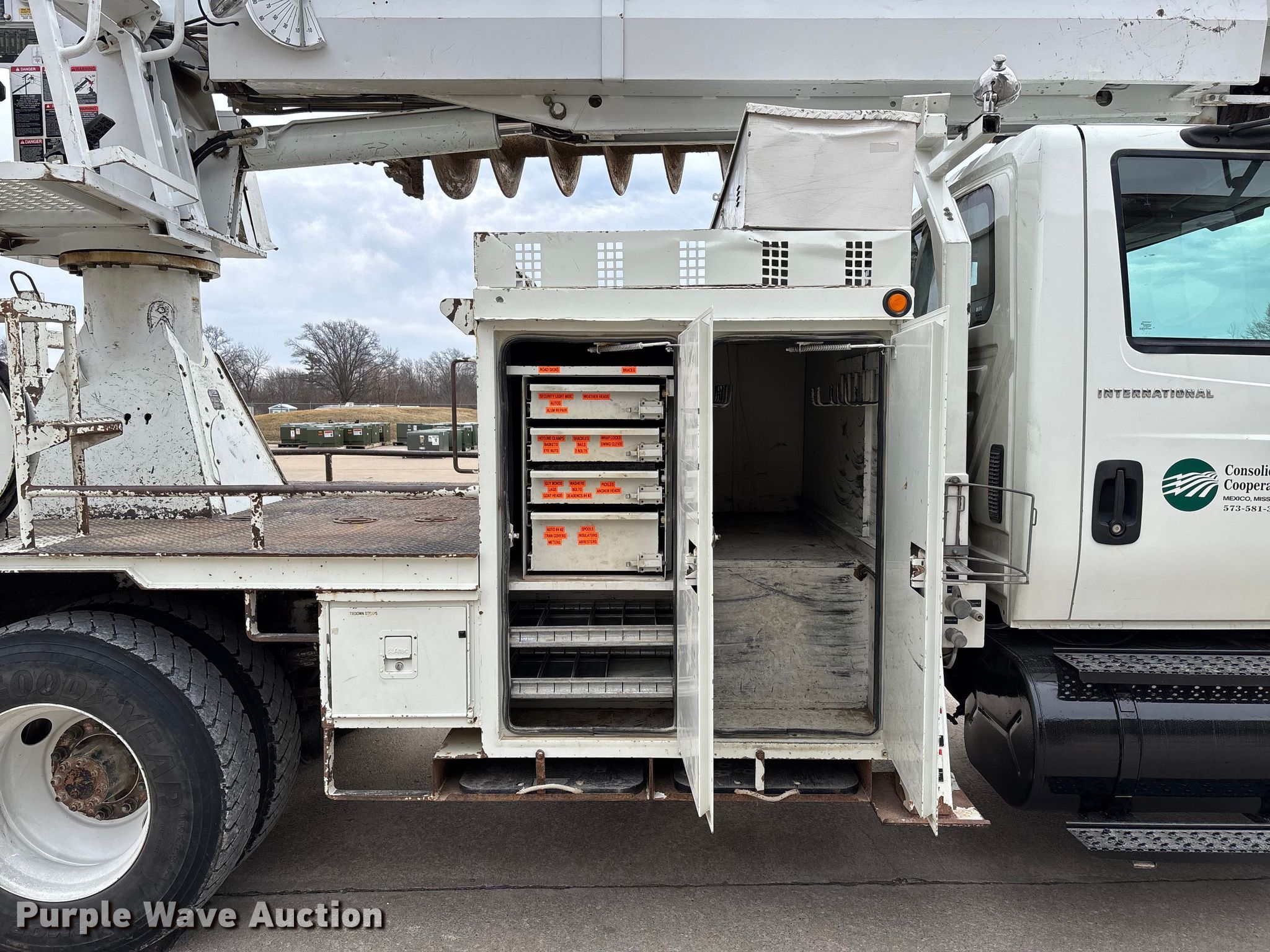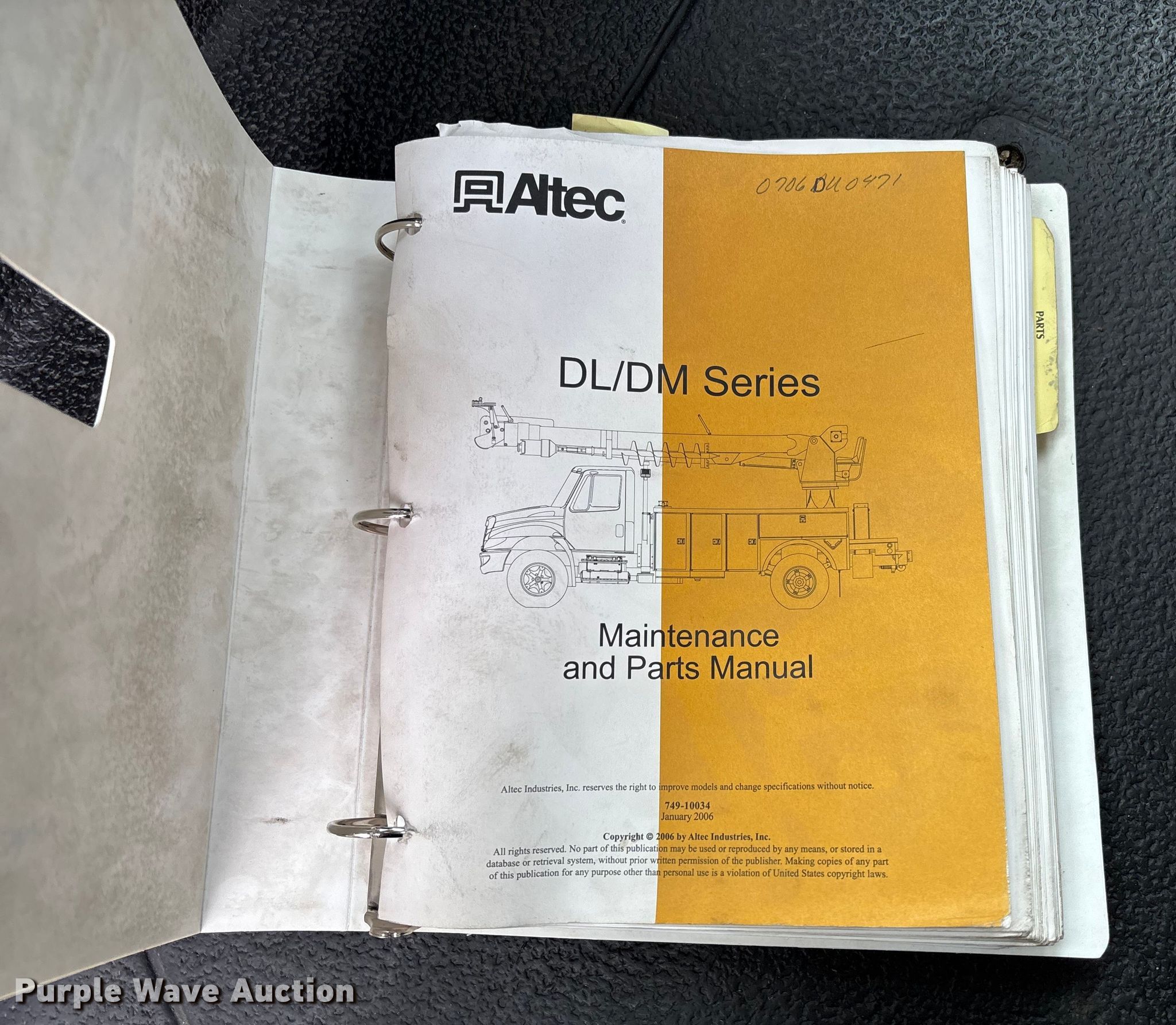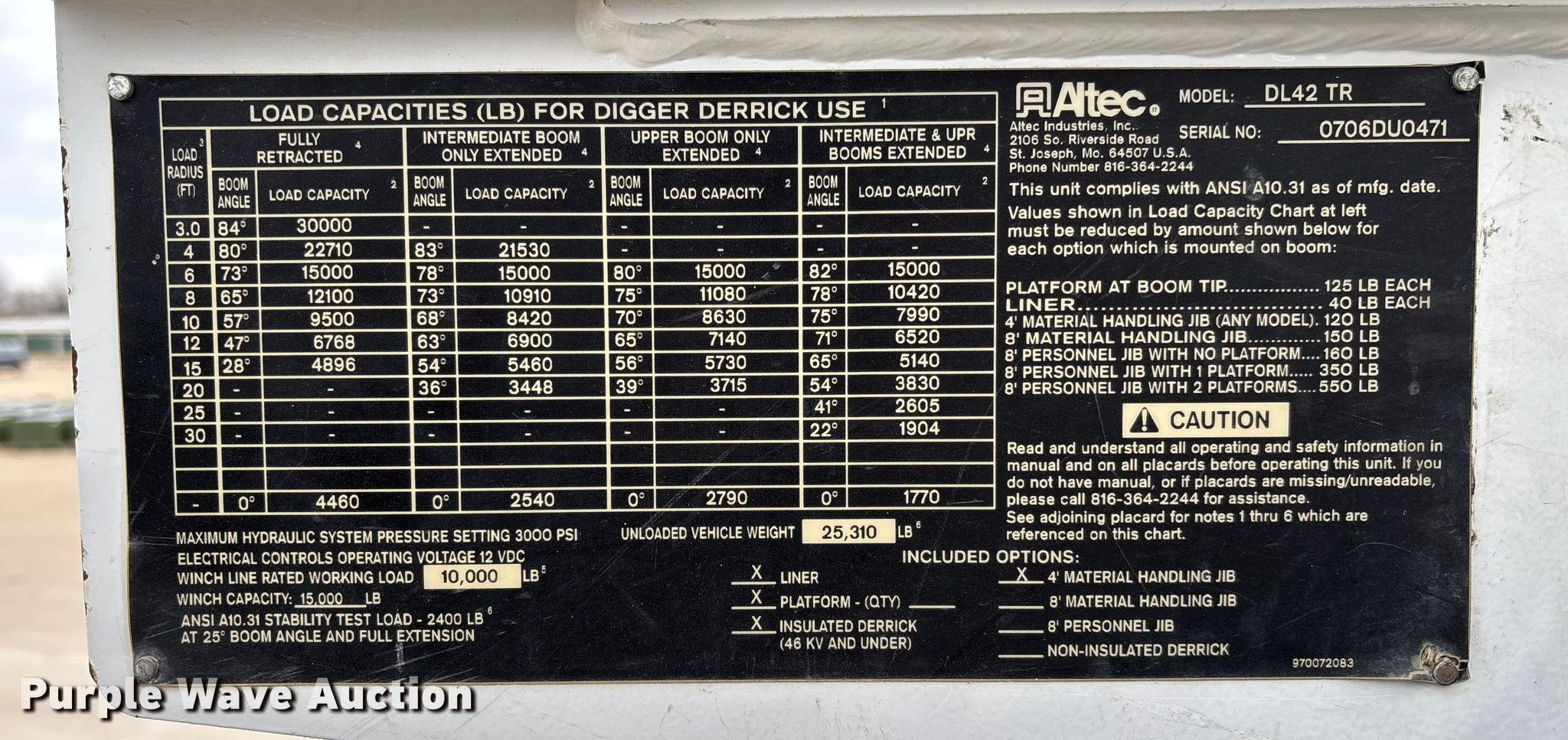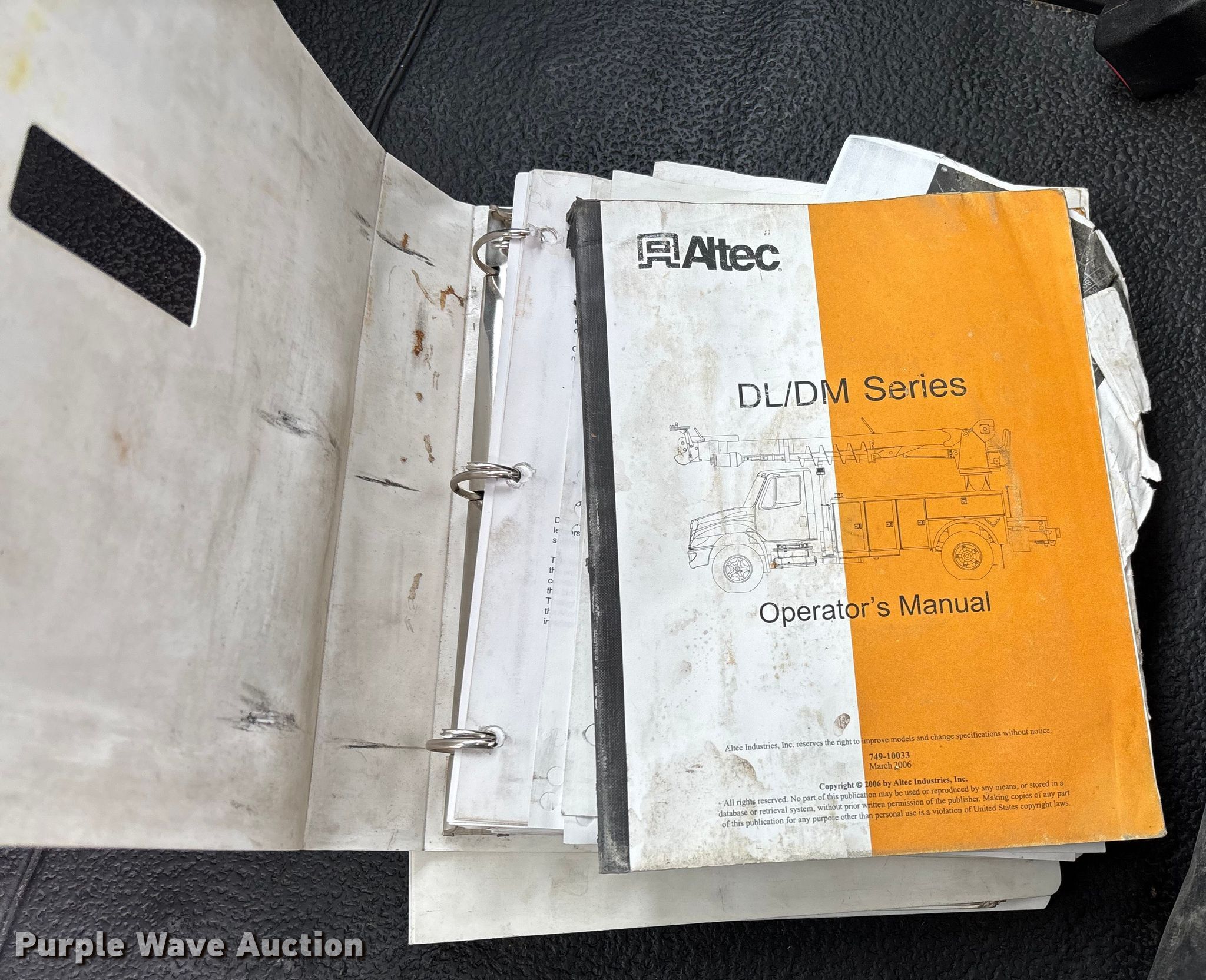 2007 International 4300 digger derrick truck. Miles: 137,179 on odometer, Hours: 11,272 on meter, Hours: 3,607 on second meter, VIN: 1HTMMAANX7H390819. Engine International DT466, Displacement: 7.64L, Cylinders: 6, Fuel type: Diesel. Transmission Automatic. Chassis Axles: Single, Suspension: Spring, Brakes: Air, PTO, GVWR: 33,000 lbs, Wheelbase: 179". Interior AC, Heat, Cruise control, Auxiliary controls, Brake controller. Features Bed Utility bed, Altec, Serial: 37-5579662, Length: 9' 5", Width: 8', Boom Altec DL42TR, Serial: 0706DU0471, Maximum lift capacity: 30,000 lbs, Maximum lift height: 42', Boom type: Insulated, Telescopic, Boom controls Platform, Material handler, Pole guide, Auger Diameter: 18".. Tires Front: 315/80R22.5, Rear: 11R22.5. Missouri title. Title distribution may be delayed up to 14 days from verification of funds. Consolidated Electric Cooperative. Mexico, MO 65265
