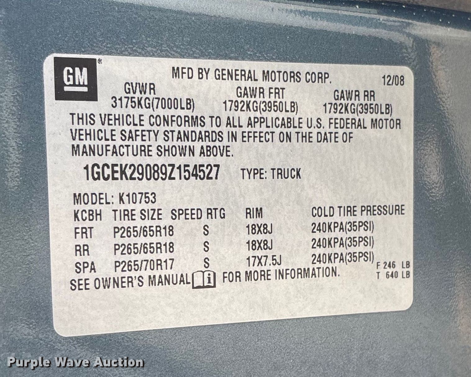 2009 Chevrolet Silverado 1500 Ext. Cab pickup truck. Miles: 259,796 on odometer, VIN: 1GCEK29089Z154527. Engine Displacement: 5.3L, Cylinders: 8. Transmission Automatic, Four wheel drive. Interior AC, Heat, Seat: Power driver, Power windows, Power locks, Cruise control. Features Bed Length: 6' 6", Delta 74 gallon fuel tank Hose and nozzle. Tires Size: 275/65R18. Notes Dash warning indicator: Check engine, Traction control, Non-operational RPM gauge, Front fender damage, Seat cover damage, Window control issues, clip issues. Missouri title. Title distribution may be delayed up to 30 days from verification of funds. Remsel Corp.. Columbia, MO 65202