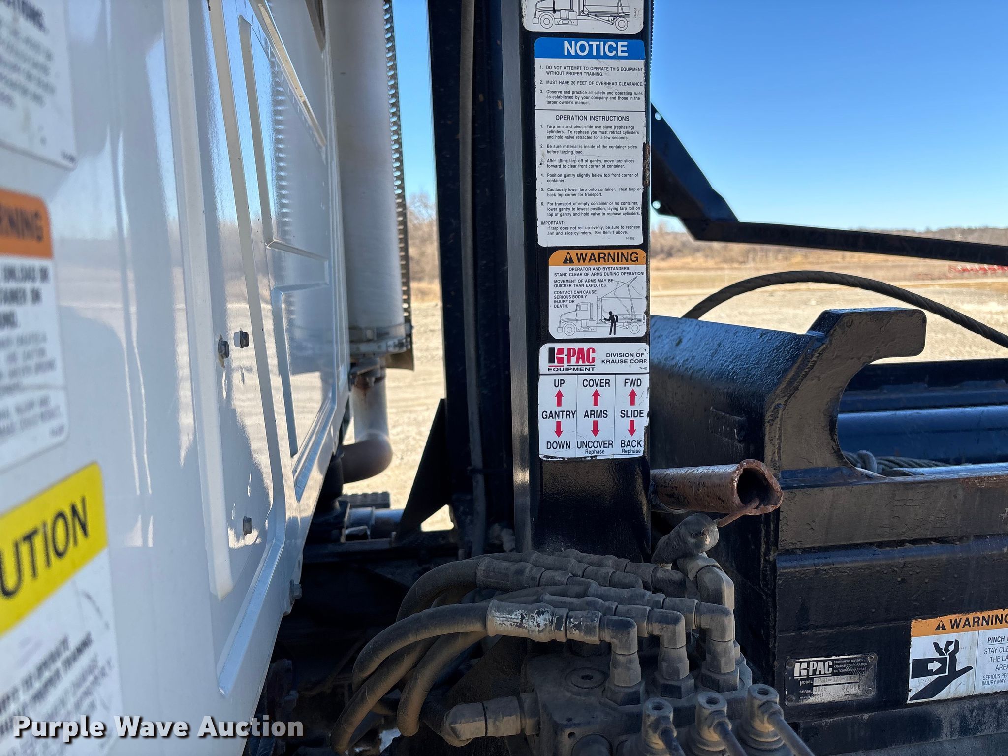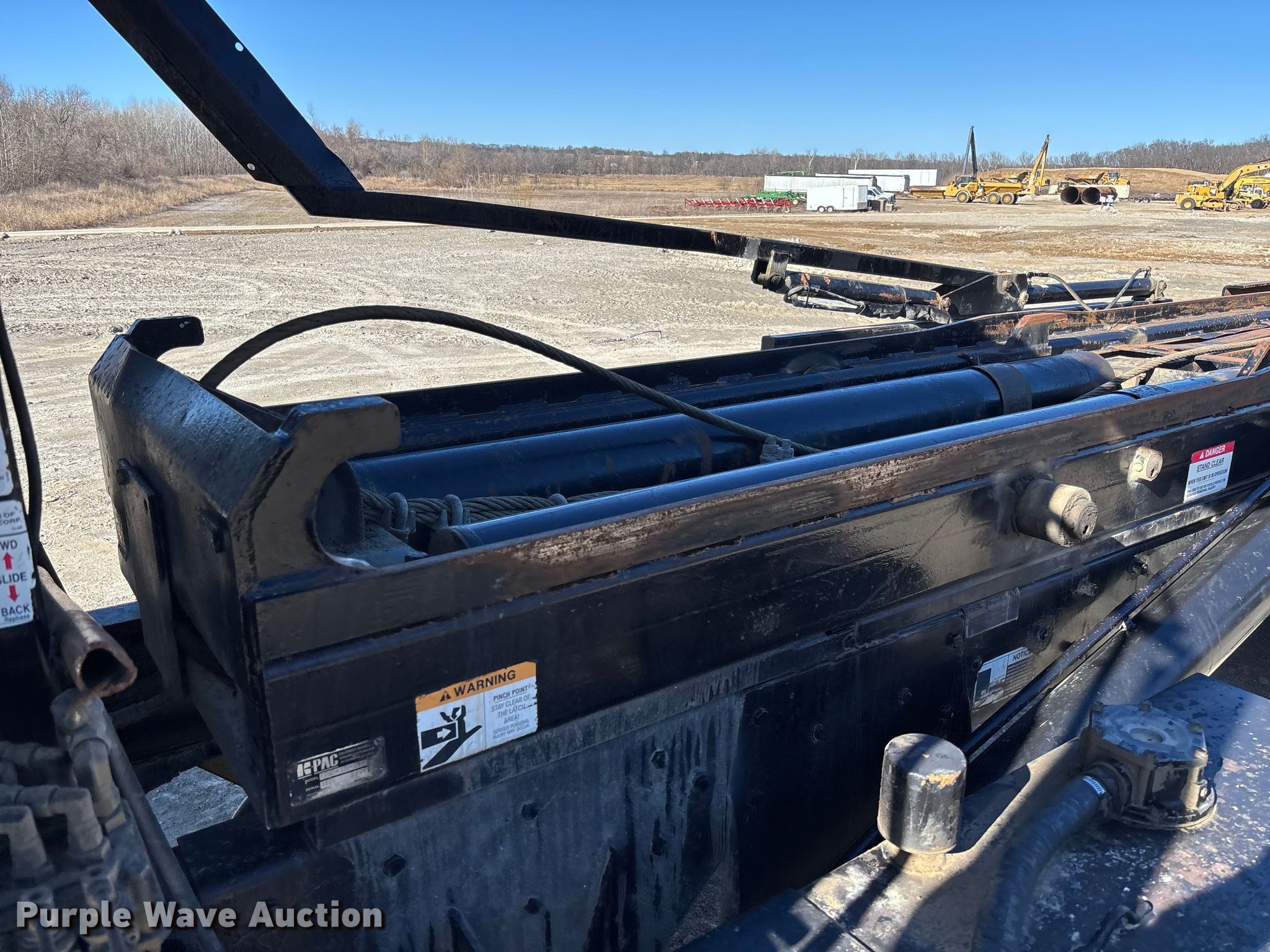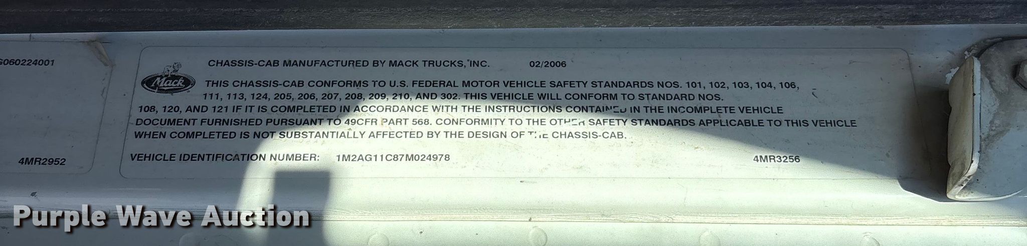 2007 Mack CV713 roll-off container truck. Miles: 573,748 on odometer, Hours: 31,409 on meter, VIN: 1M2AG11C87M024978. Engine Mack AMI, Displacement: 12.0L, Cylinders: 6, Fuel type: Diesel, HP: 370. Transmission Mack, Manual. Chassis Axles: Tandem, Suspension: Camelback, Brakes: Air, PTO, Wheelbase: 264". Interior AC, Heat, Cruise control. Features Bed Roll-off bed, K-PAC KP60-174-10, Serial: 3826, Ram: Dual, Roll tarp, Winch, Rolling tailboard. Tires Front: 425/65R22.5, Rear: 11R22.5. Notes Windshield chipped or cracked. Missouri title. Title distribution may be delayed up to 30 days from verification of funds. Remsel Corp.. Columbia, MO 65202
