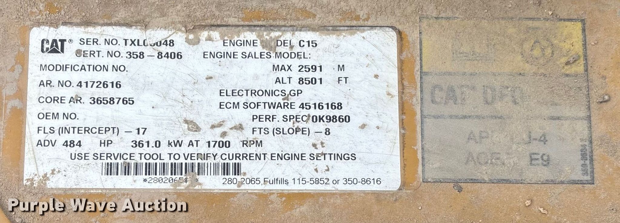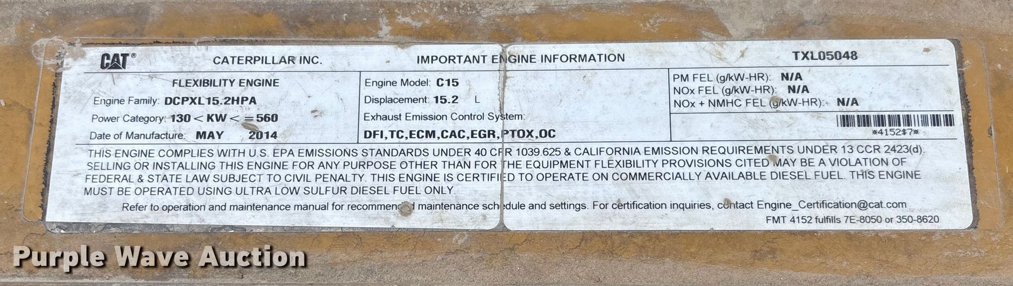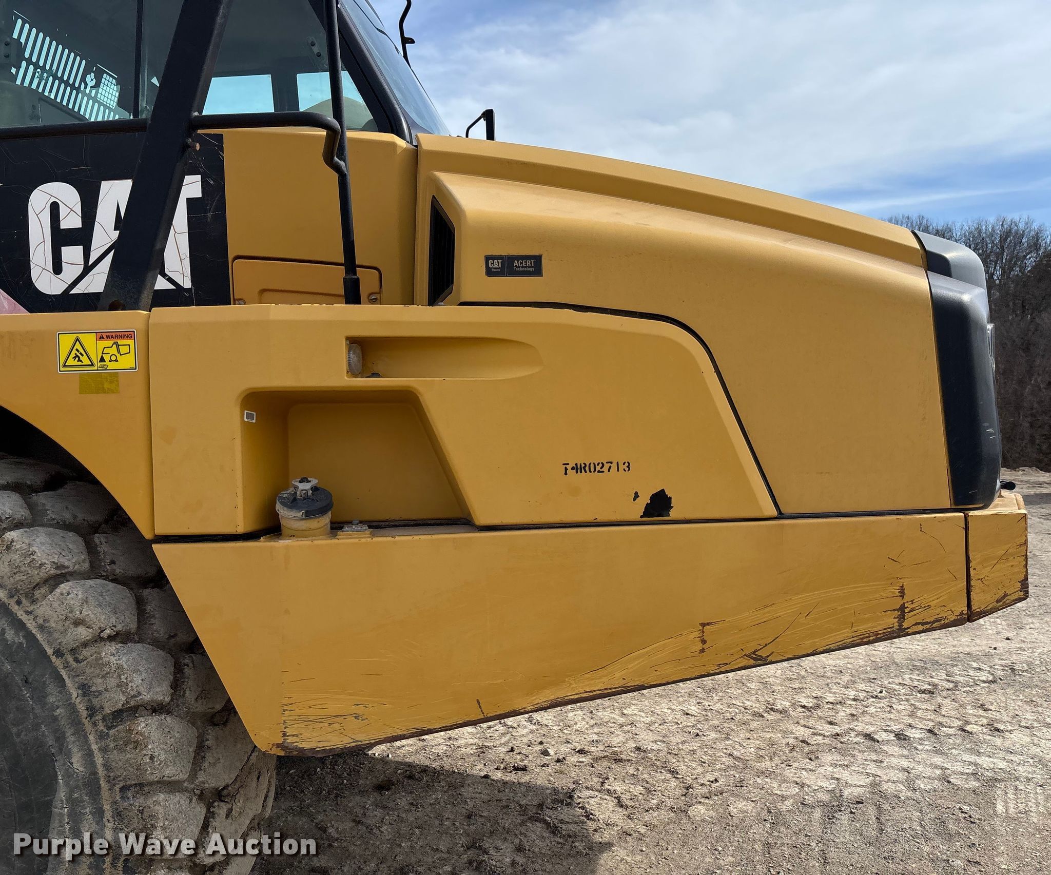 2014 Caterpillar 740B articulated haul truck. Hours: 13,437 on meter, Serial: CAT0740BTT4R02713. Engine Caterpillar C15, Serial: TXL05048, Displacement: 15.2L, Cylinders: 6, Fuel type: Diesel. Transmission Automatic. Chassis Six wheel drive. Interior AC, Heat, Backup camera. Tires Size: 29.5R25. Notes Steering cylinder leak, Hydraulic hose leak. Remsel Corp.. Columbia, MO 65202