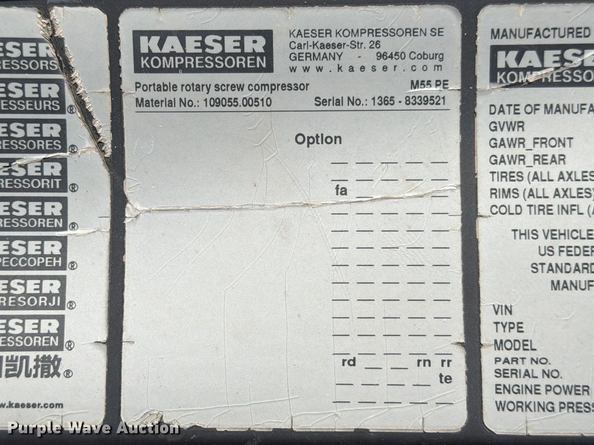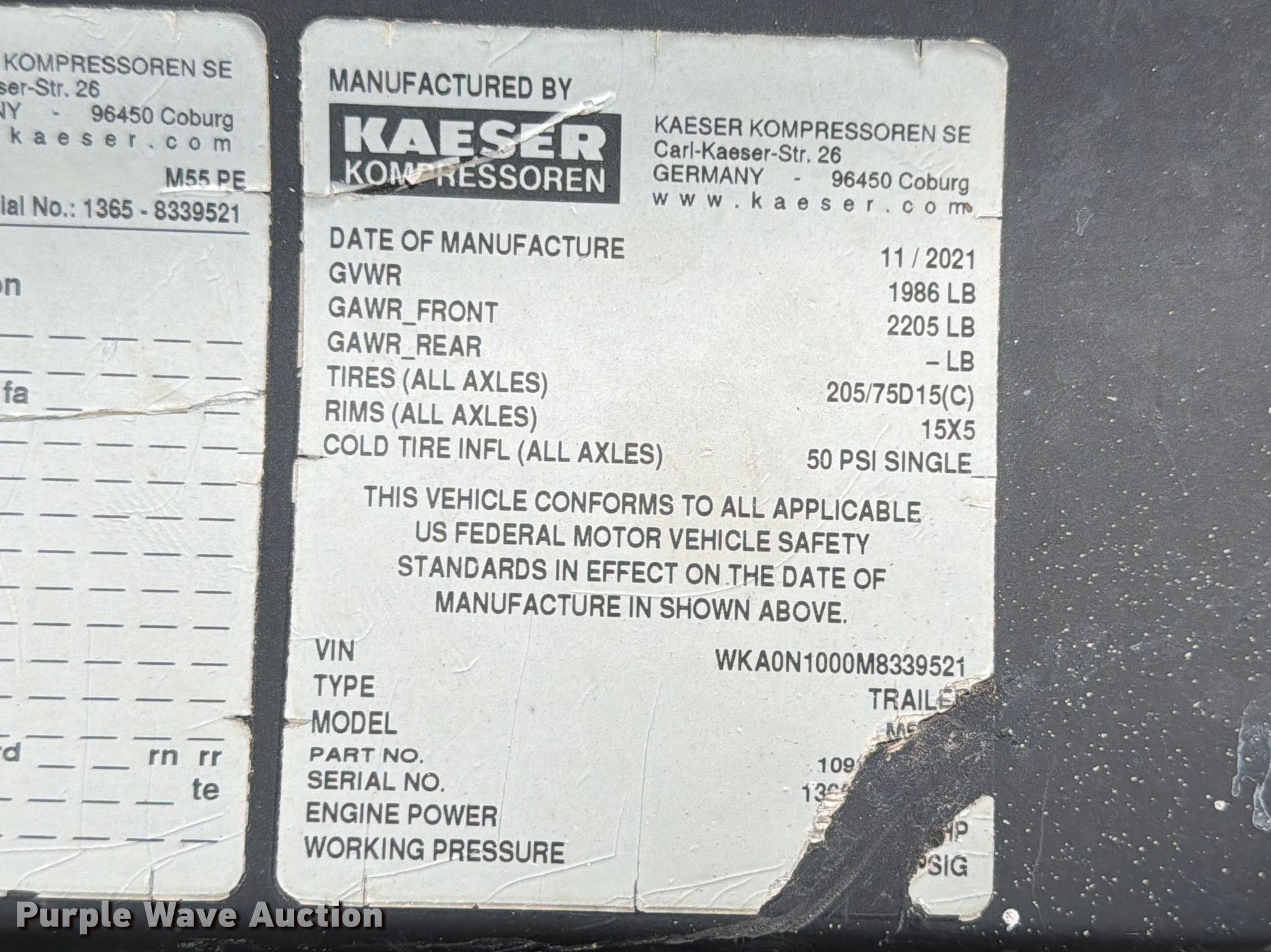 Purple Wave is selling a used Air Compressor in Texas. This item is a 2021 Kaeser M55 air compressor with the following: Hours: 500 on meter, VIN: WKA0N1000M8339521, Serial: 1365 - 8339521, Unit #: EQ0136833