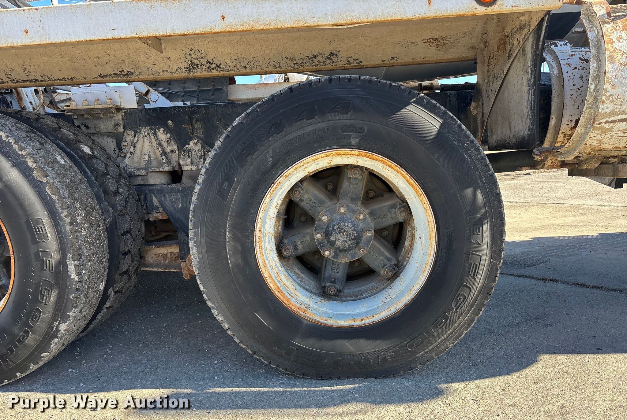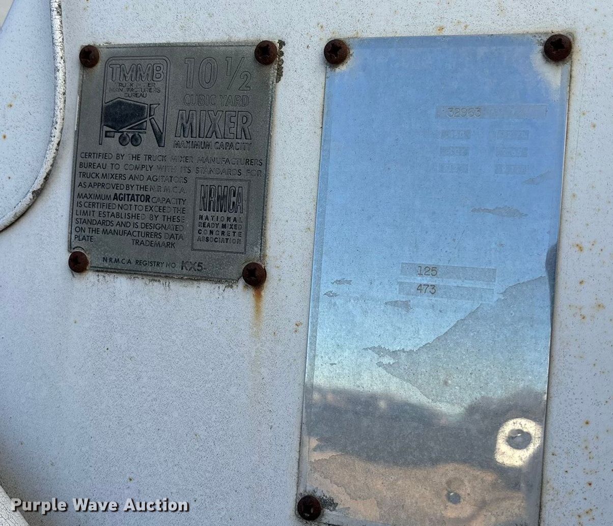 1994 International F-2574 ready mix truck. Miles: 165,420 on odometer, Hours: 18,123 on meter, VIN: 1HTGGAYT5RH552612. Engine Cummins L10-260, Serial: 34697949, Displacement: 10.0L, Cylinders: 6, Fuel type: Diesel. Transmission Eaton Fuller 7LL, Manual, Speed: 9. Chassis Double frame, Axles: Triple, Tag axle, Differential lock: Inter-axle, Brakes: Air, Front mount PTO, GVWR: 60,000 lbs. Interior Heat, Cruise control. Features Mixer Capacity: 10.5 cu. yd., TMMB, Serial: 32963, Discharge: Rear, In-cab controls, Rear drum controls, Chute Extensions: 3, Chute type: Steel.. Tires Front: 425 65 R22.5, Rear: 11 R 22.5, Lift axle: 10 R17.5. Notes No batteries, Chute issues, stuck, Jump start required during on-site data collection. Kansas title. Title distribution may be delayed up to 14 days from verification of funds. Meier Industries LLC. Topeka, KS 66608