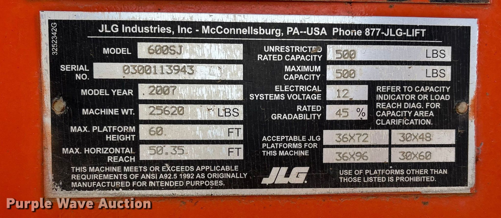 Purple Wave is selling a used Boom Lift in Missouri. This item is a 2007 JLG 600 SK boom lift with the following: Hours: 8,017 on meter, Serial: 0300113943