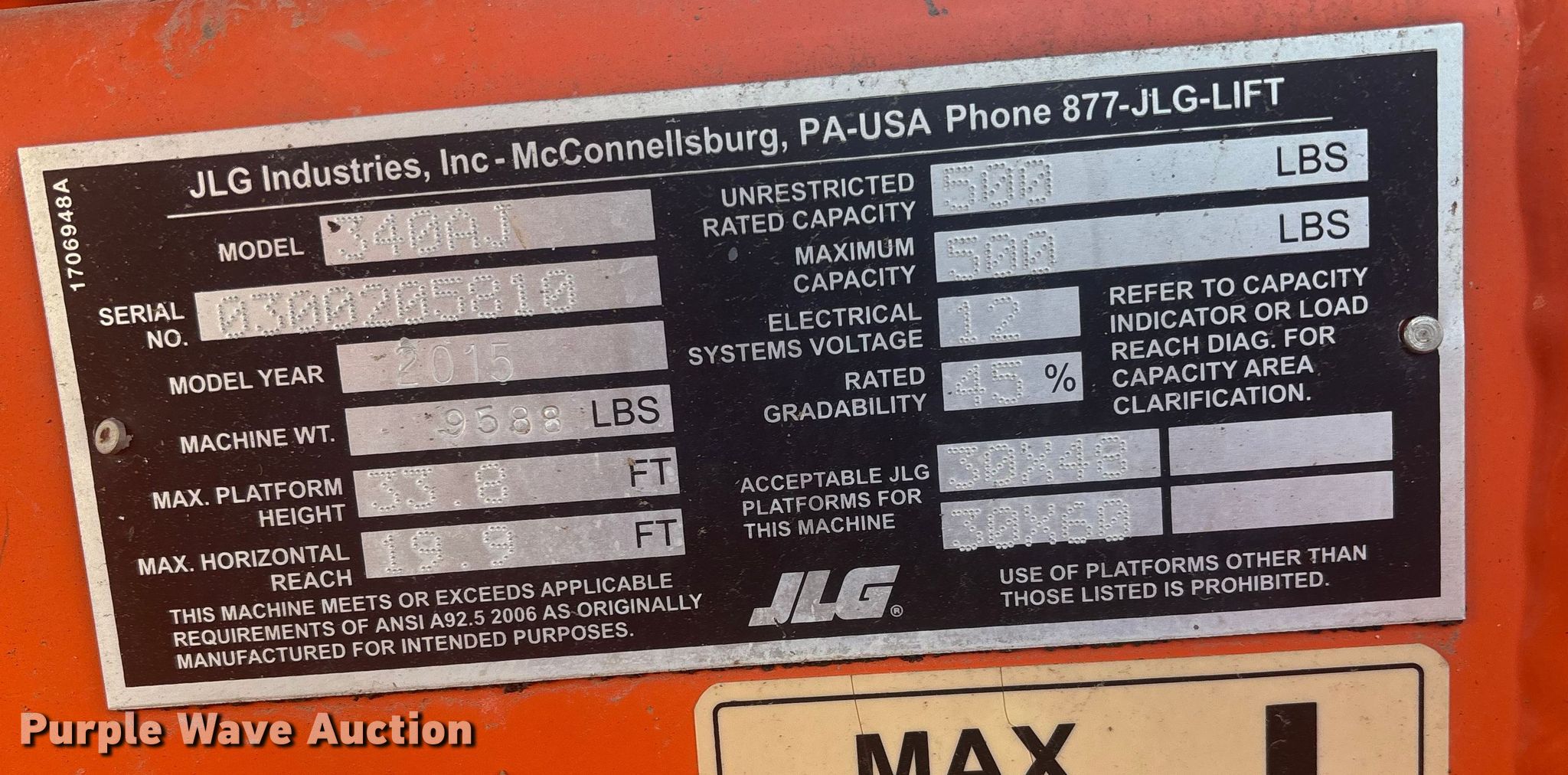 Purple Wave is selling a used Boom Lift in Missouri. This item is a 2015 JLG 340AJ boom lift with the following: Hours: 1,165 on meter, Serial: 0300205810