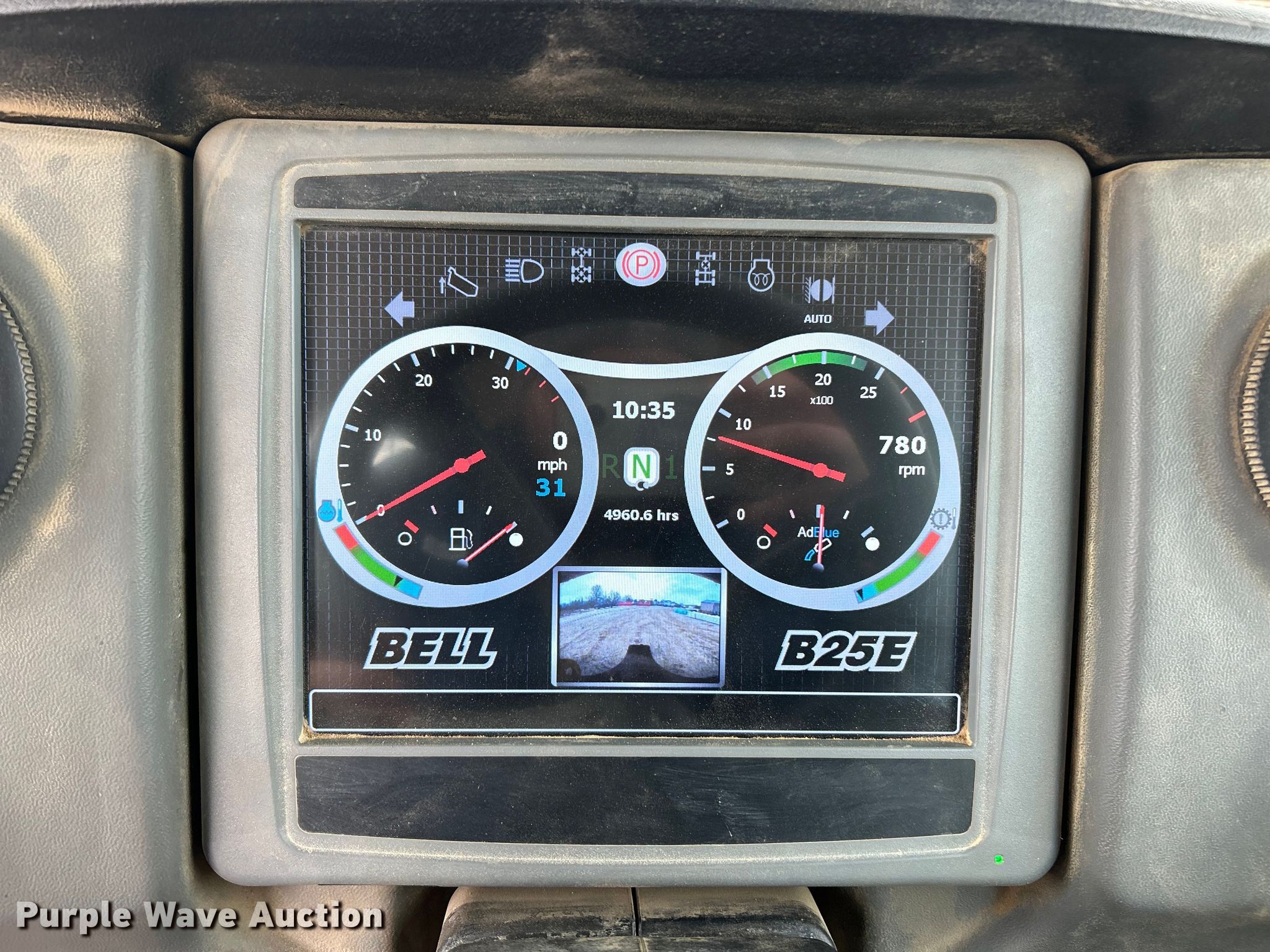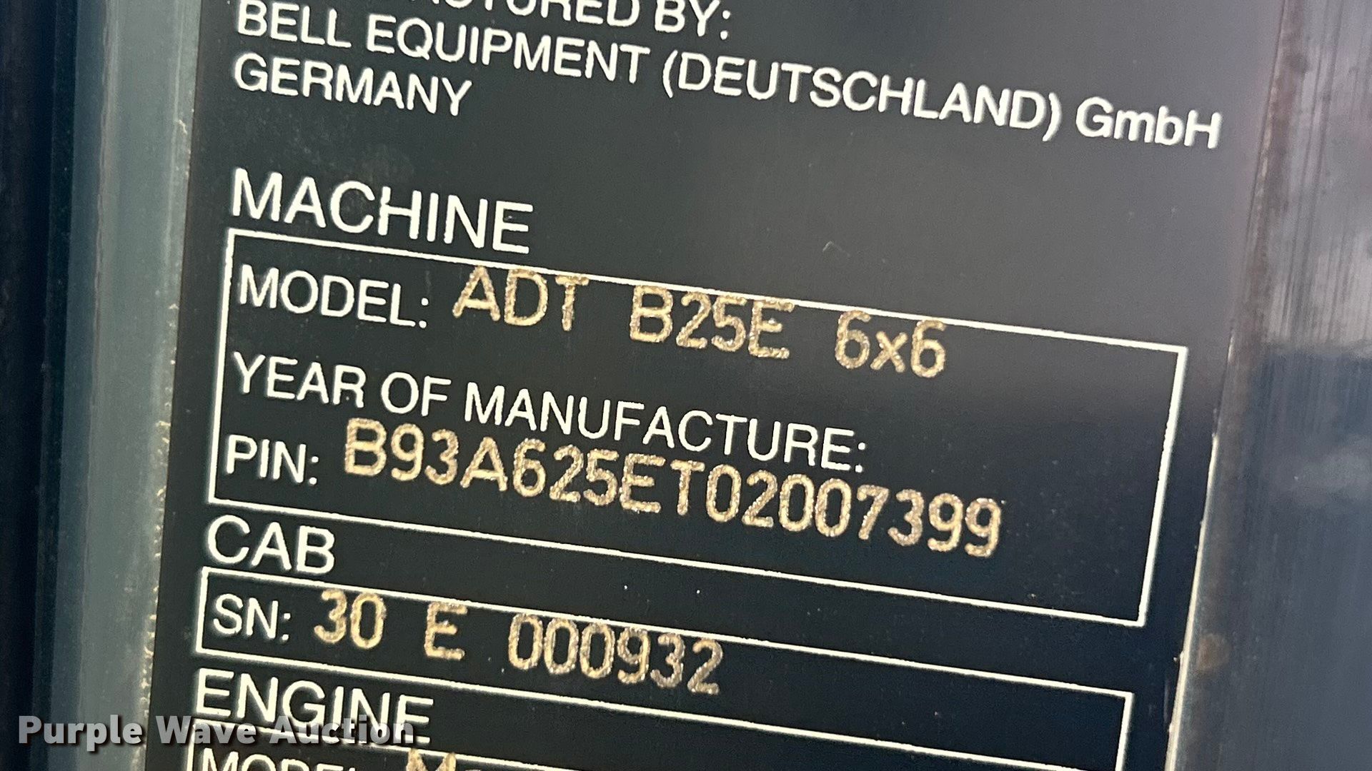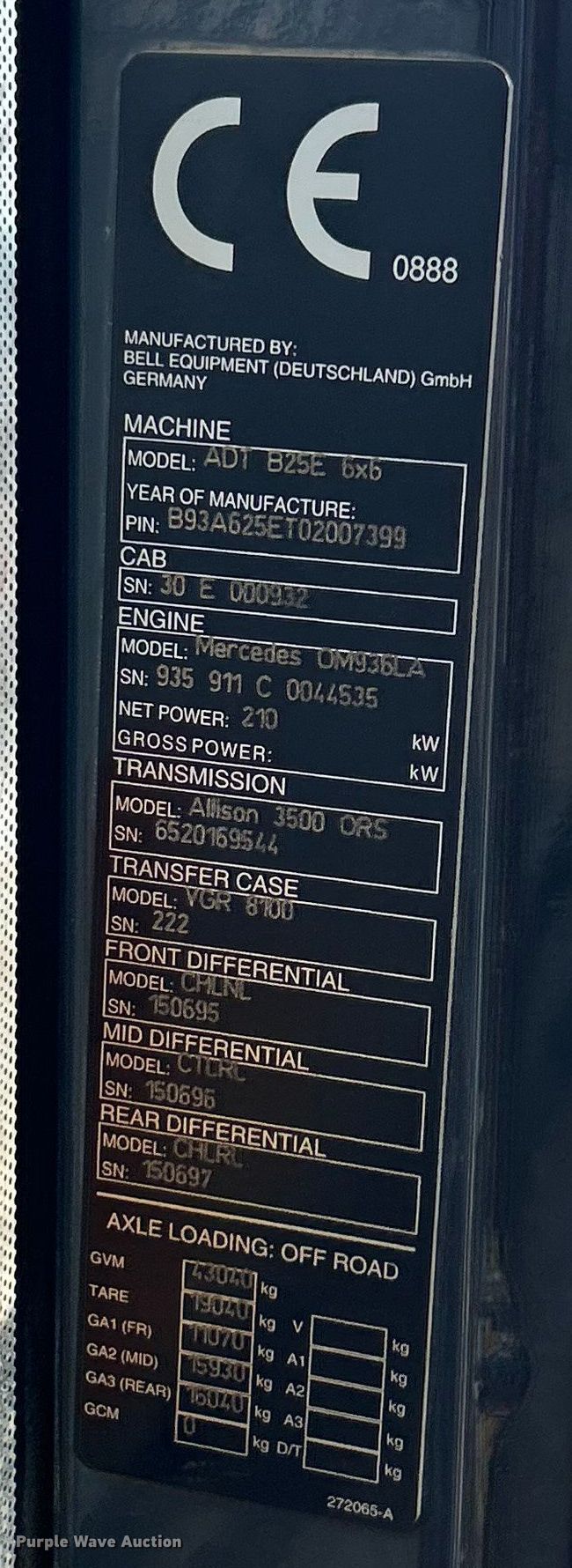 Bell B25E articulated haul truck. Hours: 4,960 on meter, Serial: B93A625ET02007399. Engine Mercedes-Benz OM936LA, Serial: 935911C0044535, Displacement: 7.7L, Cylinders: 6, Fuel type: Diesel. Transmission Allison 3500 ORS, Automatic. Chassis Six wheel drive. Interior AC, Heat, Backup camera. Features Dump bed Bell, Capacity: 25 tons. Tires Size: 23.5R25. M Turpin Services LLC. Foristell, MO 63348