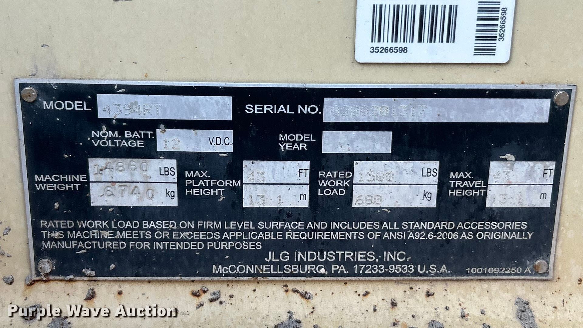 Take a look at this used 2011 JLG 4394RT scissor lift being sold on March 26th, 2026 in the Thursday March 26 Construction Equipment Auction made by JLG. Take a look at all of the item information below or take a look at similar auctions for Aerial Lifts.