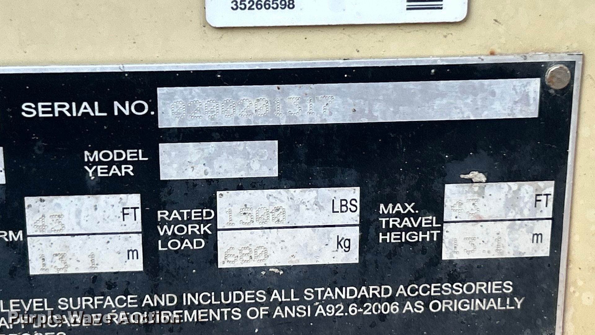 2011 JLG 4394RT scissor lift. Hours: 3,364 on meter, Serial: 0200201317. Engine Cylinders: 4, Fuel type: Dual fuel. Features Rough terrain, Maximum lift capacity: 1,500 lbs, Maximum lift height: 43', Platform: 154" L x 81" W, AC power outlet, Controls: Platform, Ground, Platform extensions: Manual. Tires Tire size: 33x15.50-16.5, Foam filled. Big Boy's Steel Erection. Hazelwood, MO 63042