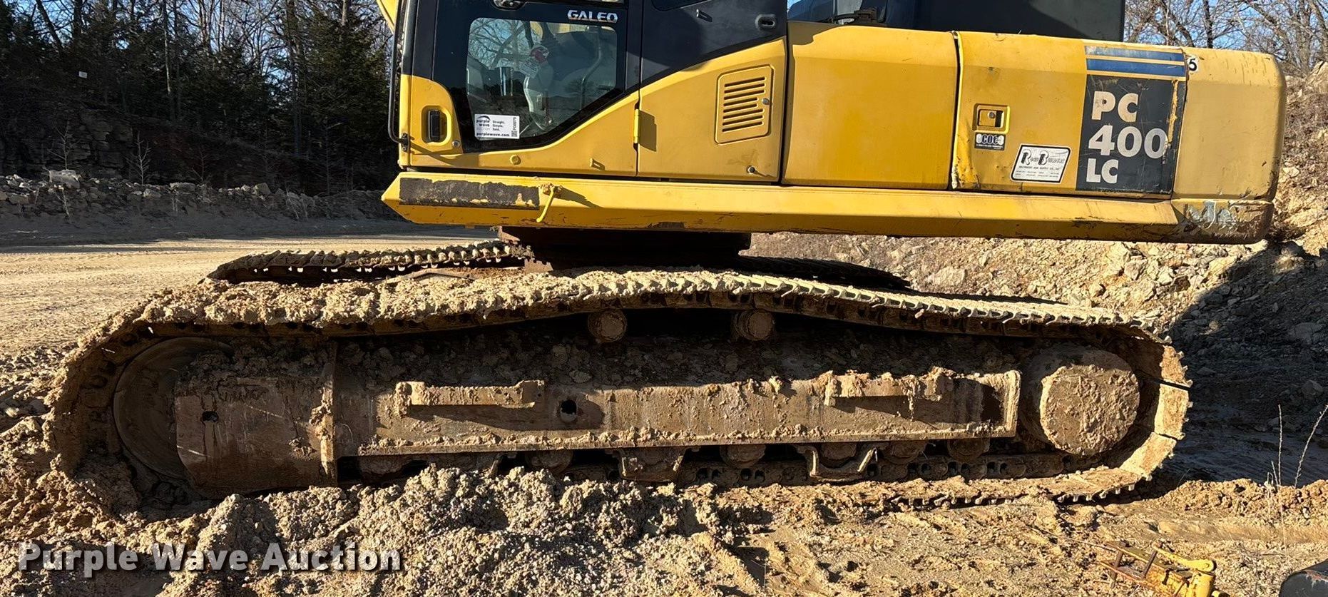 2006 Komatsu PC400LC-7E0 excavator. Last recoded hours: 13,911 hours, Serial: KMTPC184C54A87267. Engine Komatsu, Cylinders: 6, Fuel type: Diesel. Transmission Hydrostatic. Operators station Enclosed cab, AC, Heat, Pattern changer. Features Auxiliary hydraulics, Boom Standard, Stick Stick length: 13' 1", Bucket WB, Width: 63", Teeth: 6. Tracks Width: 35.5", Steel, Grouser pads: Triple. Notes Hour meter illumination issues, Contents not included, Radio not included, Engine oil leak. Buyer responsible for all aspects of removal. Mid-States Materials. Strafford, MO 65757
