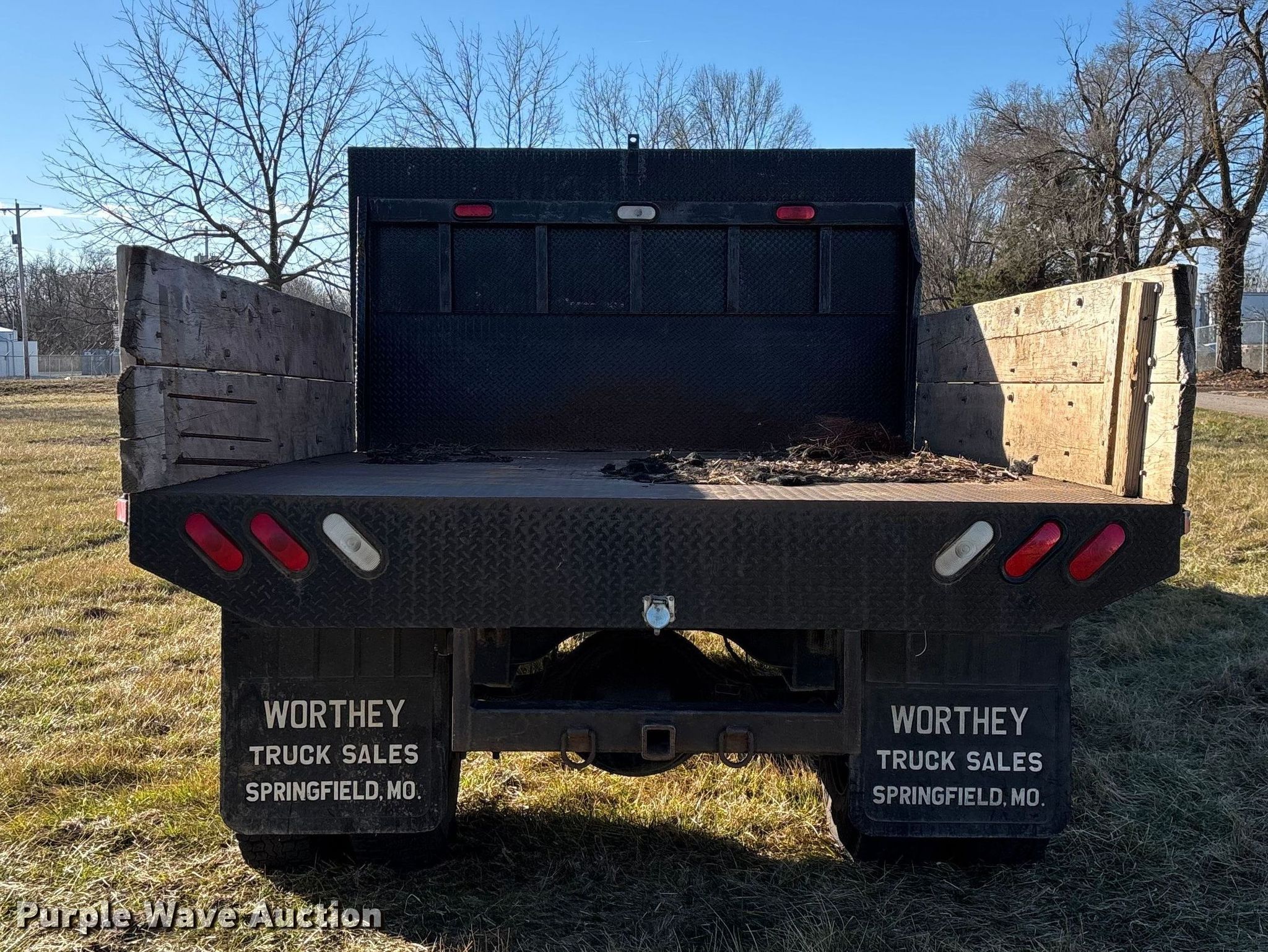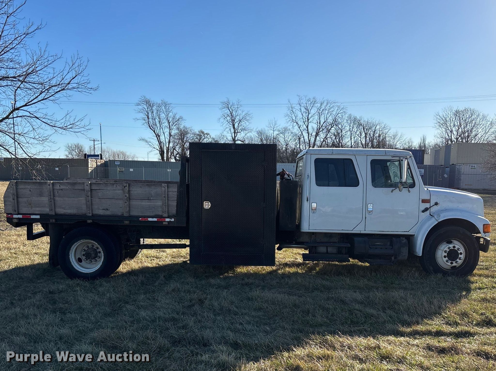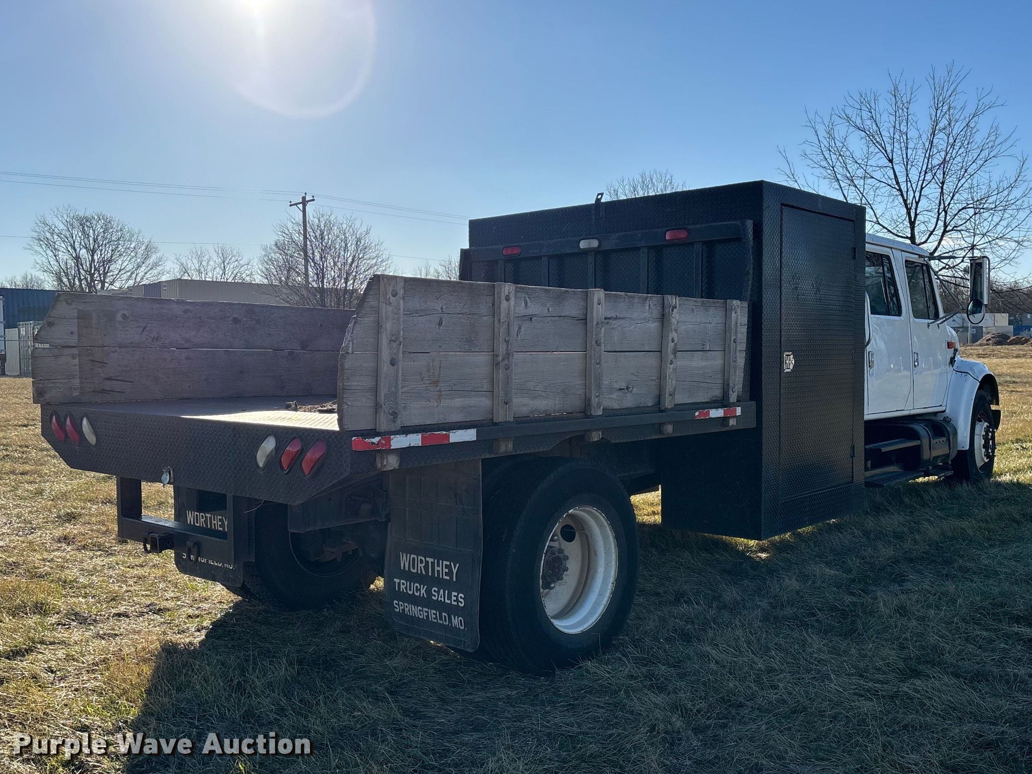 This 2001 International 4700 flatbed truck will sell to the highest bidder regardless of price.