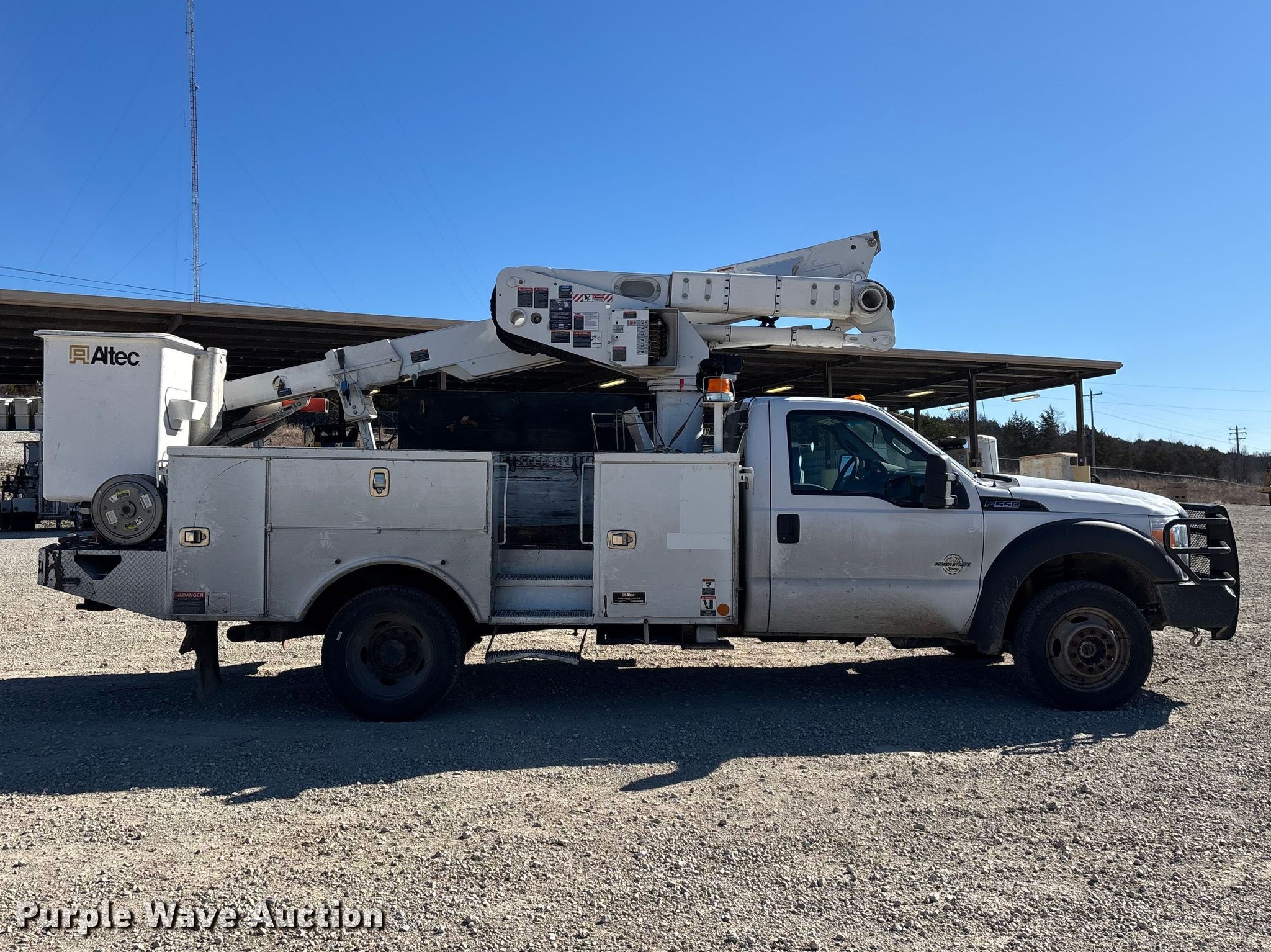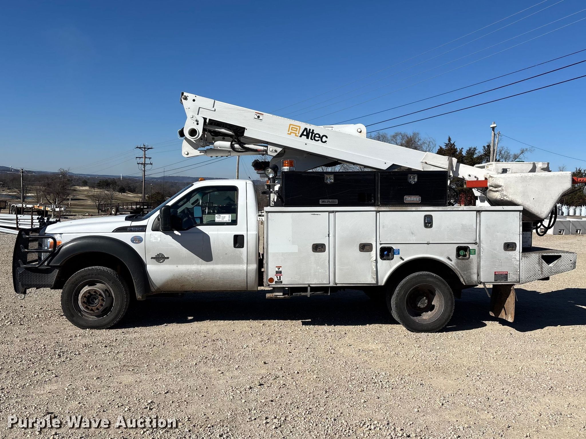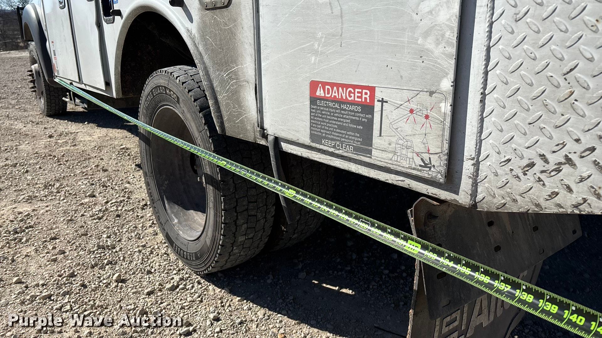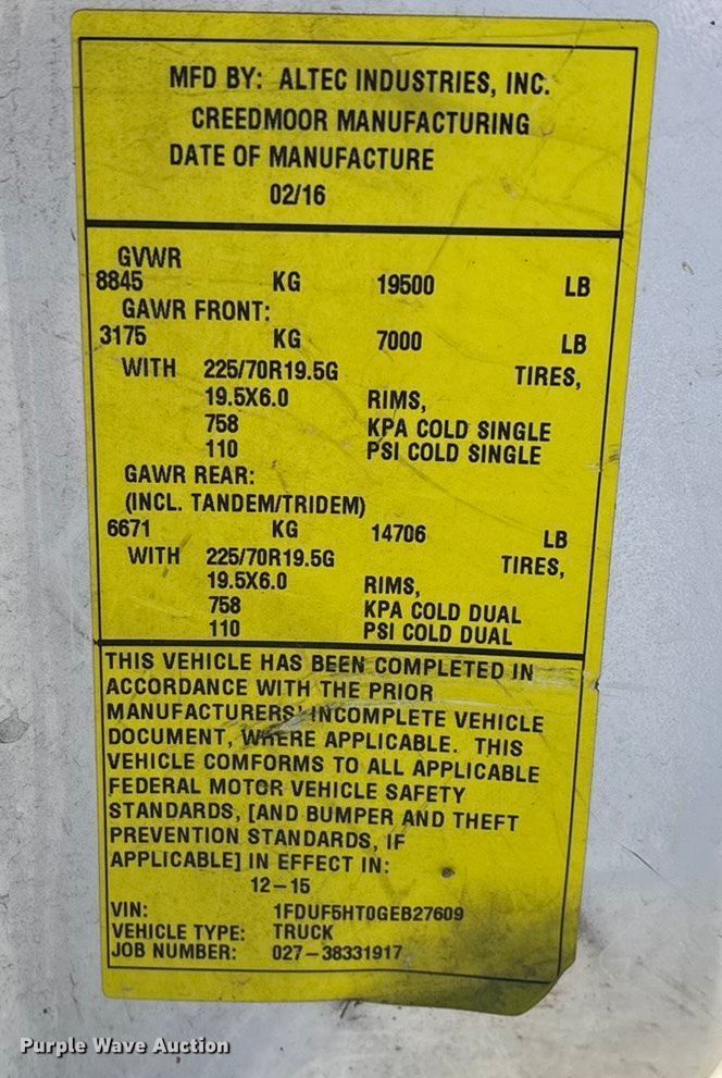 2016 Ford F550 bucket truck. Miles: 199,335 on odometer, VIN: 1FDUF5HT0GEB27609. Engine Displacement: 6.7L, Cylinders: 8, Fuel type: Diesel. Transmission Automatic. Chassis Four wheel drive, Axles: Single, Suspension: Spring, Brakes: Hydraulic, PTO, GVWR: 19,500 lbs. Interior AC, Heat, Cruise control, Auxiliary controls. Features Bed Altec, Serial: 27 38331917 2-16, Length: 13' 5", Width: 94", Height: 58", Boom Altec AT40M, Serial: 0166CZ00478, Boom length: 17' 6", Maximum lift capacity: 400 lbs, Maximum lift height: 40', Boom type: Articulating, Insulated, Telescopic, Man basket, Boom controls Lower, Basket, Material handler. Tires Size: 225/70R19.5. Notes Contents not included, Front drivers side tire, side wall damaged, Non-operational winch, possible blown fuse. Missouri title. Title distribution may be delayed up to 14 days from verification of funds. White River Valley Electric Cooperative. Branson, MO 65616