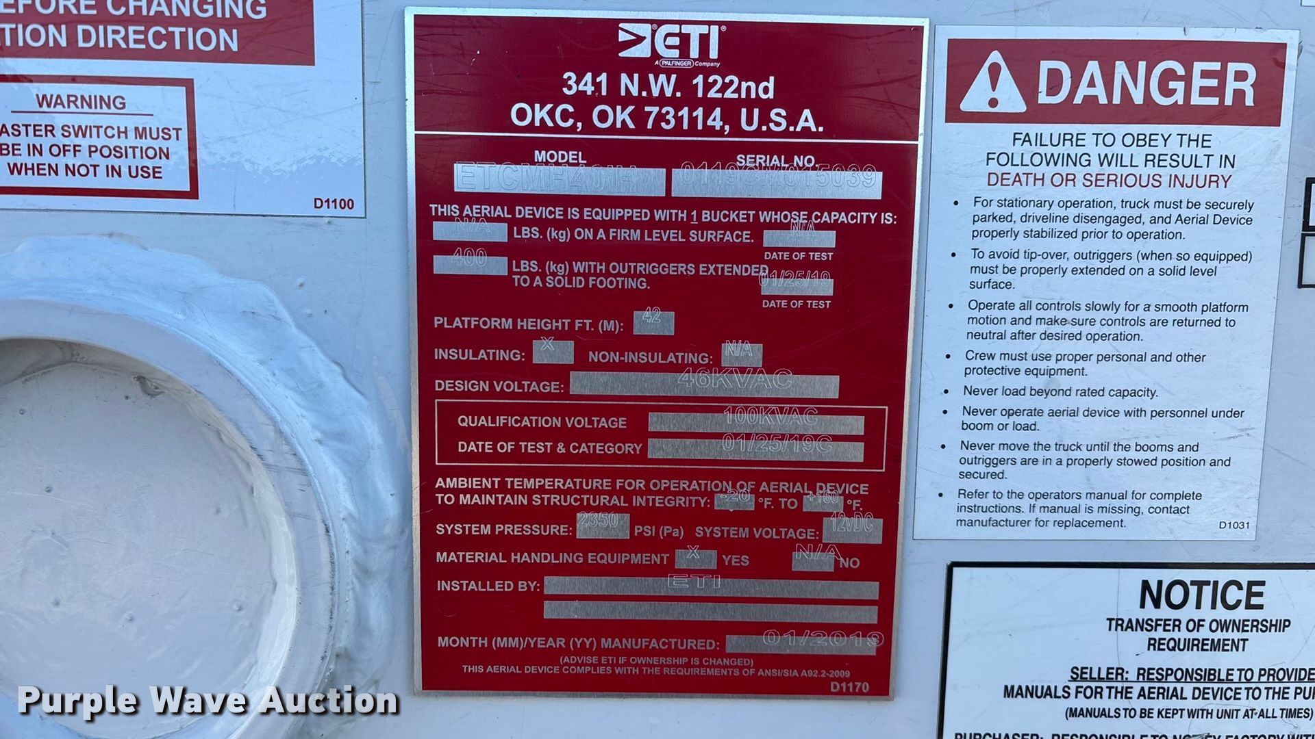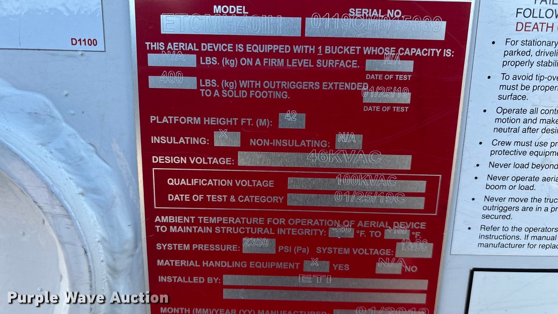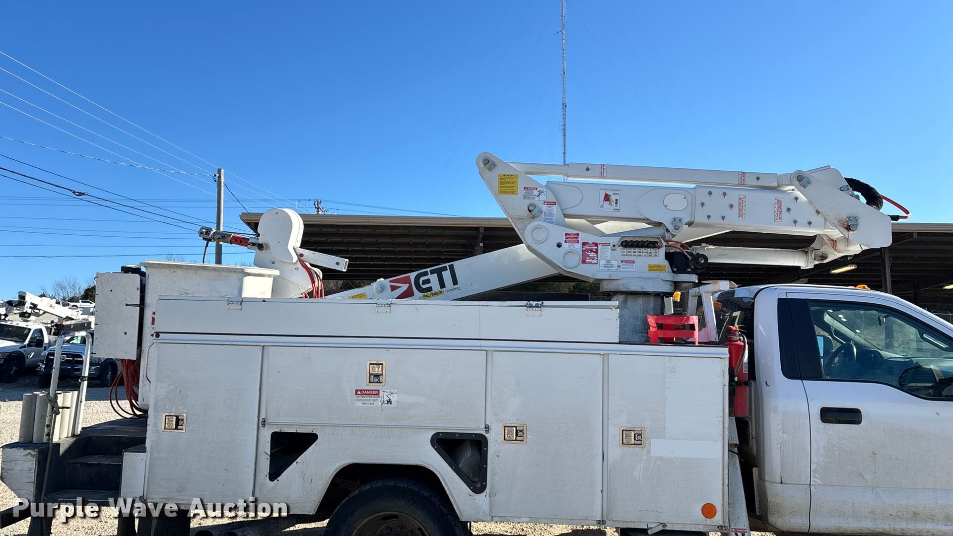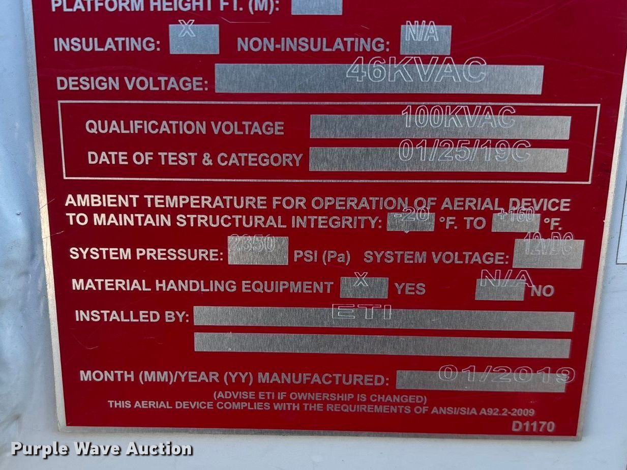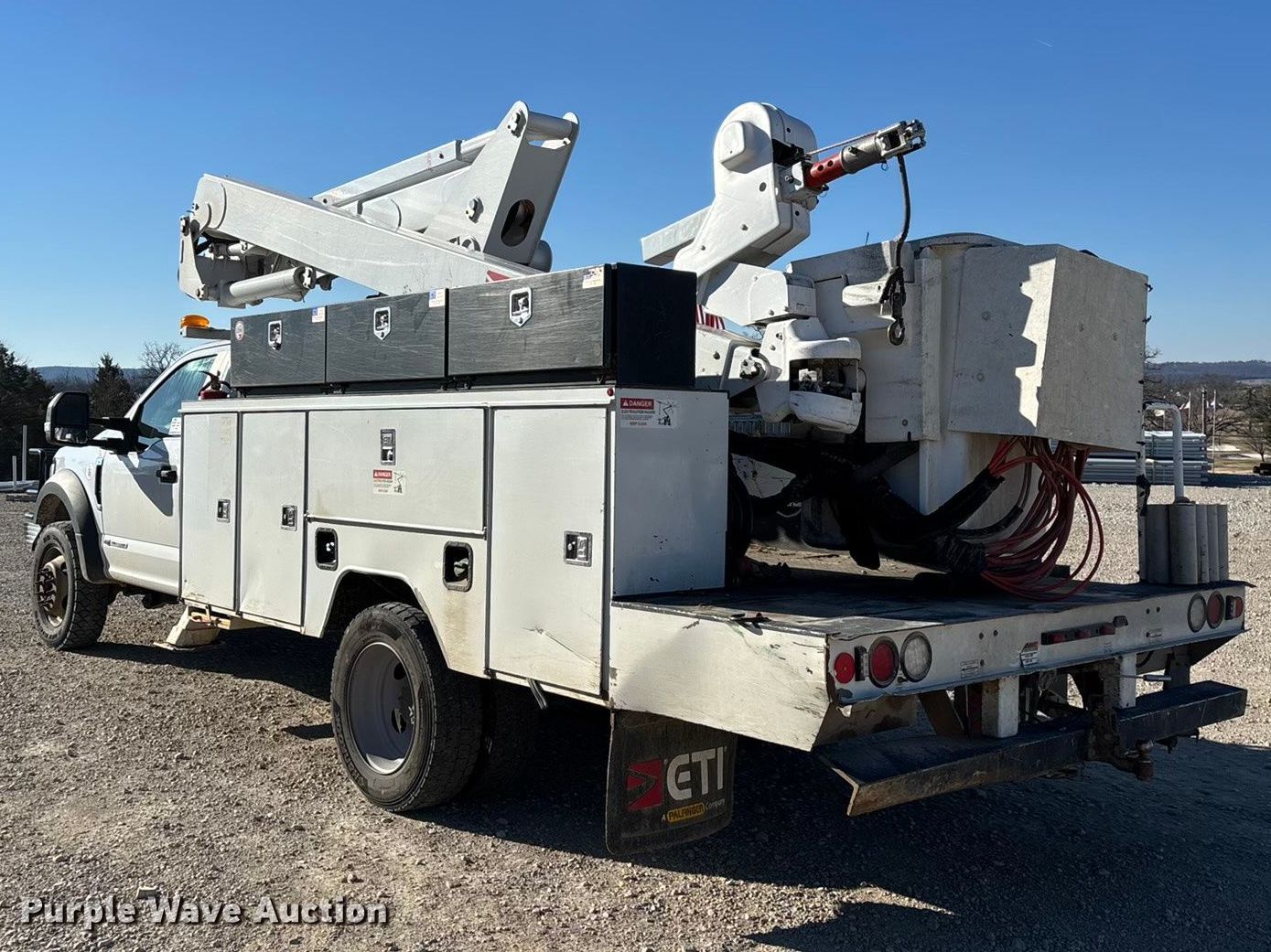 2019 Ford F550 bucket truck. Miles: 160,989 on odometer, Hours: 7,556 on meter, VIN: 1FDUF5HT5KDA06265. Engine Displacement: 6.7L, Cylinders: 8, Fuel type: Diesel. Transmission Automatic. Chassis Four wheel drive, Axles: Single, Suspension: Spring, Brakes: Hydraulic, PTO, GVWR: 19,500 lbs. Interior AC, Heat, Heated mirrors, Power windows, Power locks, Auxiliary controls, Brake controller. Features Bed ETI SB132DD96B36AG0E, Serial: FB21616, Length: 14', Width: 96", Height: 55", Boom ETI ETCMH40IH, Serial: 0119CM015039, Boom length: 15', Maximum lift capacity: 400 lbs, Maximum lift height: 42', Boom type: Articulating, Insulated, Telescopic, Boom controls Lower, Basket, Material handler. Tires Size: 245/70R19.5. Notes Contents not included, Winch control cable missing, Possible turbo issues, may need replaced. Missouri title. Title distribution may be delayed up to 14 days from verification of funds. White River Valley Electric Cooperative. Branson, MO 65616