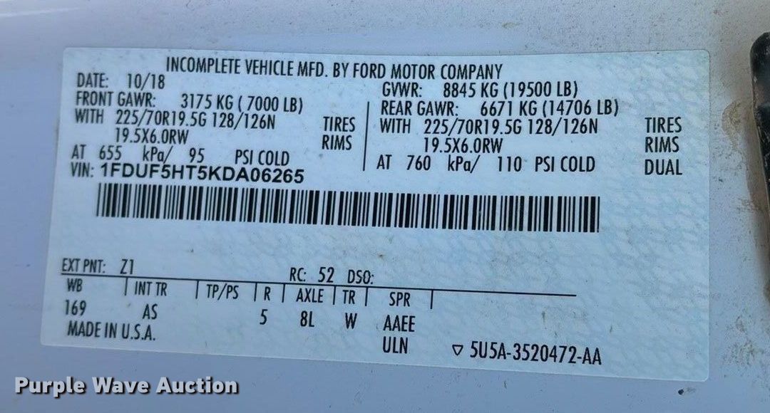 Purple Wave is selling a used Bucket Truck in Missouri. This item is a 2019 Ford F550 bucket truck with the following: Miles: 160,989 on odometer, Hours: 7,556 on meter, VIN: 1FDUF5HT5KDA06265