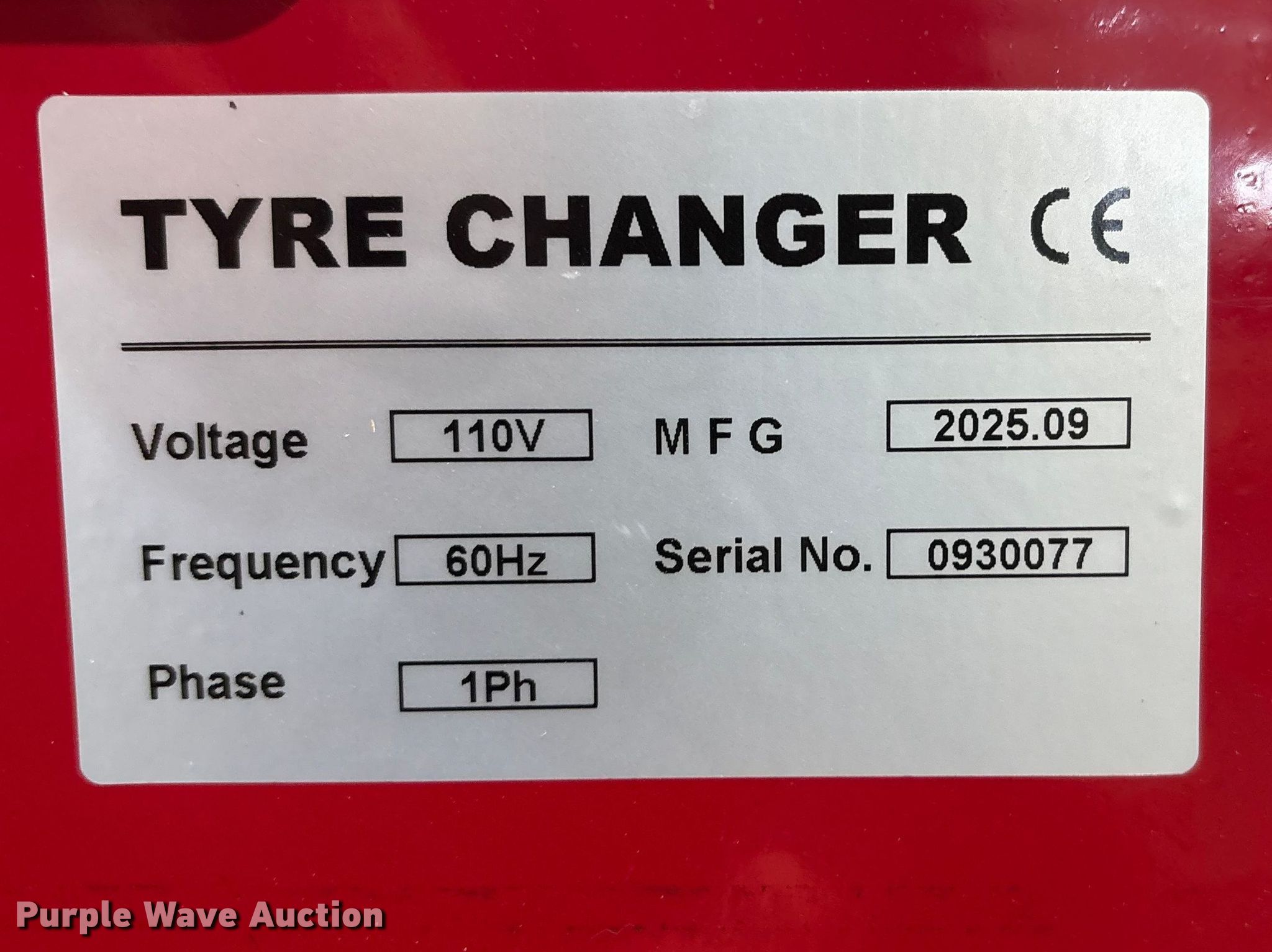 Purple Wave is selling a used Tools in Nebraska. This item is a 2025 Tyre Changer tire machine with the following: Serial: 0930077, Length: 34", Width: 26", Height: 67", Volts: 110, Phase: 1, Hertz: 60