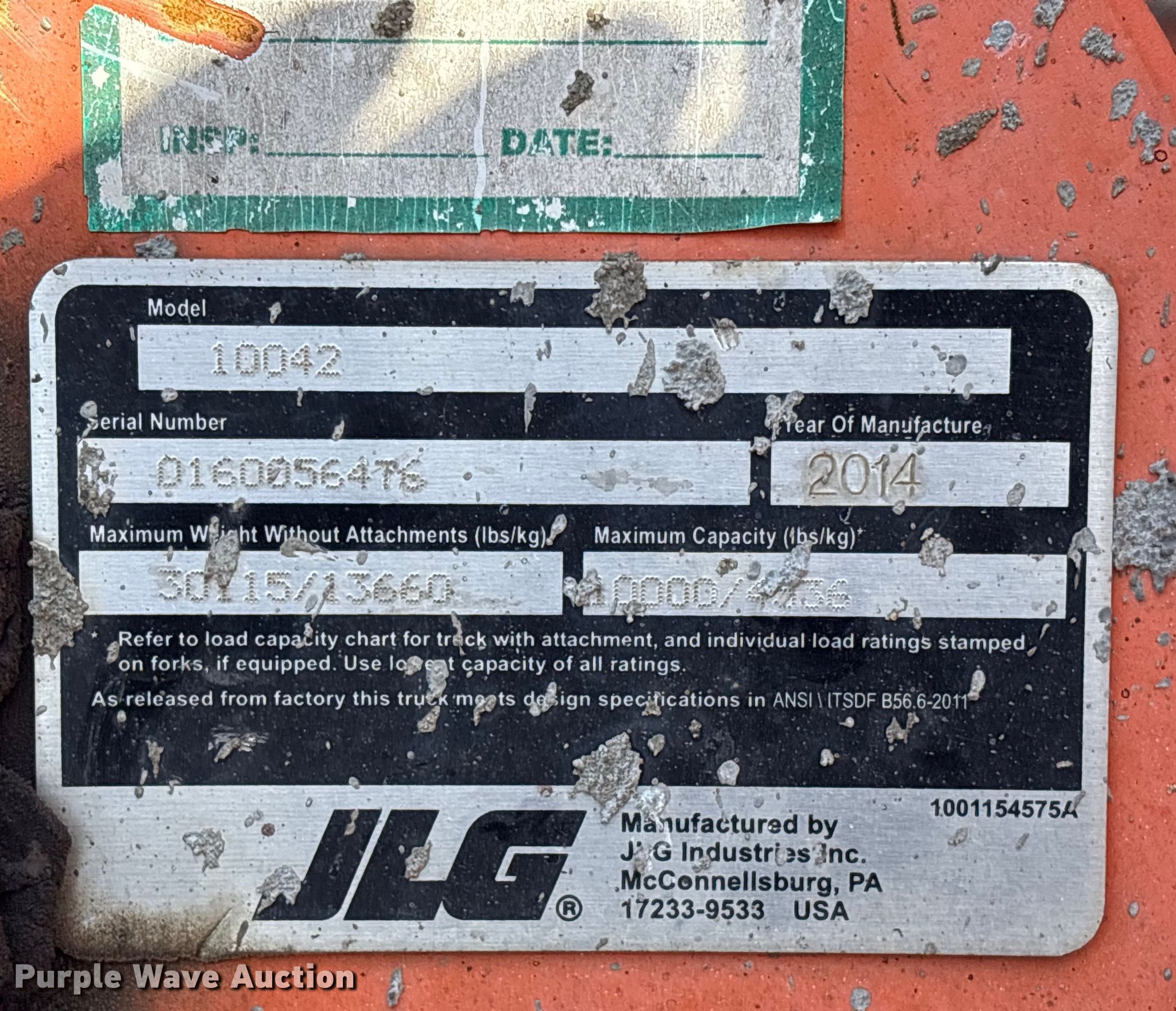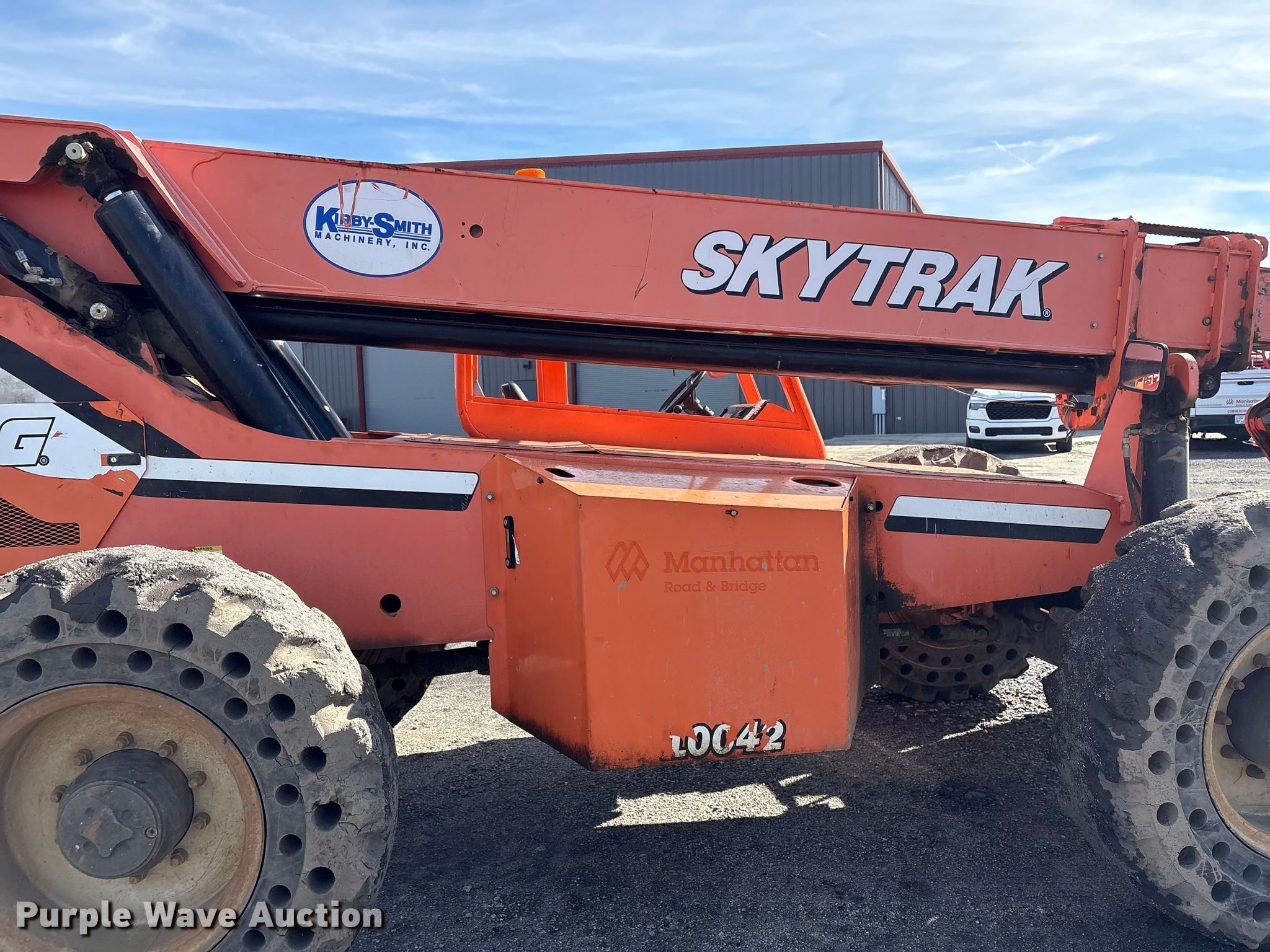 2014 JLG Skytrak 10042 telehandler. Hours: Unknown, Serial: 0160056476, Unit #: 80-191. Engine Cummins QSB3.3, Serial: 68608243, Displacement: 3.26L, Cylinders: 4, Fuel type: Diesel. Transmission Powershift, 4F - 3R, Four wheel drive. Operators station OROPS, Canopy, Steering: Crab, Four wheel. Features Maximum lift capacity: 10,000 lbs, Maximum lift height: 42', Boom stages: 3, Fork length: 48", Hydraulic outriggers, Hydraulic leveling, Quick attach: Manual. Tires Size: 14.00-24, Solid. Notes Non-operational gauge cluster, Engine issues, requires either to start. Manhattan Road & Bridge. North Little Rock , AR 72117