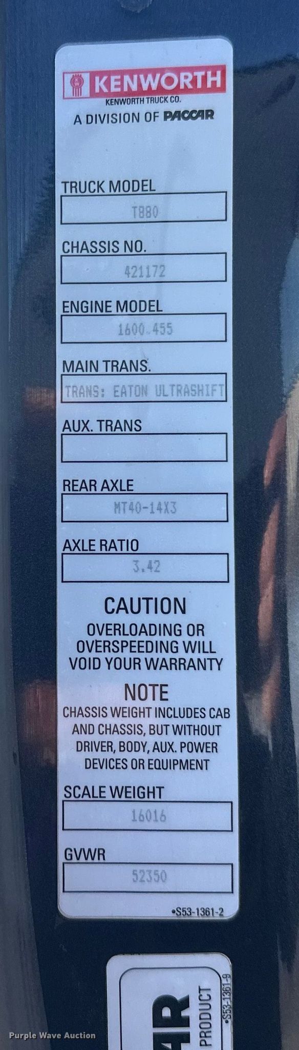 2020 Kenworth T880 flatbed truck. Miles: 321,314 on odometer, Hours: 9,995 on meter, VIN: 1NKZLP9X0LJ421172. Engine Paccar MX-13, Displacement: 12.9L, Cylinders: 6, Fuel type: Diesel, HP: 405. Transmission Automatic. Chassis Axles: Tandem, Suspension: Air, Brakes: Air, GVWR: 52,350 lbs. Interior AC, Heat, Heated mirrors, Power windows, Power locks, Cruise control, Backup camera, Auxiliary controls. Features Bed Flatbed, Monroe, Length: 25', Width: 8' 6". Tires Front: 385/65R22.5, Rear: 11R22.5. New Jersey title. Seller is a Minnesota licensed motor vehicle dealer. The buyer may be required to pay sales tax and/or registration fees to the dealer prior to taking possession. Buyers may be required to provide identification to the licensed dealer to comply with state laws. Title will be assigned and distributed by the dealer. Please contact the seller for distribution questions. Title distribution may be delayed up to 30 days from verification of funds. NORLAND TRUCKS SALES. Monticello, MN 55362