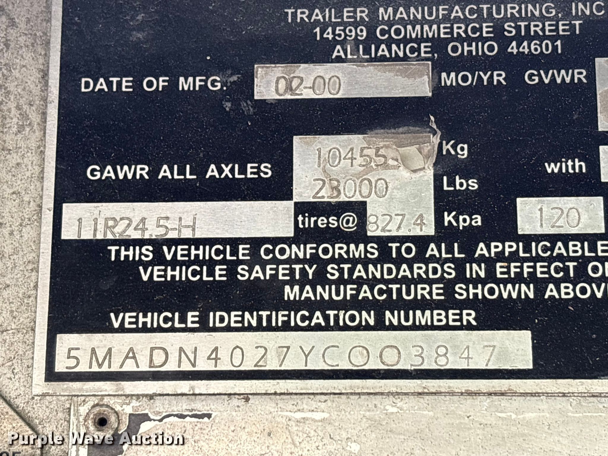 2000 Mac Mac Trailer Manufacturing end dump trailer. VIN: 5MADN4027YC003847, Unit #: 74301845. Dimensions Overall Length: 40', Width: 96", Side height: 78". Features Body type: Aluminum, Ram: Single, End gate: Air operated Grain door, Roll tarp. Chassis Landing gear: Dual, Suspension: Air, Brakes: Air, Axles: Spread, GVWR: 80,000 lbs. Tires Steel wheels, Size: 285/75R24.5. Notes Bed damaged, hole. Repossessed item, stored at a secured facility. Please review REQUIRED REMOVAL INSTRUCTIONS. Titles will be distributed after confirmation of payment and removal. West Virginia title. Title distribution may be delayed up to 30 days from verification of funds. Lender Owned. 1746 U.S. 60. Hurricane, WV 25526