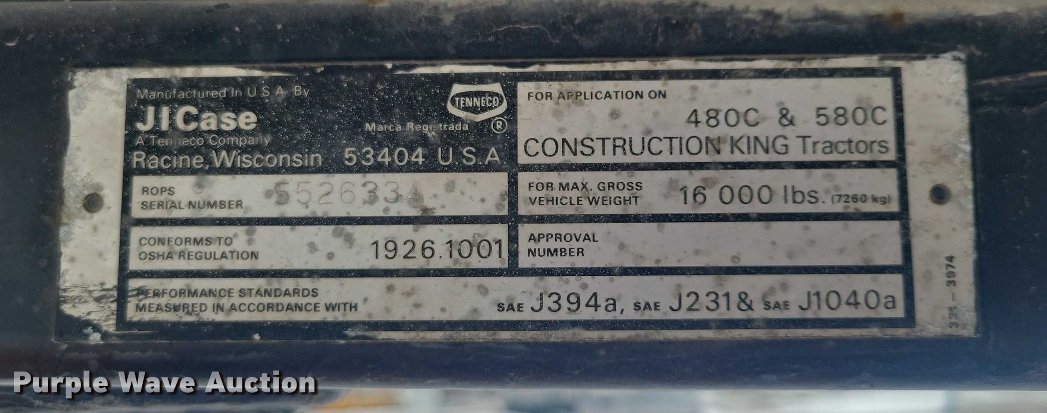 1977 Case 580C backhoe. Hours: 2,320 on meter, Serial: 8962011, Unit #: 76613665. Engine Case 207D, Cylinders: 4, Fuel type: Diesel. Transmission Shuttle shift, 4F - 4R. Chassis Differential lock. Operators station OROPS, Backhoe controls: Three stick. Features Loader Bucket Bucket leveler, Width: 79", Backhoe Bucket Width: 24", Teeth: 4.. Tires Front: 12.5L-16, Rear: 17.5L-24. Notes Collision damage, Flat tire, Backhoe damage, bent, Possible starting issues, hard to start, Unknown operating condition. Buyer responsible for all aspects of loadout and removal. Insurance salvage, stored at a secured facility. Please review REQUIRED REMOVAL INSTRUCTIONS. Insurance Salvage. Des Moines, IA 50313