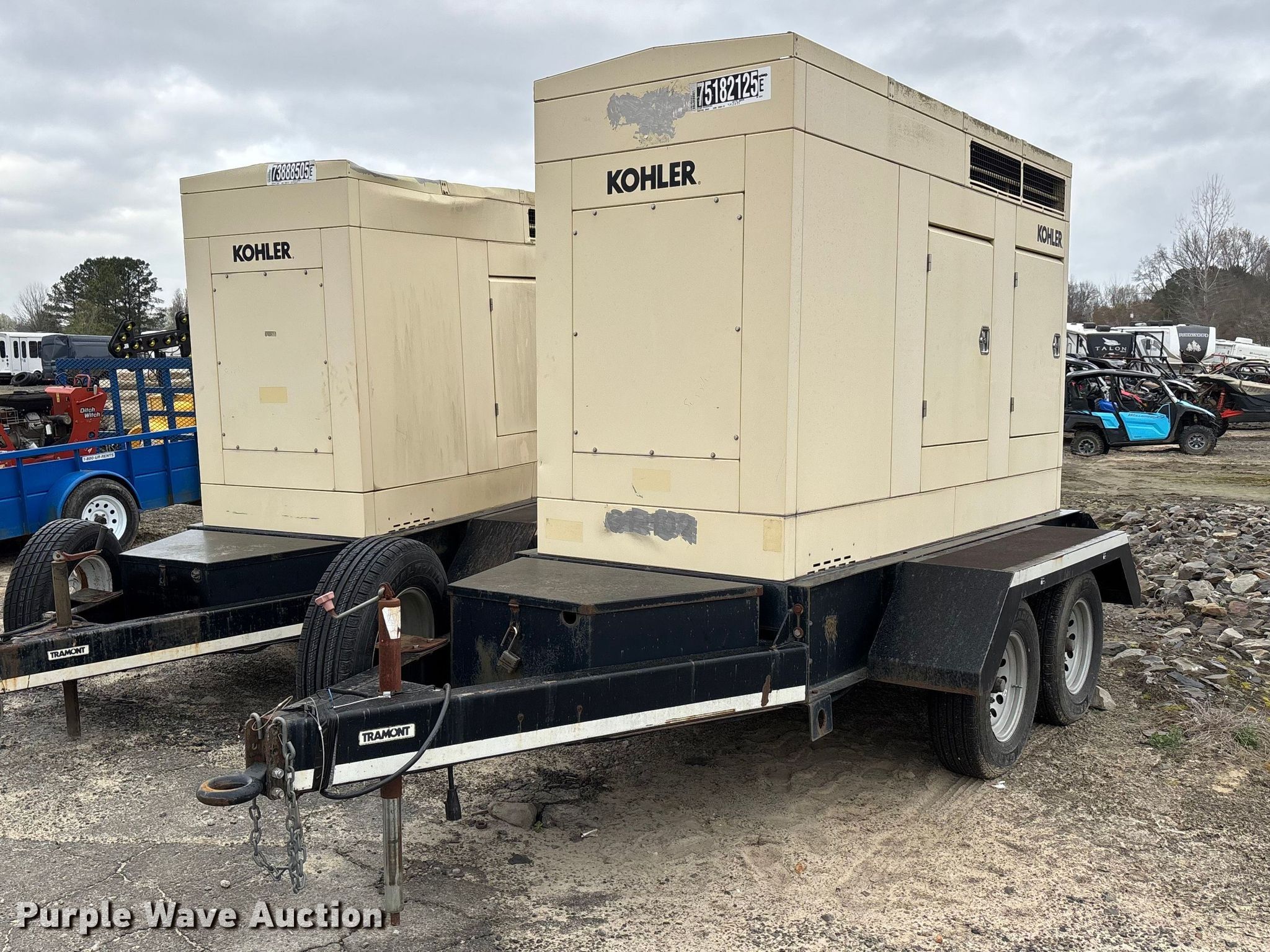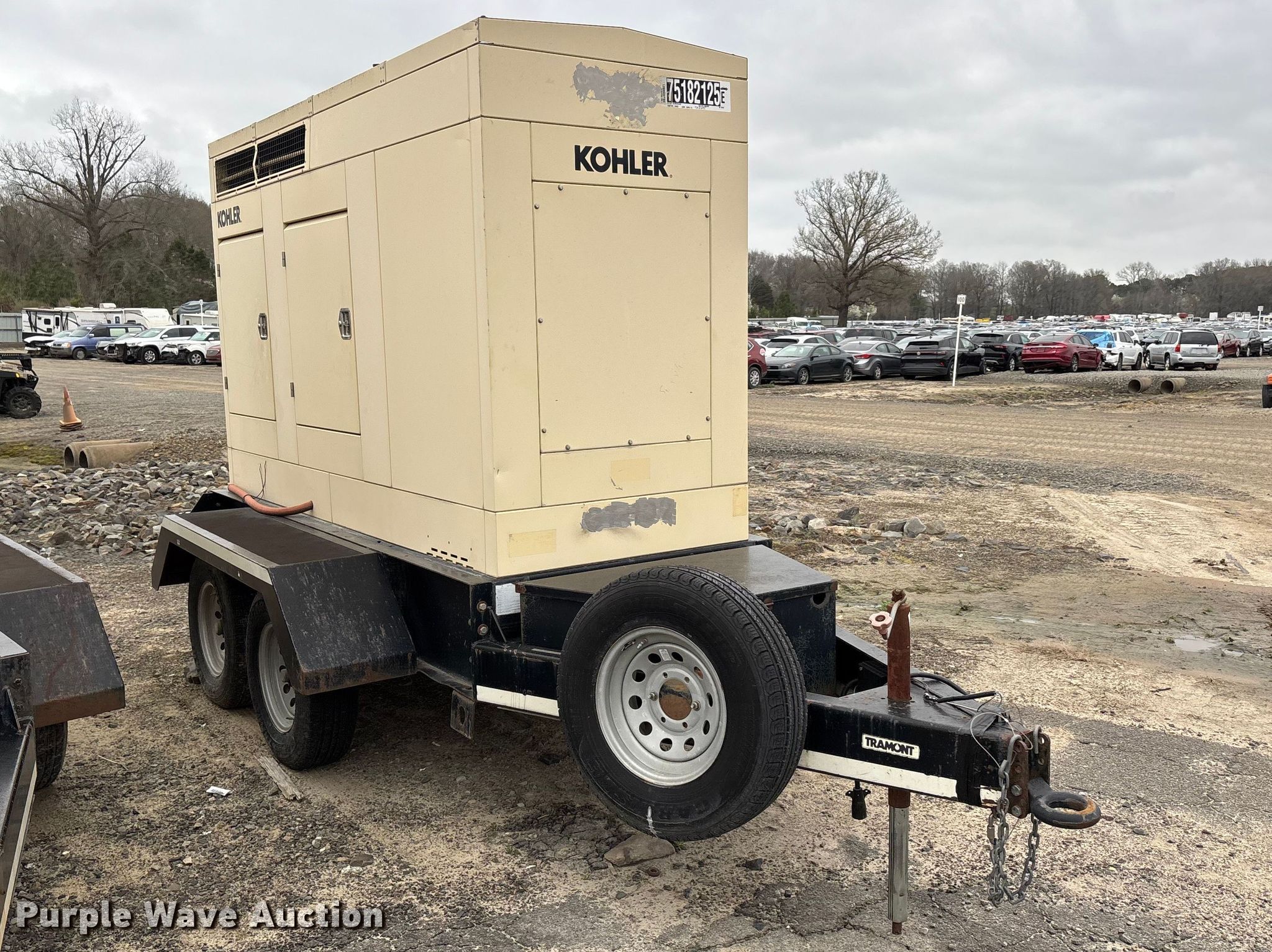 Kohler 30RE0ZJ generator. Hours: 4,060 on meter, Serial: 609642. Engine John Deere 4045DF150, Displacement: 4.5L, Cylinders: 4, Fuel type: Diesel. Features Generator kVA: 33, kW: 33, Phase: Single, Electric start, Fuel tank. Trailer Tramont, 16' L x 83" W, Hitch: Pintle, Suspension: Spring, Brakes: Electric, Axles: Tandem, Tire size: 225/75R15. Notes Battery missing, Unknown operating condition. Telecom fleet inventory reduction, stored at a secured facility. Please review REQUIRED REMOVAL INSTRUCTIONS. This is worksite support equipment and will not come with a title. Transfer of ownership documentation will be a bill of sale. Telecom Fleet Inventory Reduction. 703 Main Street. Conway, AR 72032