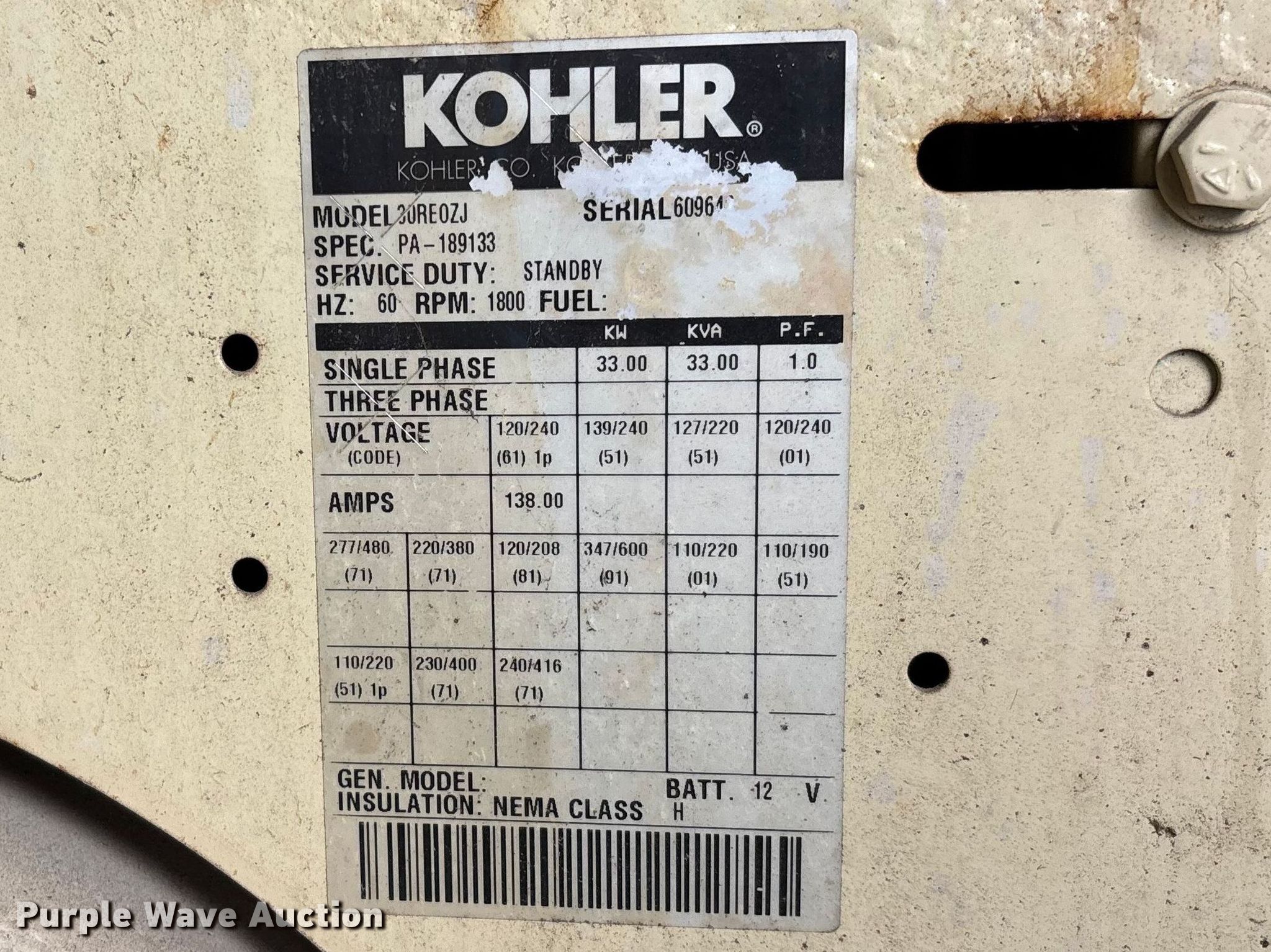 Purple Wave is selling a used Generator Set in Arkansas. This item is a Kohler 30RE0ZJ generator with the following: Hours: 4,060 on meter, Serial: 609642
