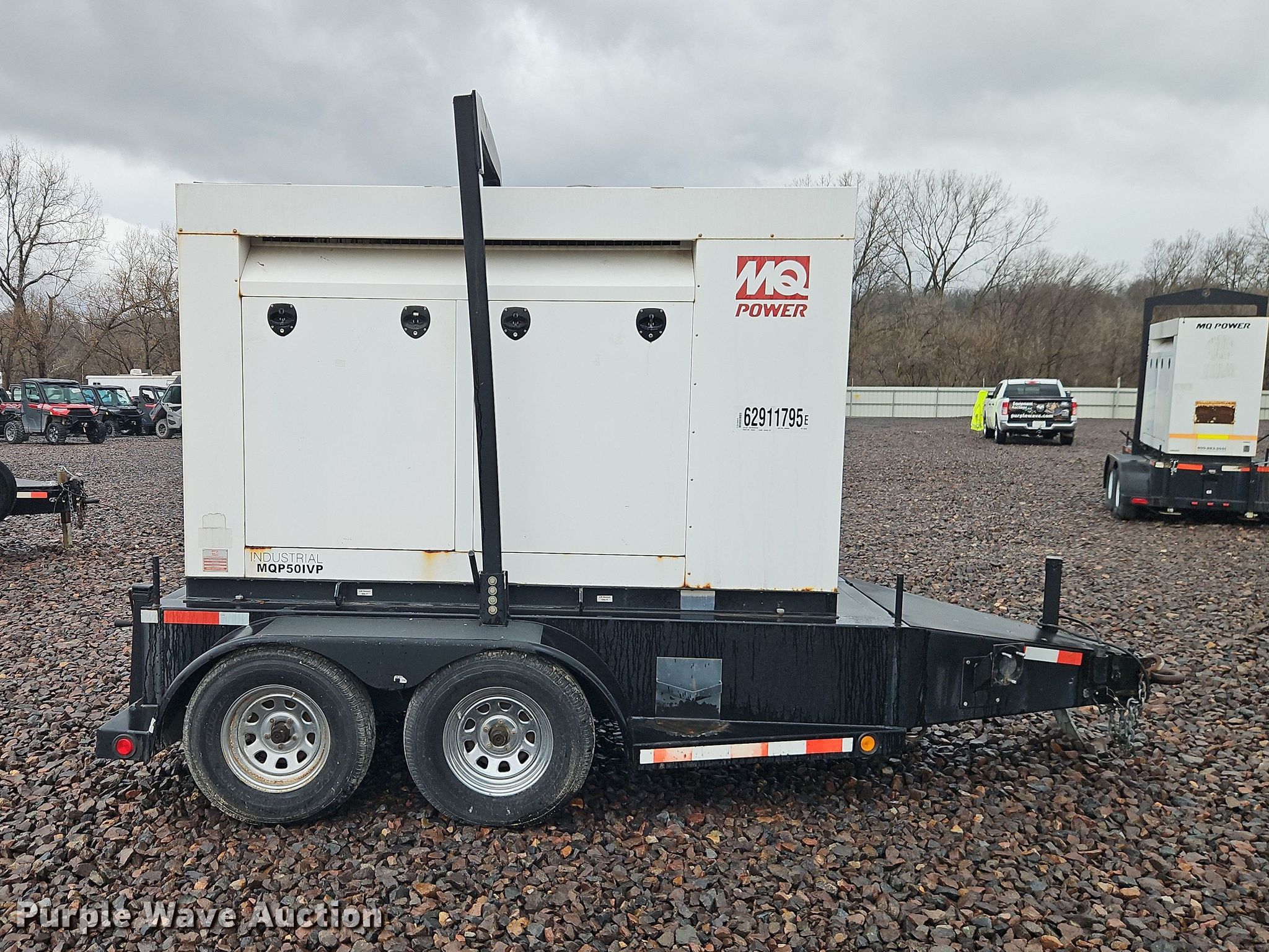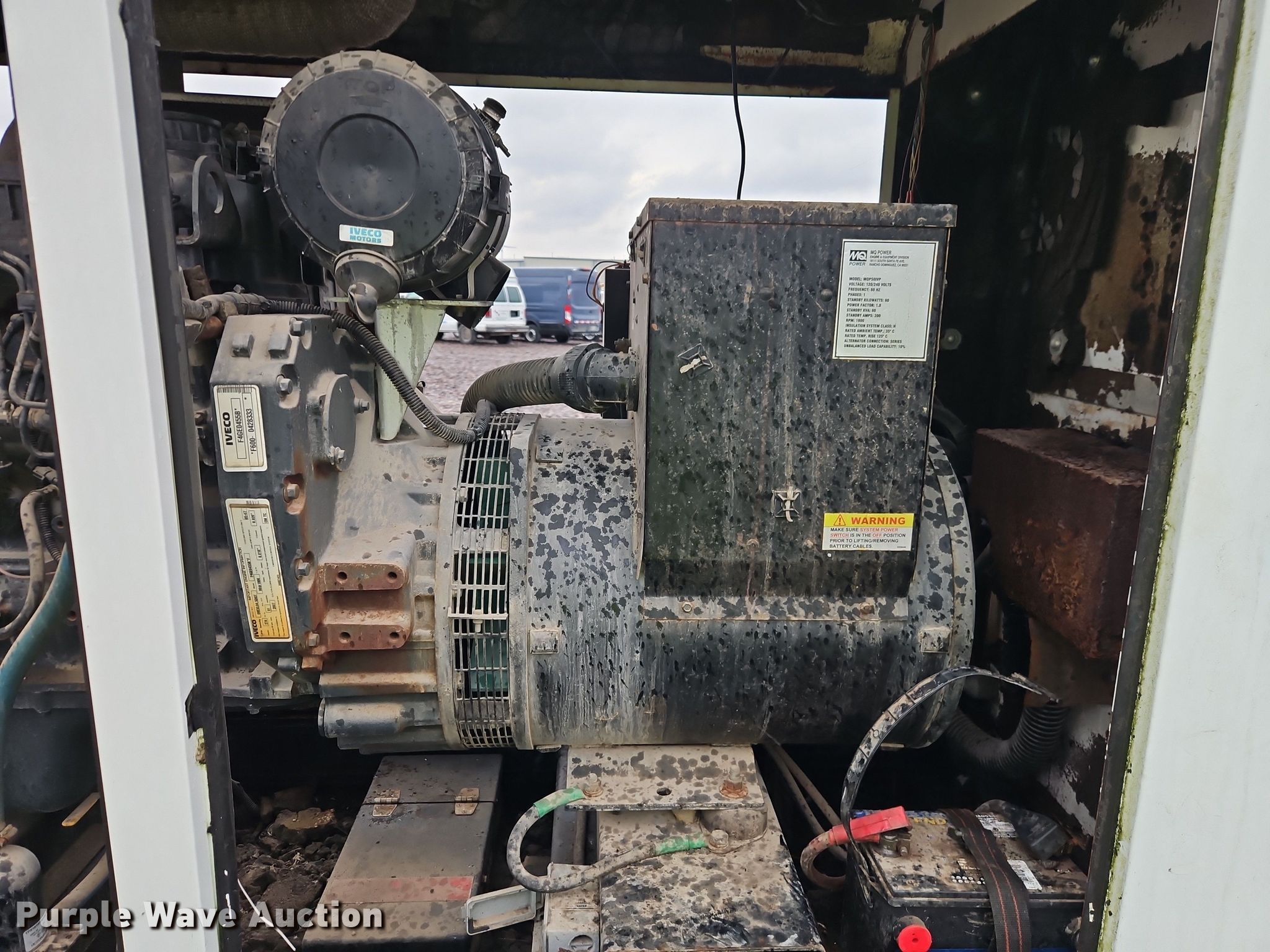 2007 MQ Power MQP50IVP generator. Hours: 101 on meter, VIN: 1G3GT142071302339, Serial: 1110626-17-34, Unit #: 62911795. Engine Iveco F4GE0455B, Displacement: 274cc, Cylinders: 4, Fuel type: Diesel. Features Generator Model: MQP50IVP, kVA: 60, kW: 60, Phase: Single, Electric start, Fuel tank. Trailer 15' L x 79" W, Hitch: Pintle, Suspension: Torsion, Brakes: Electric, Axles: Tandem, Tire size: 225/75R15, GVWR: 7,000 lbs. Notes Jump start required during on-site data collection. Telecom fleet inventory reduction, stored at a secured facility. Please review REQUIRED REMOVAL INSTRUCTIONS. This is worksite support equipment and will not come with a title. Transfer of ownership documentation will be a bill of sale. Telecom Fleet Inventory Reduction. Kansas City, KS 66111