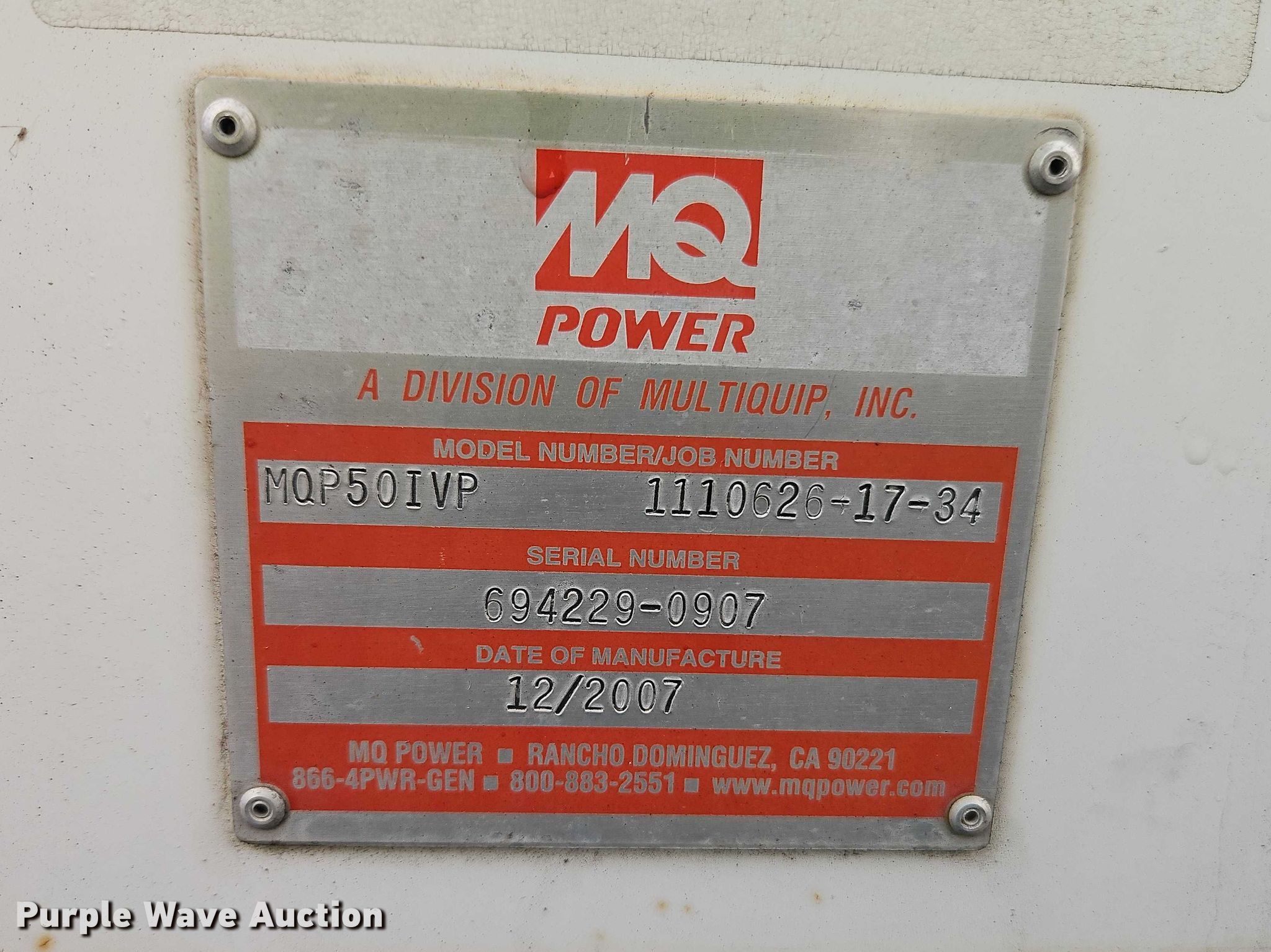 2007 MQ Power MQP50IVP generator for sale in Kansas City, Kansas. Item YA2712 will sell on March 26th, 2026.