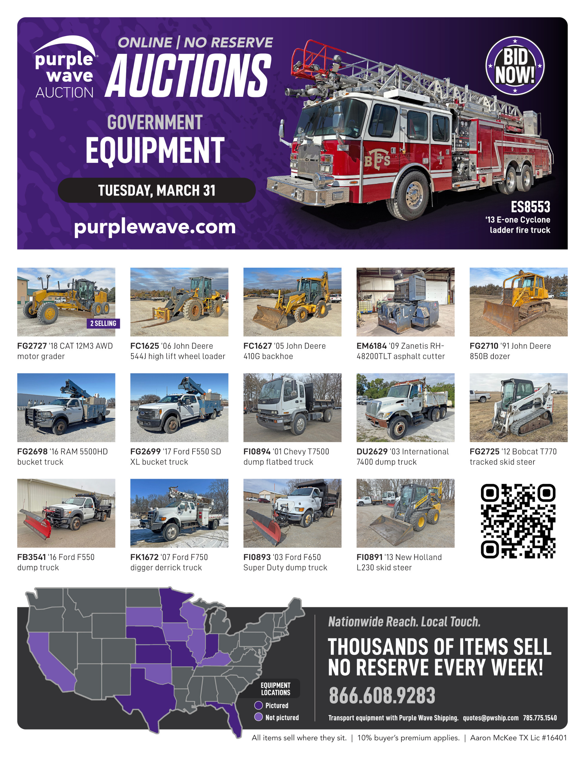 This auction is conducted by Purple Wave, Inc., whose home office is 825 Levee Drive, Manhattan, Kansas. Aaron McKee, Texas auctioneer license # 16401, operates Purple Wave, Inc. Complaints against us may be directed to the Texas Department of Licensing and Regulation, P.O. Box 12157, Austin, Texas 78711, (512) 463-6599. For additional required information, see the attached document.