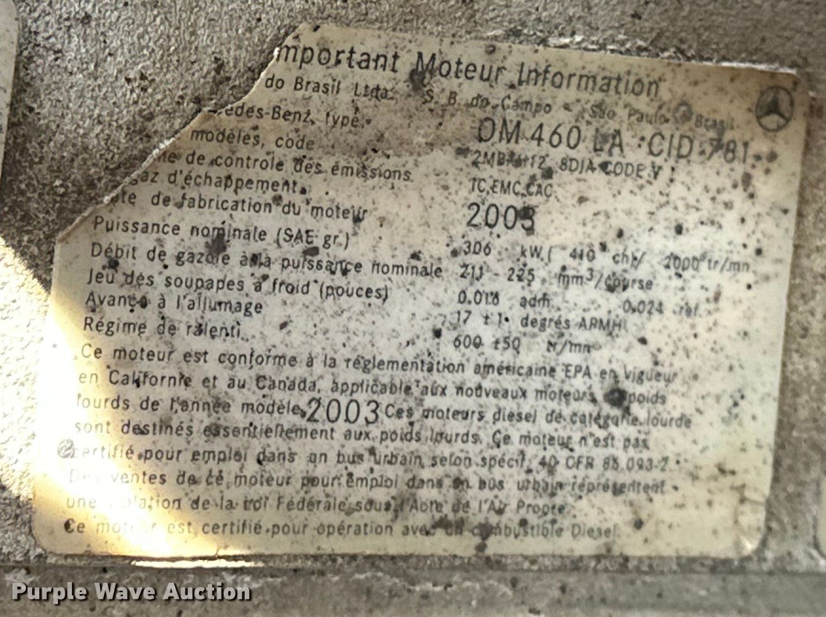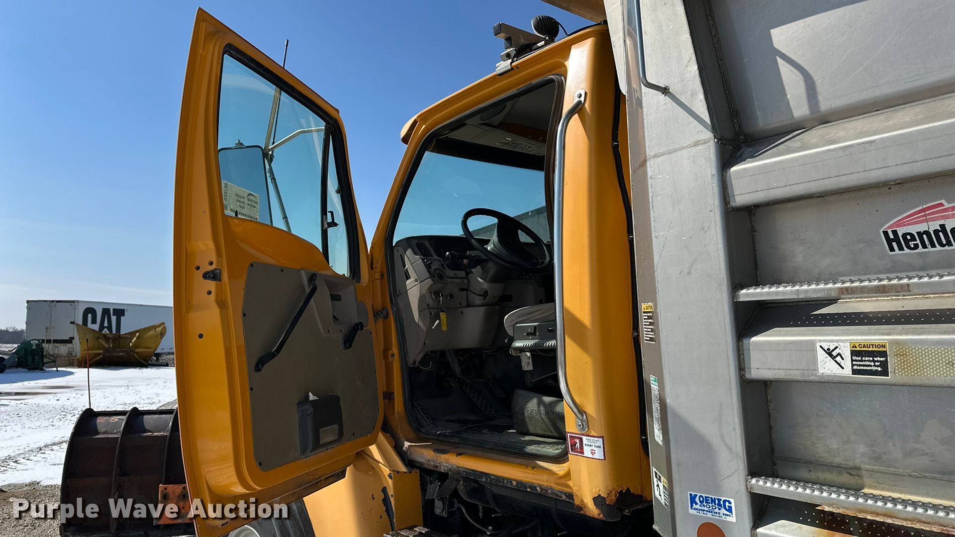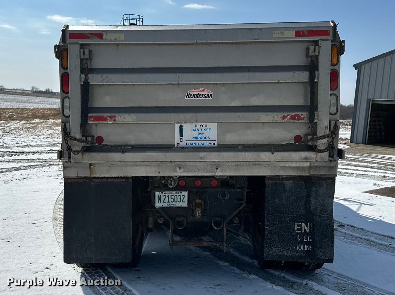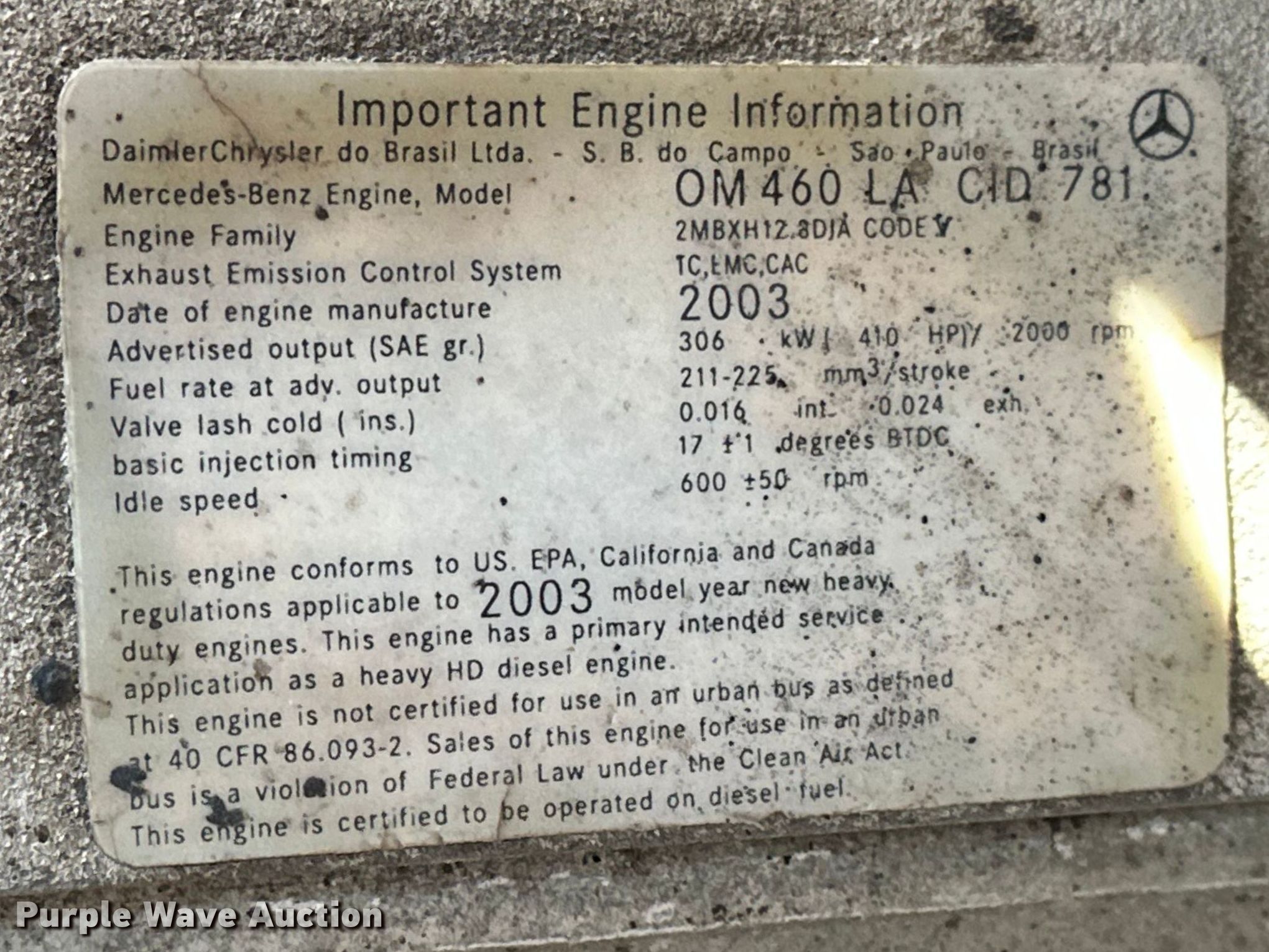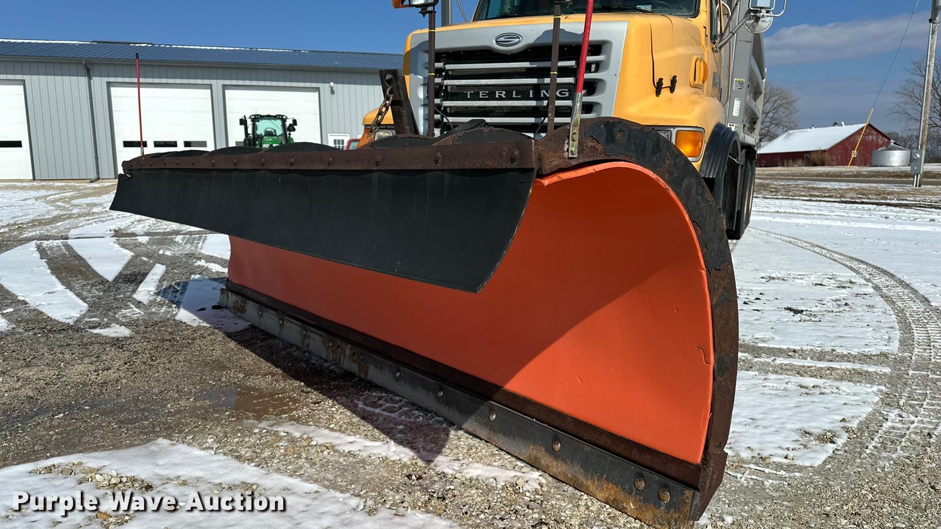 2004 Sterling L9500 dump truck. Miles: 381,352 on odometer, Hours: 4,711 on meter, VIN: 2FZHAZCV64AM26493. Engine Mercedes-Benz OM460, Displacement: 781 C.I.D., Cylinders: 6, Fuel type: Diesel, Engine brake. Transmission Eaton Fuller Road Ranger, Manual, Speed: 10. Chassis Double frame, Axles: Tandem, Differential lock: Inter-axle, Suspension: Spring over walking beam, Brakes: Air, Front mount PTO, GVWR: 58,000 lbs FAWR: 18,000 lbs, IAWR: 20,000 lbs, RAWR: 20,000 lbs. Interior AC, Heat, Heated mirrors, Cruise control. Features Bed Dump bed, Henderson XDX15X36X304SS, Serial: MK1-14179, Length: 15', Width: 96", Side height: 56", Bed type: Stainless steel, Ram: Single, End gate: Air operated, Plow Monroe MPP41-12-ISCT-IL, Width: 144". Tires Front: 385/65R22.5, Rear: 11R22.5. Notes Fire extinguisher not included. Illinois title. Title distribution may be delayed up to 14 days from verification of funds. Indian Point Township. Abingdon, IL 61410