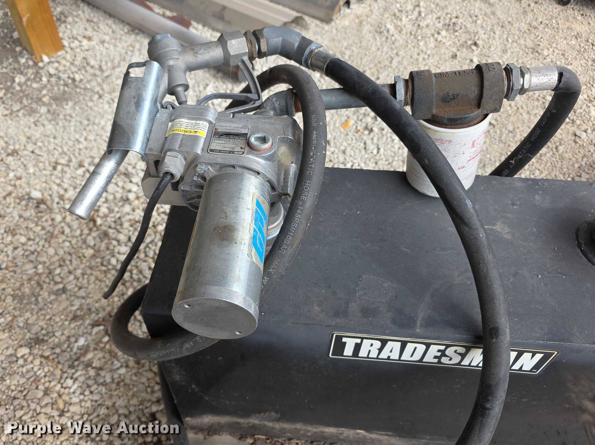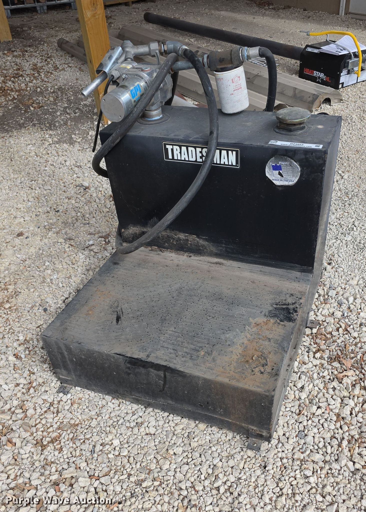 Purple Wave is selling a used Fuel and Lube in Kansas. This item is a Tradesman fuel transfer tank with the following: Capacity: 48 gallons, GPI fuel pump, Hose