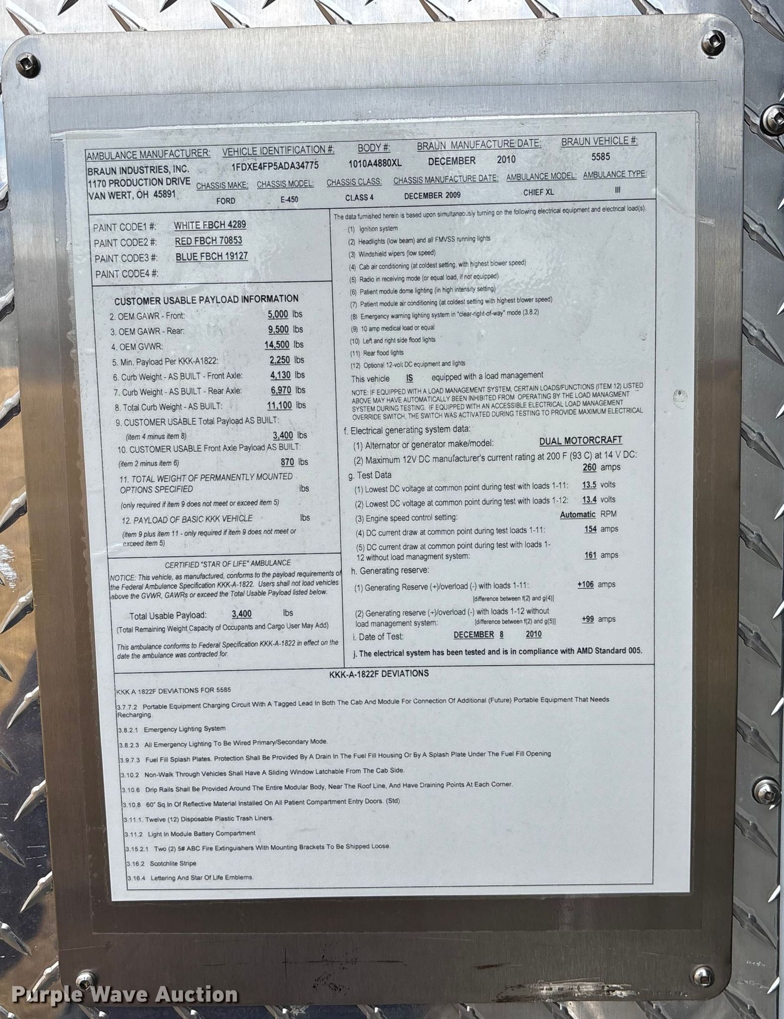 2010 Ford E450 Super Duty ambulance. Miles: 145,226 on odometer, VIN: 1FDXE4FP5ADA34775. Engine Displacement: 6.0L, Cylinders: 8, Fuel type: Diesel. Transmission Automatic. Chassis Axles: Single, Suspension: Spring, Brakes: Hydraulic, GVWR: 14,500 lbs. Interior AC, Heat, Power windows, Power locks, Cruise control, Auxiliary controls. Features Ambulance body Braun Industries, Inc. 1010A4880XL, PA/ siren controls, Oxygen hookups. Tires Size: 225/75R16. Notes Dead battery, Possible electrical issues , Non-operational unit, Unit must be towed or hauled. Missouri title. Seller is a government entity who will be assigning and distributing the title. Please contact the seller for distribution questions. Grand River Regional Ambulance. Stanberry, MO 64489