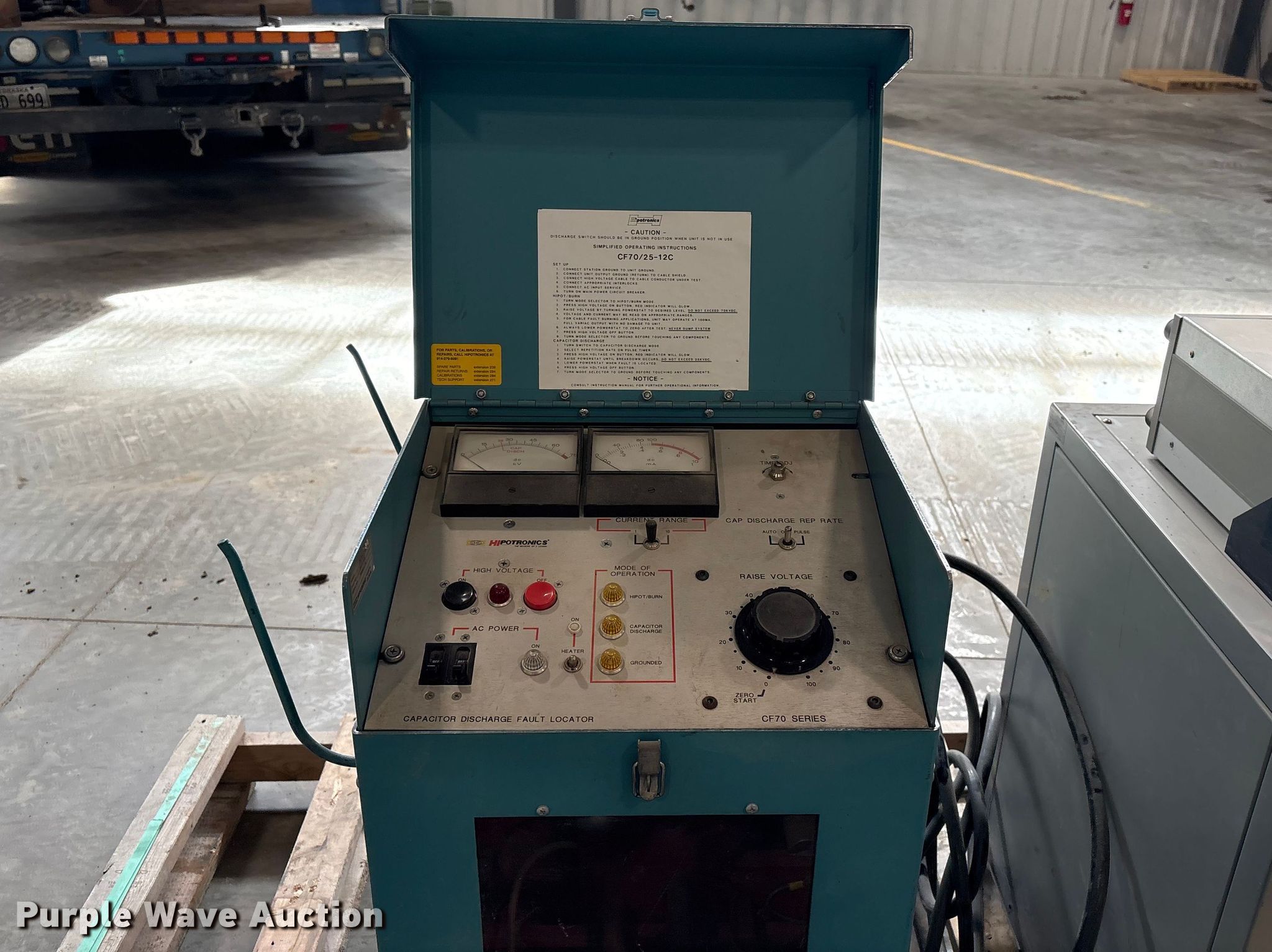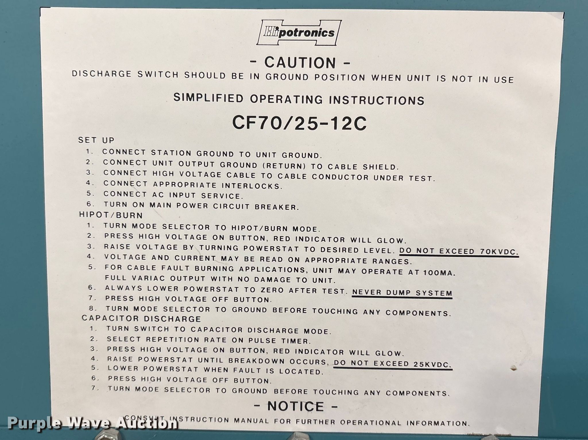 Purple Wave is selling a used Electronics in Nebraska. This item is a Hipotronics CF70-12-A voltage testing equipment with the following: Serial: M9801178