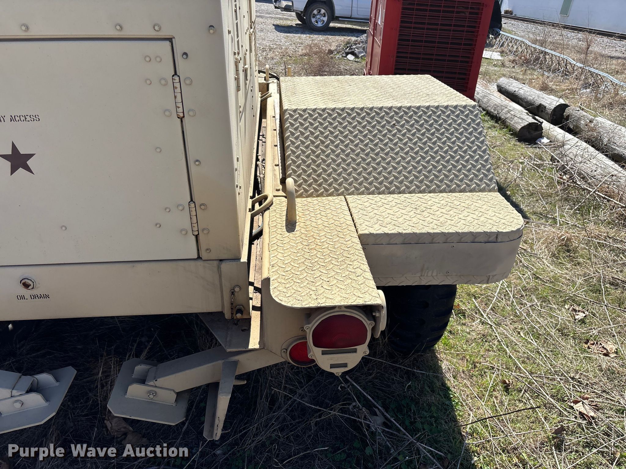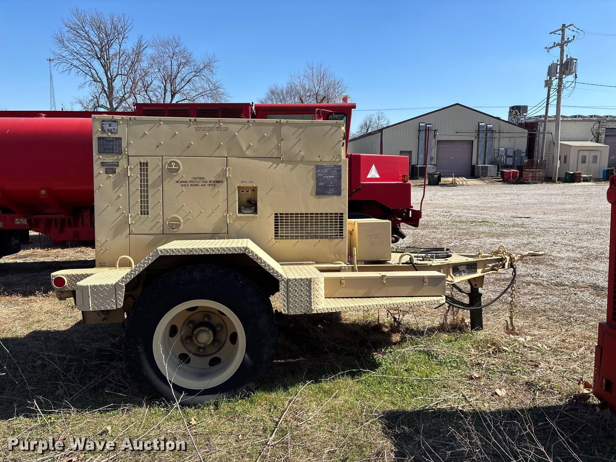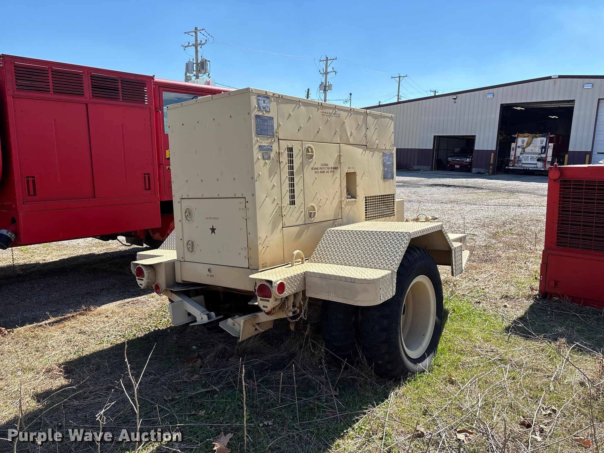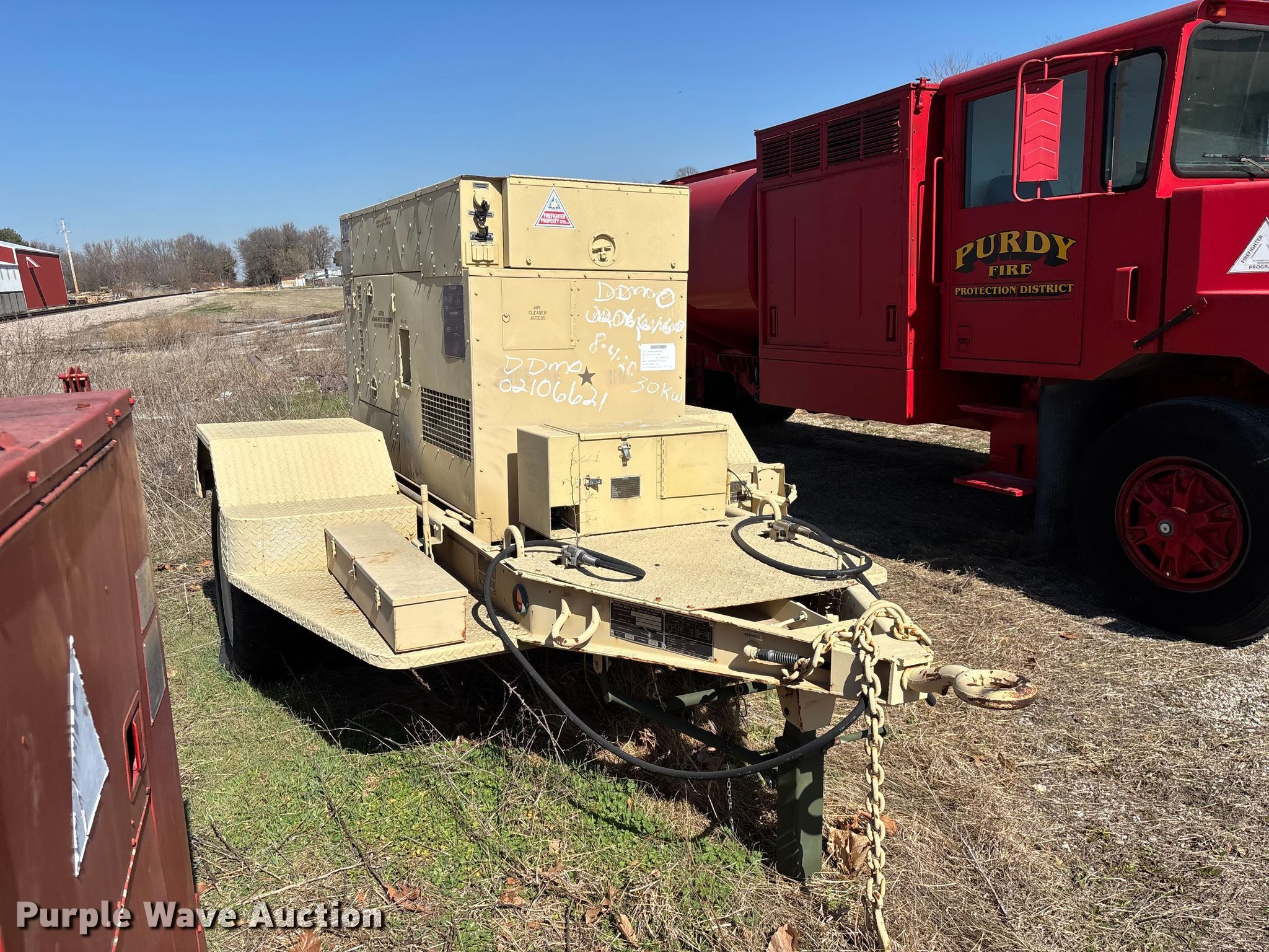 1993 U.S. Department of Defense MEP-805A generator. Hours: 408 on meter, VIN: 391, Serial: RHZ00180. Engine John Deere, Serial: SE4039T358094, Cylinders: 4, Fuel type: Diesel. Features Generator Military Design 88-21007, Phase: Three, kW: 25/30, kVA: 31.2/37.5, Electric start, Fuel tank. Trailer 2009 Turtle Mountain, 14' L x 8" W, Hitch: Pintle, Suspension: Spring, Brakes: Air over hydraulic, Axles: Single, Tire size: 9.00-20. Notes Dead battery, Unknown operating condition. This is worksite support equipment and will not come with a title. Transfer of ownership documentation will be a bill of sale. Purdy Fire Protection District. Purdy, MO 65734