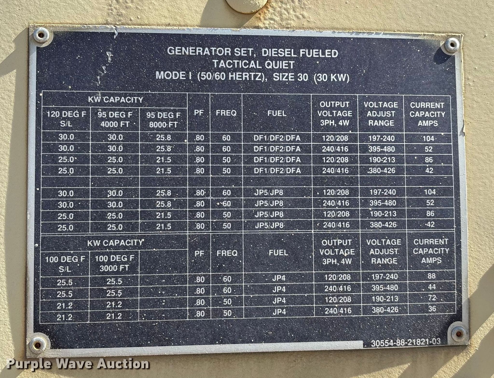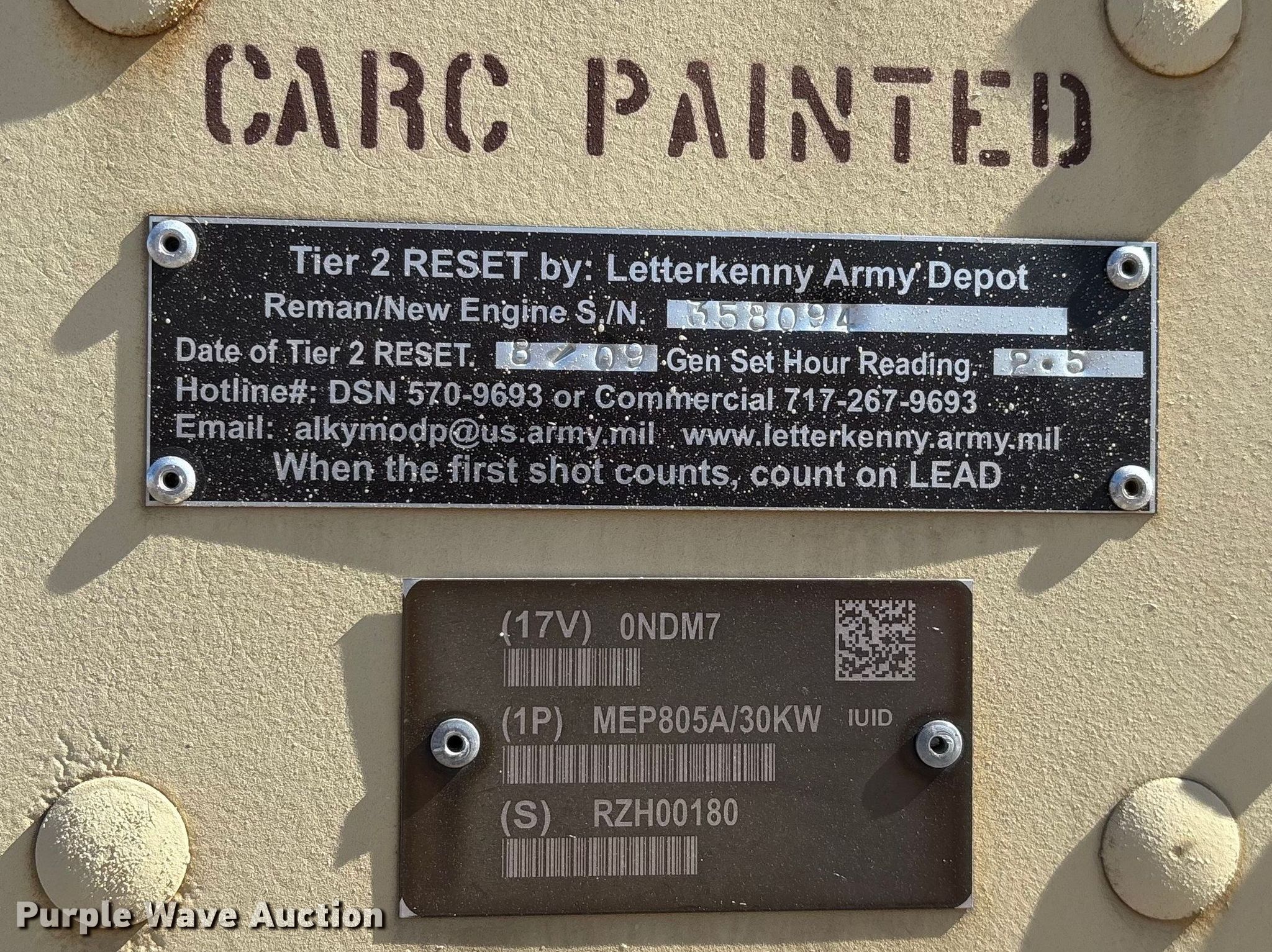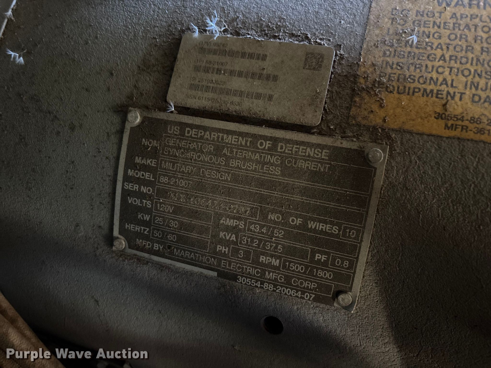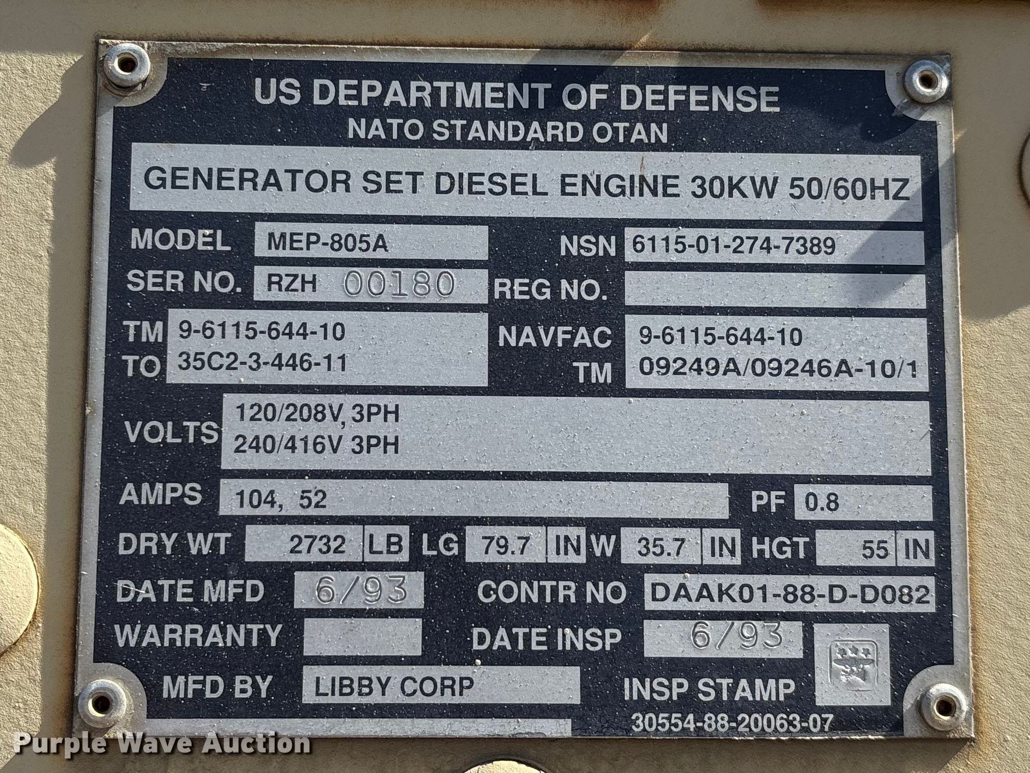 Purple Wave is selling a used Generator Set in Missouri. This item is a 1993 U.S. Department of Defense MEP-805A generator with the following: Hours: 408 on meter, VIN: 391, Serial: RHZ00180