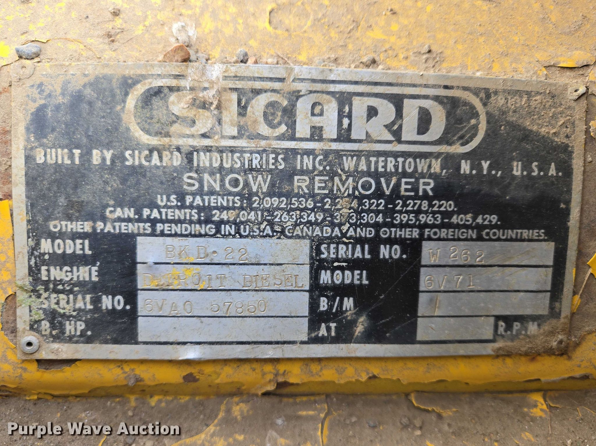 Sicard BKD22 wheel loader snow blower. Serial: W262. Engine Detroit Diesel 6V71, Cylinders: 6, Fuel type: Diesel. Features Width: 9'. Bon Homme County, SD. Tyndall, SD 57066