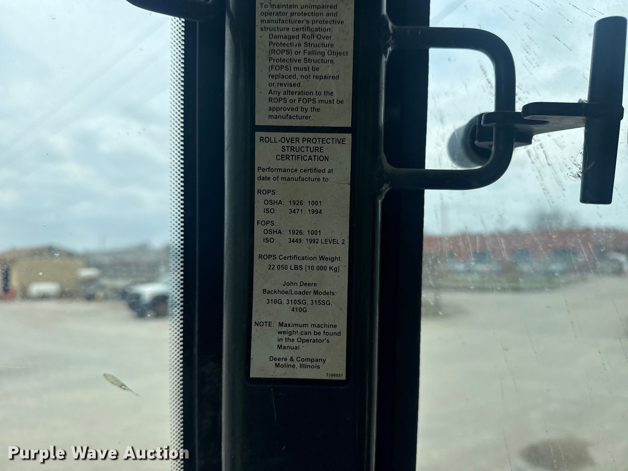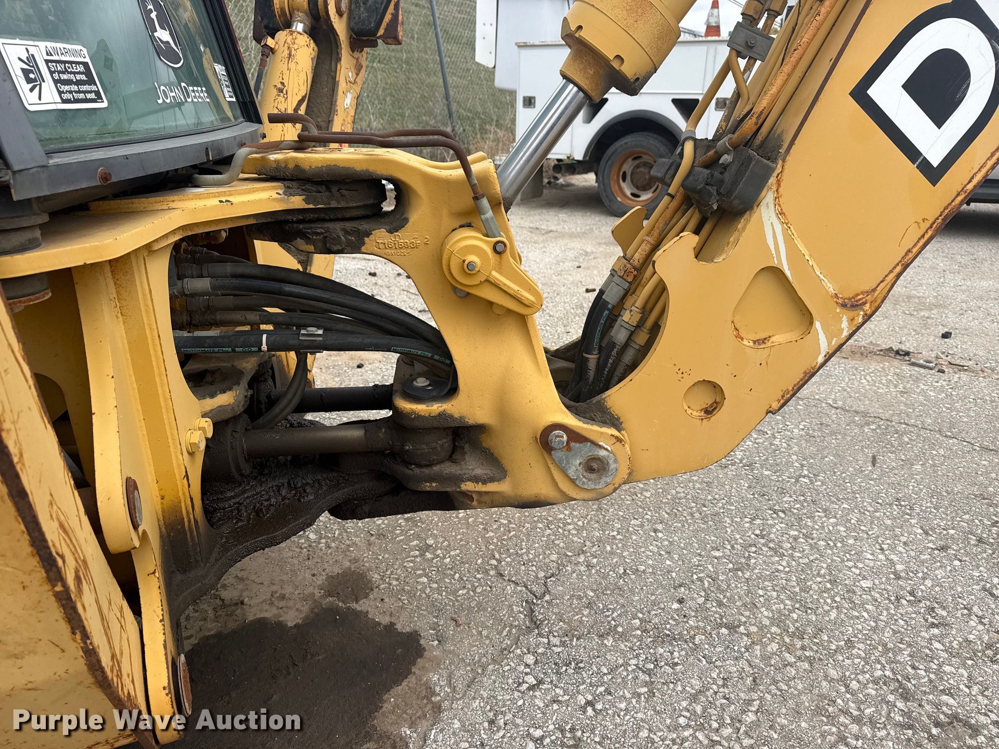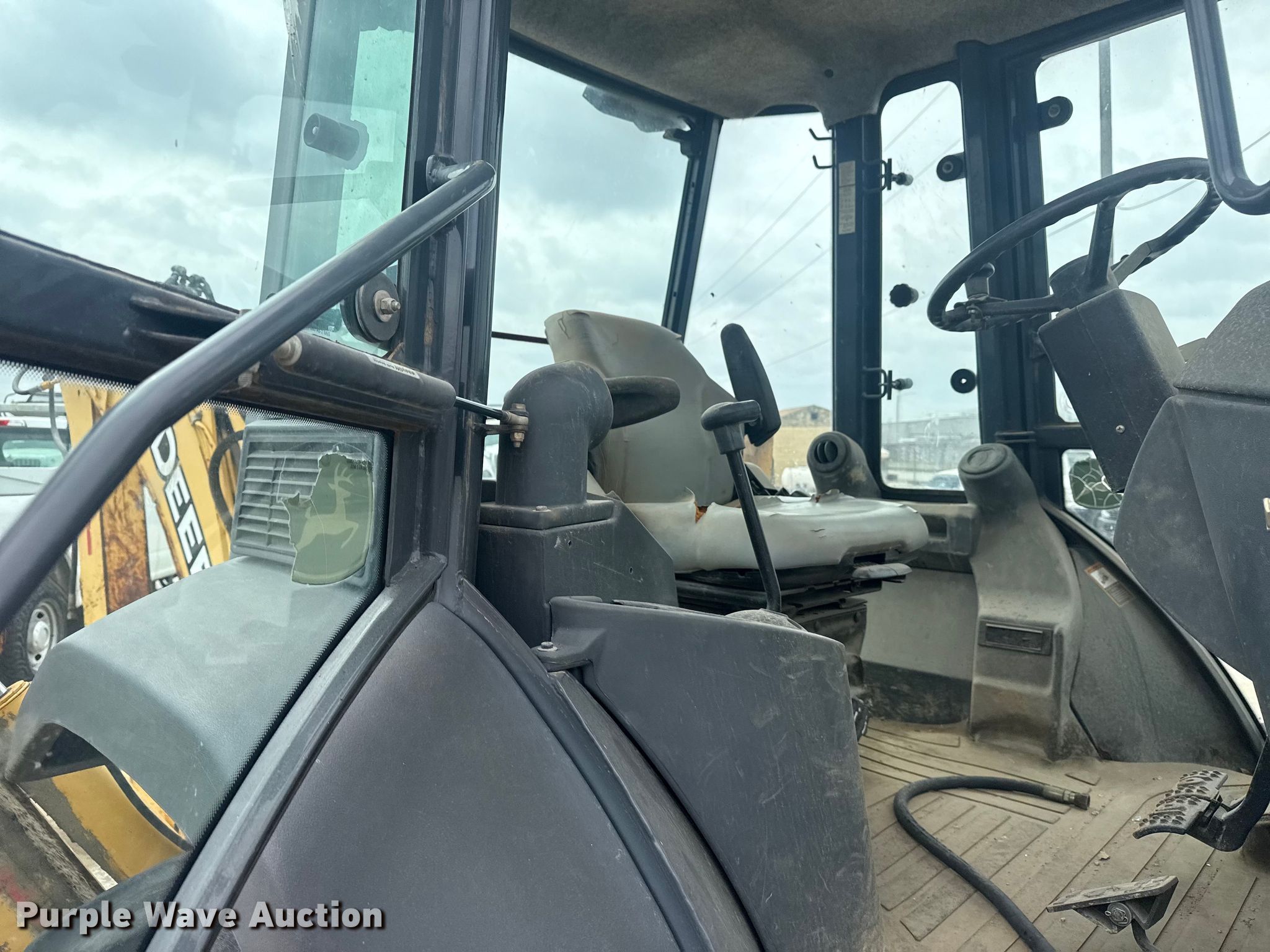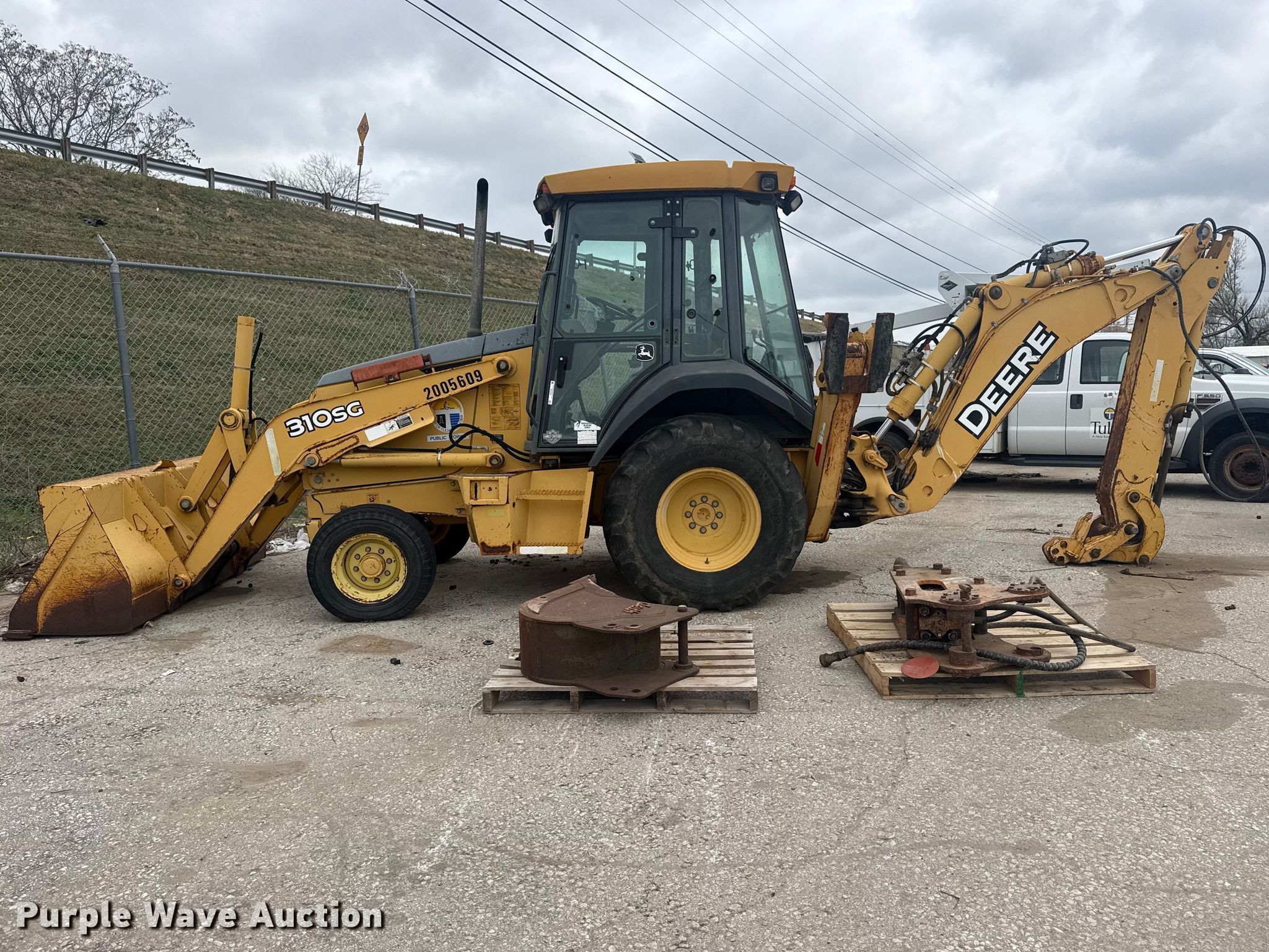 2006 John Deere 310SG backhoe. Hours: Unknown, Serial: T0310SG952155, Unit #: 2005609. Engine Cylinders: 4, Fuel type: Diesel. Transmission Powershift, 4F - 4R. Chassis Differential lock. Operators station Enclosed cab, Heat, Backhoe controls: Wobble stick / two stick. Features Loader Bucket John Deere AT308080, Capacity: 1 cu.yd., Width: 91", Cutting edge: Bolt-on, Backhoe Extendable stick, Quick coupler: Manual, Auxiliary hydraulics, Bucket Geith, Width: 12", Teeth: 3, BTI breaker Bit: 23". Tires Front: 11L-16SL, Rear: 19.5L-24. Notes Glass cracked, Left door issue, hinge missing, Non-operational unit. City of Tulsa. Tulsa, OK 74107