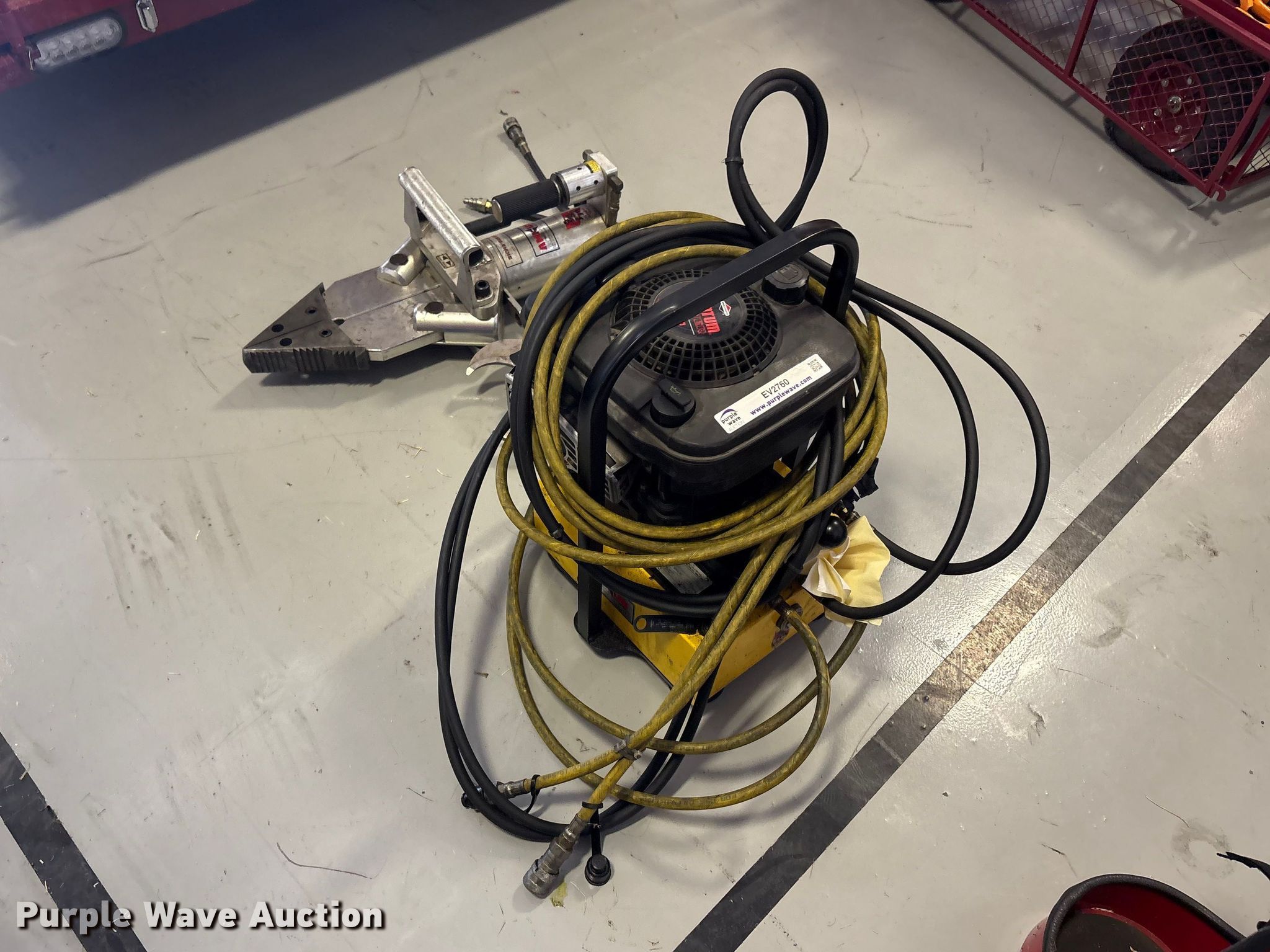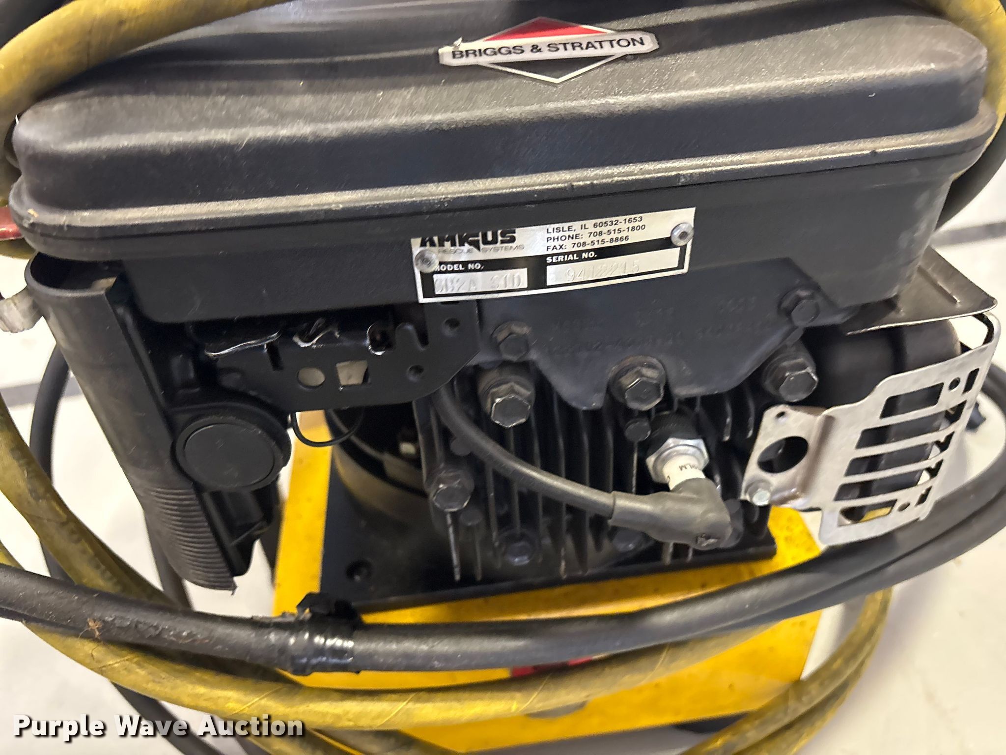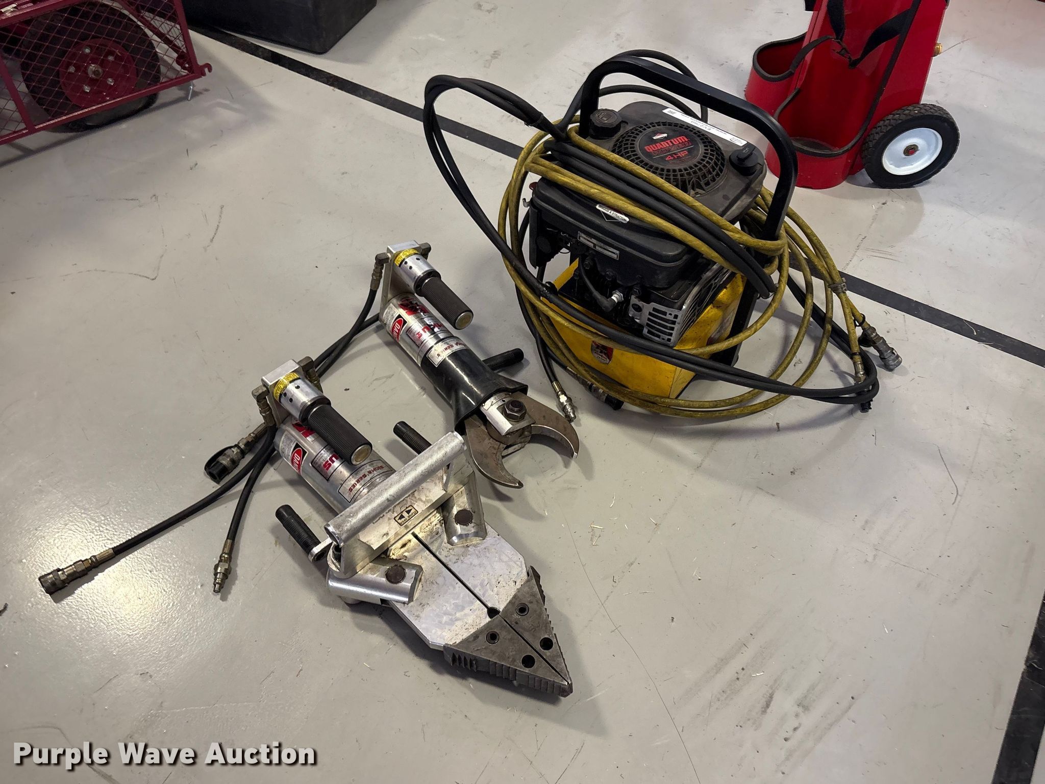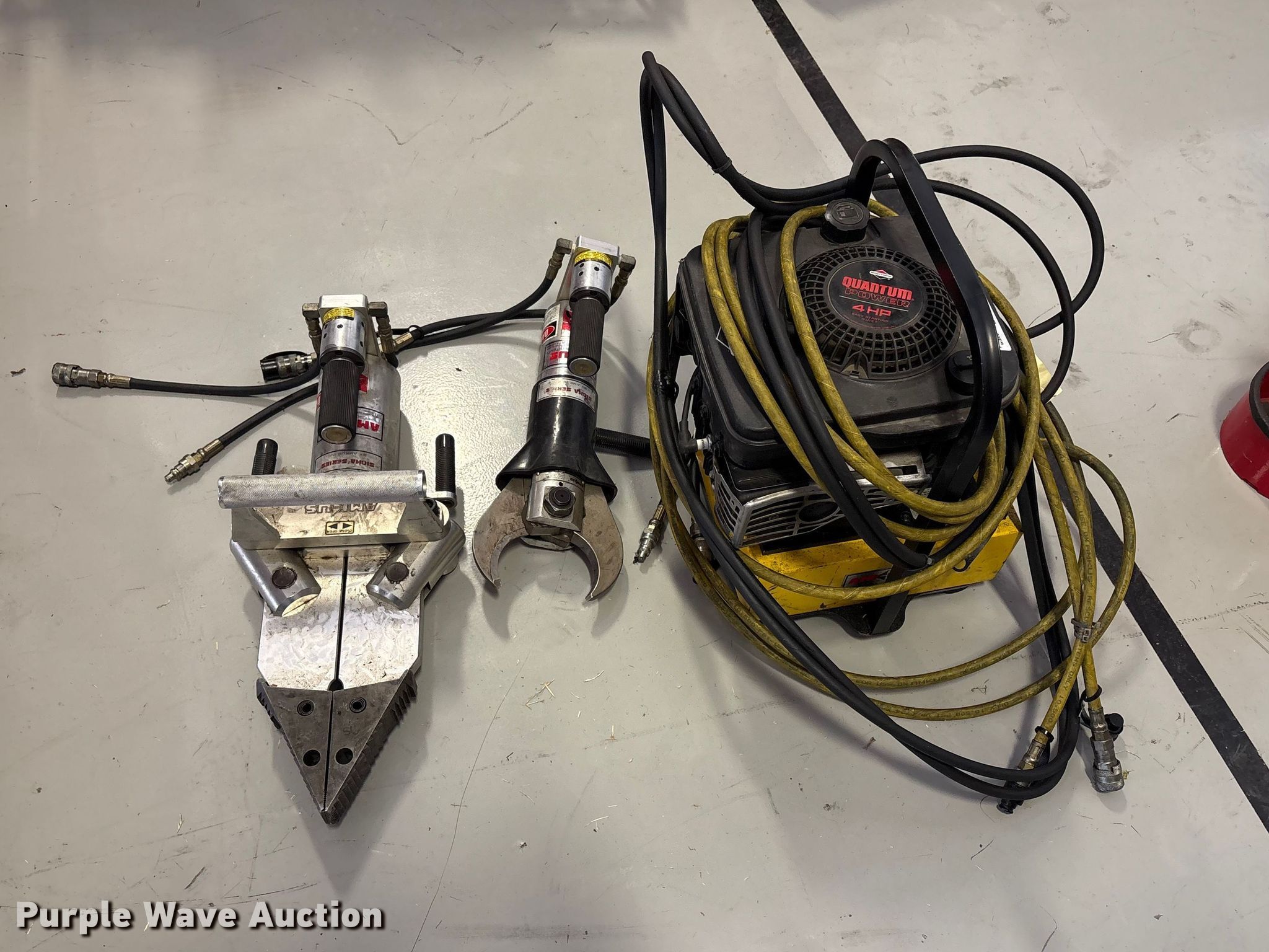 Purple Wave is selling a used Tools in Oklahoma. This item is a Hydraulic Rescue Jaws with the following: Briggs & Stratton engine, HP: 4, Power Team Hydraulic Pump, Serial: 368491, Amkus M-28 Jaws, Serial: 94091491/S, Amkus M-20, Serial: 94100755/C