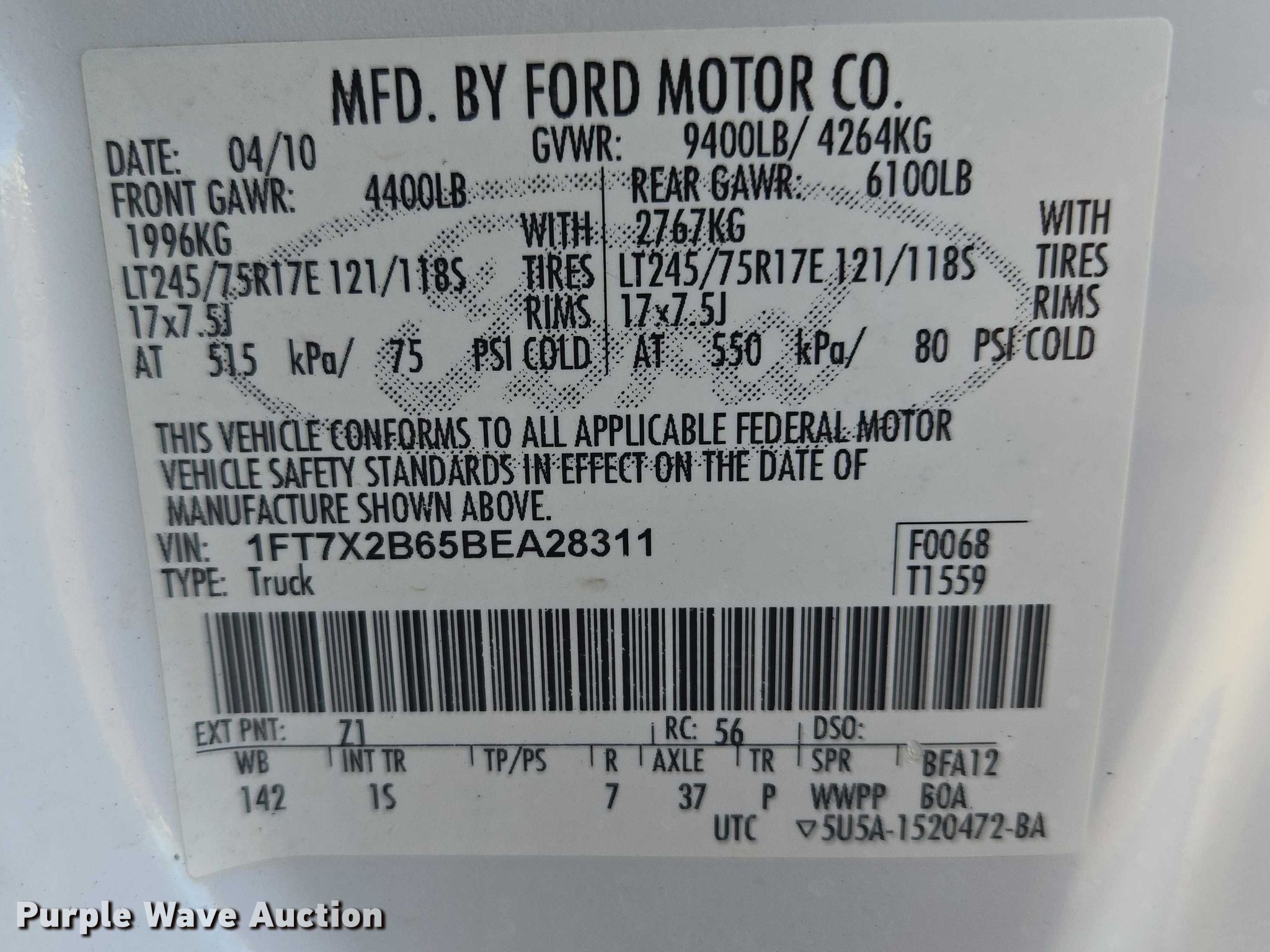- VIN: 1FT7X2B65BEA28311