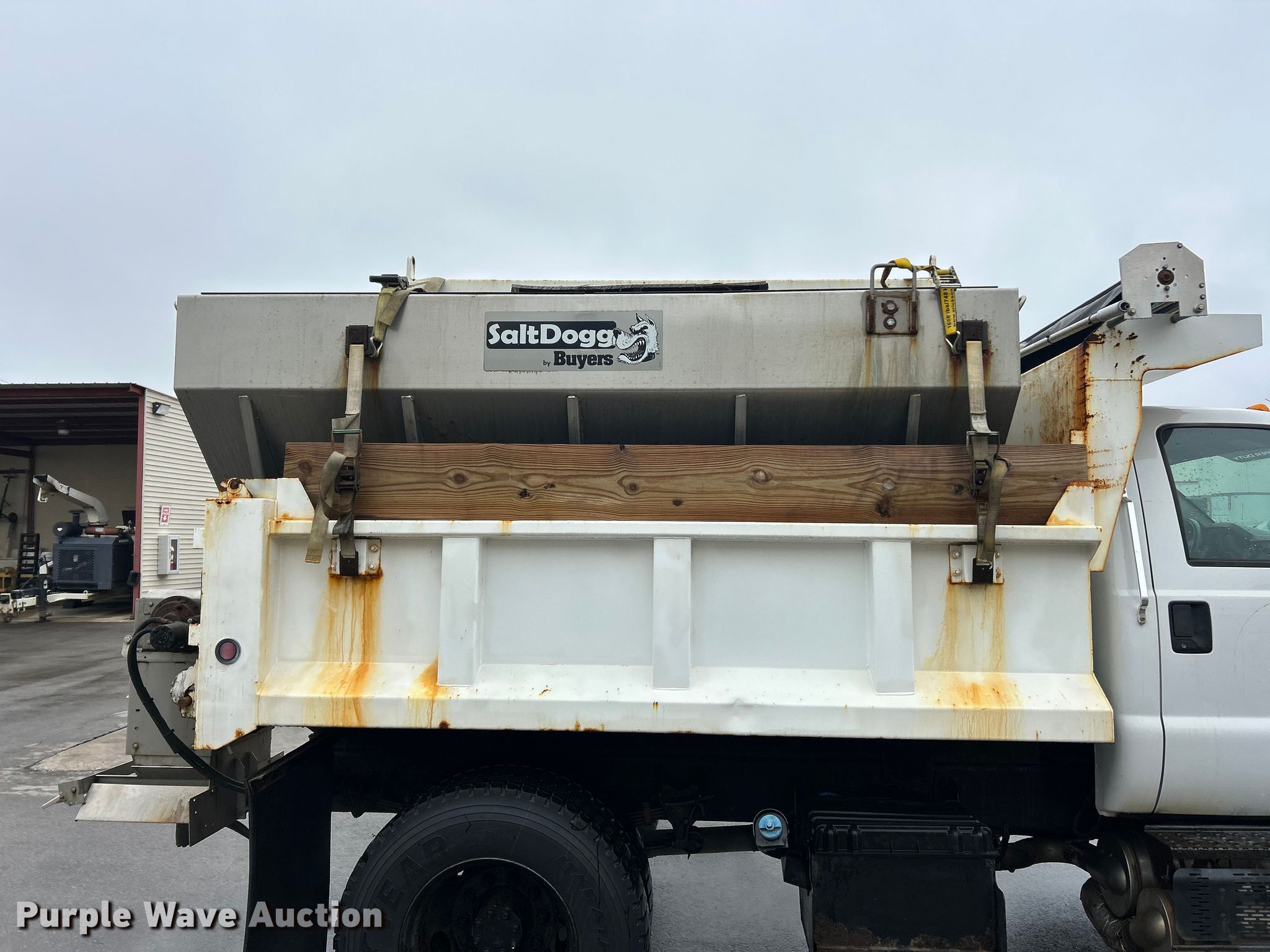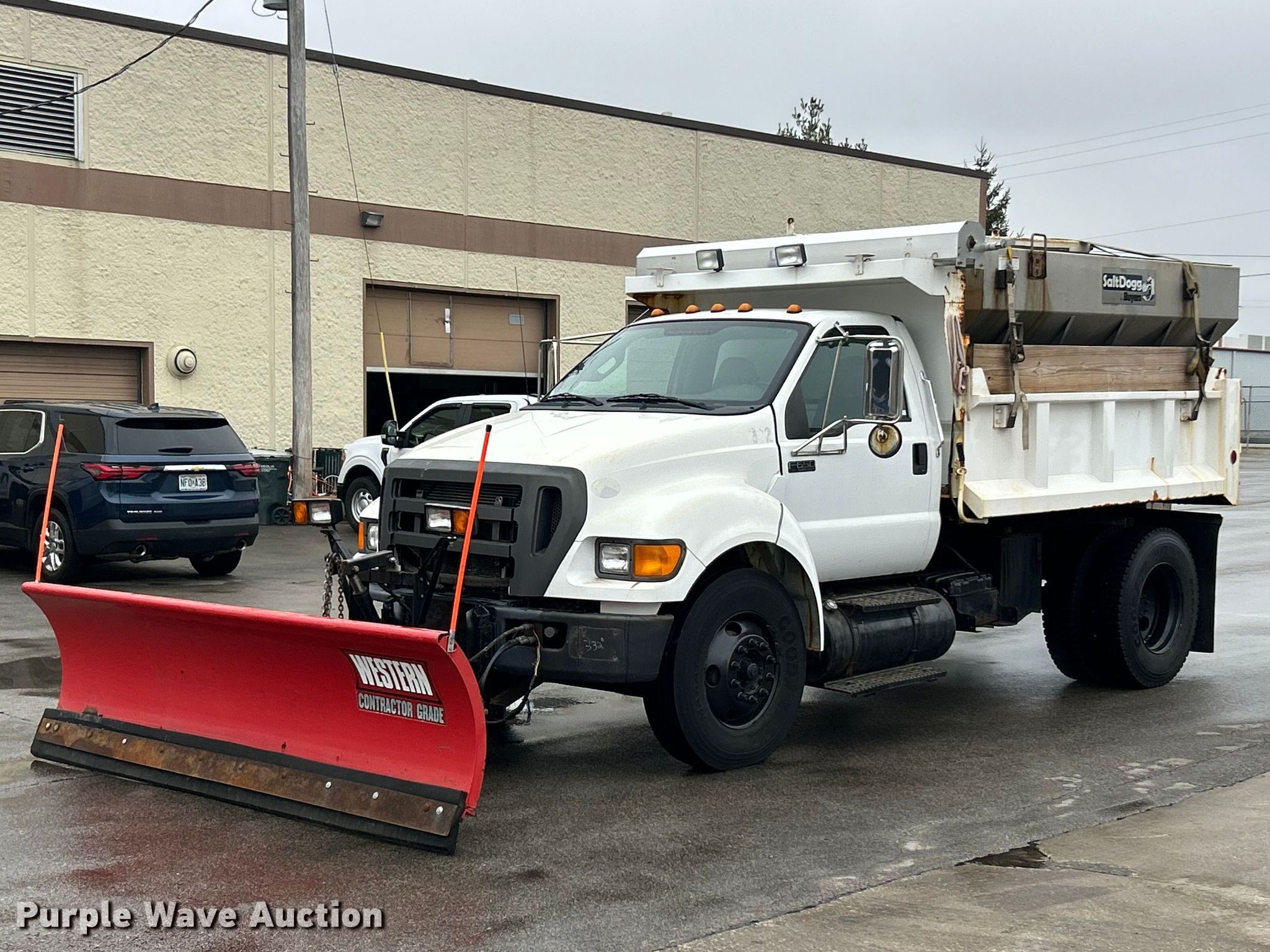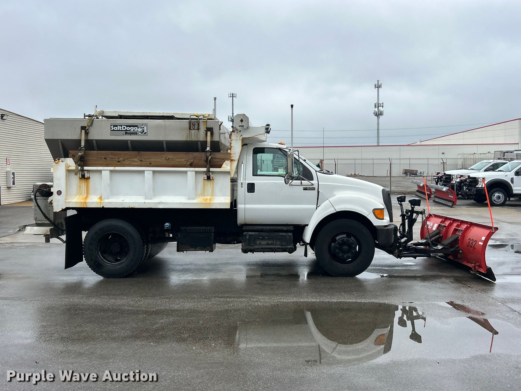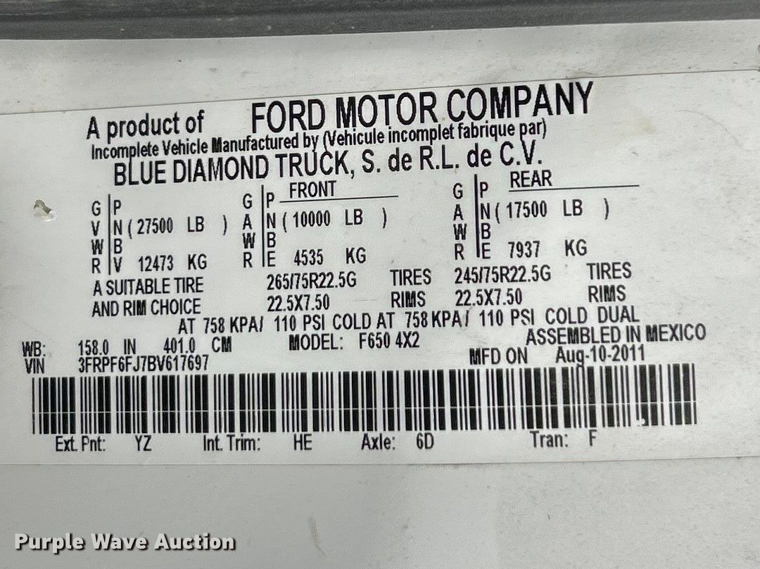 2011 Ford F650 Super Duty dump truck. Miles: 30,848 on odometer, VIN: 3FRPF6FJ7BV617697. Engine Cummins, Displacement: 6.7L, Cylinders: 6, Fuel type: Diesel. Transmission Automatic. Chassis Axles: Single, Suspension: Spring, Brakes: Hydraulic, PTO, GVWR: 27,500 lbs FAWR: 10,000 lbs, RAWR: 17,500 lbs. Interior AC, Heat, Cruise control. Features Bed Dump bed, Length: 10', Width: 95", Side height: 27", Side board height: 11", Bed type: Steel, Ram: Single, End gate: Manual, Spreader Buyers 14XXXXXSSH Series, Plow Western, Width: 120". Tires Size: 11R22.5. Notes Dash warning indicator: ABS, Rust damage. Missouri title. Title distribution may be delayed up to 14 days from verification of funds. City of Hazelwood, MO. Hazelwood, MO 63042