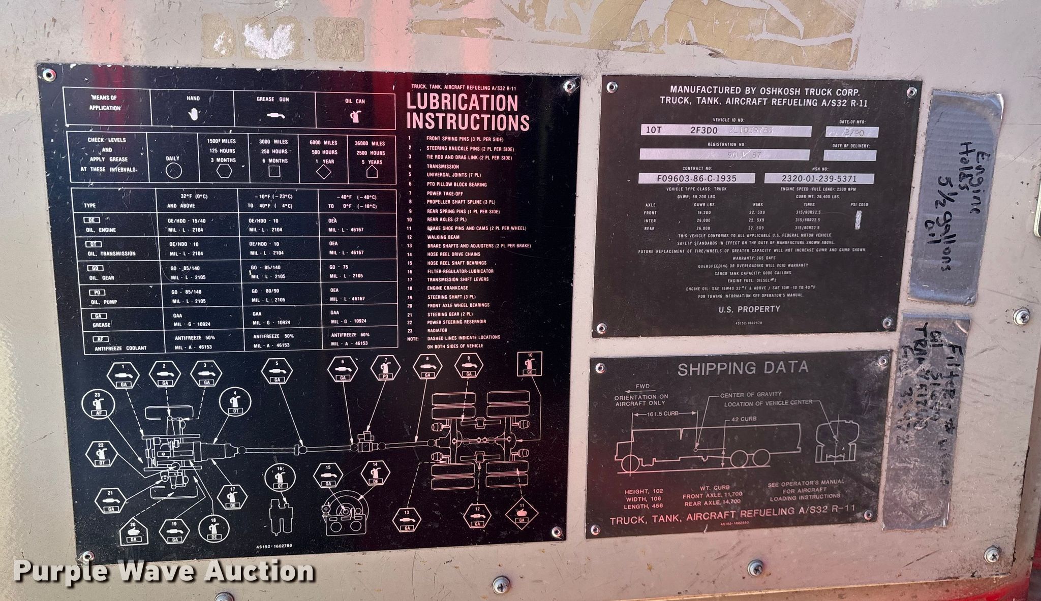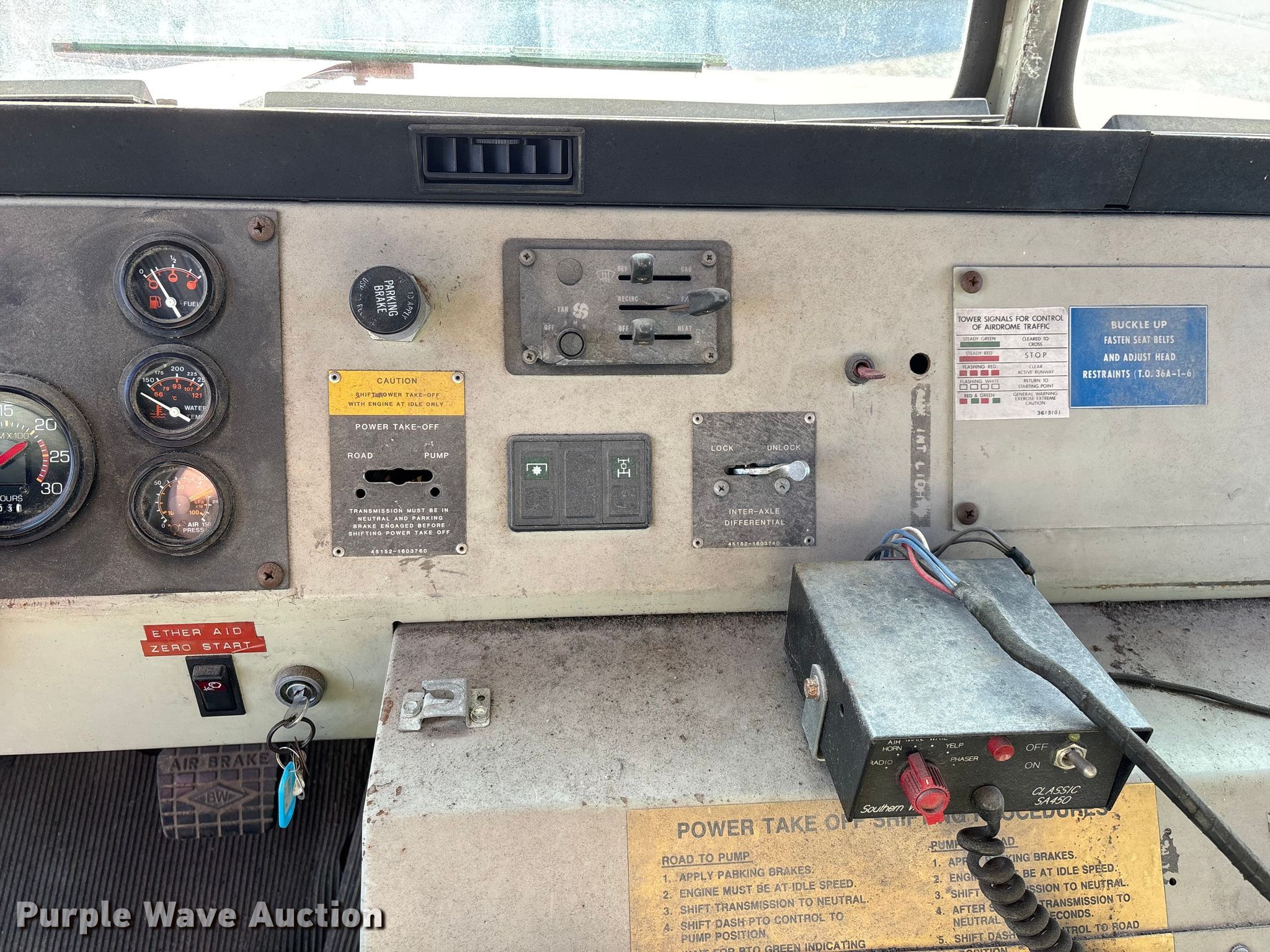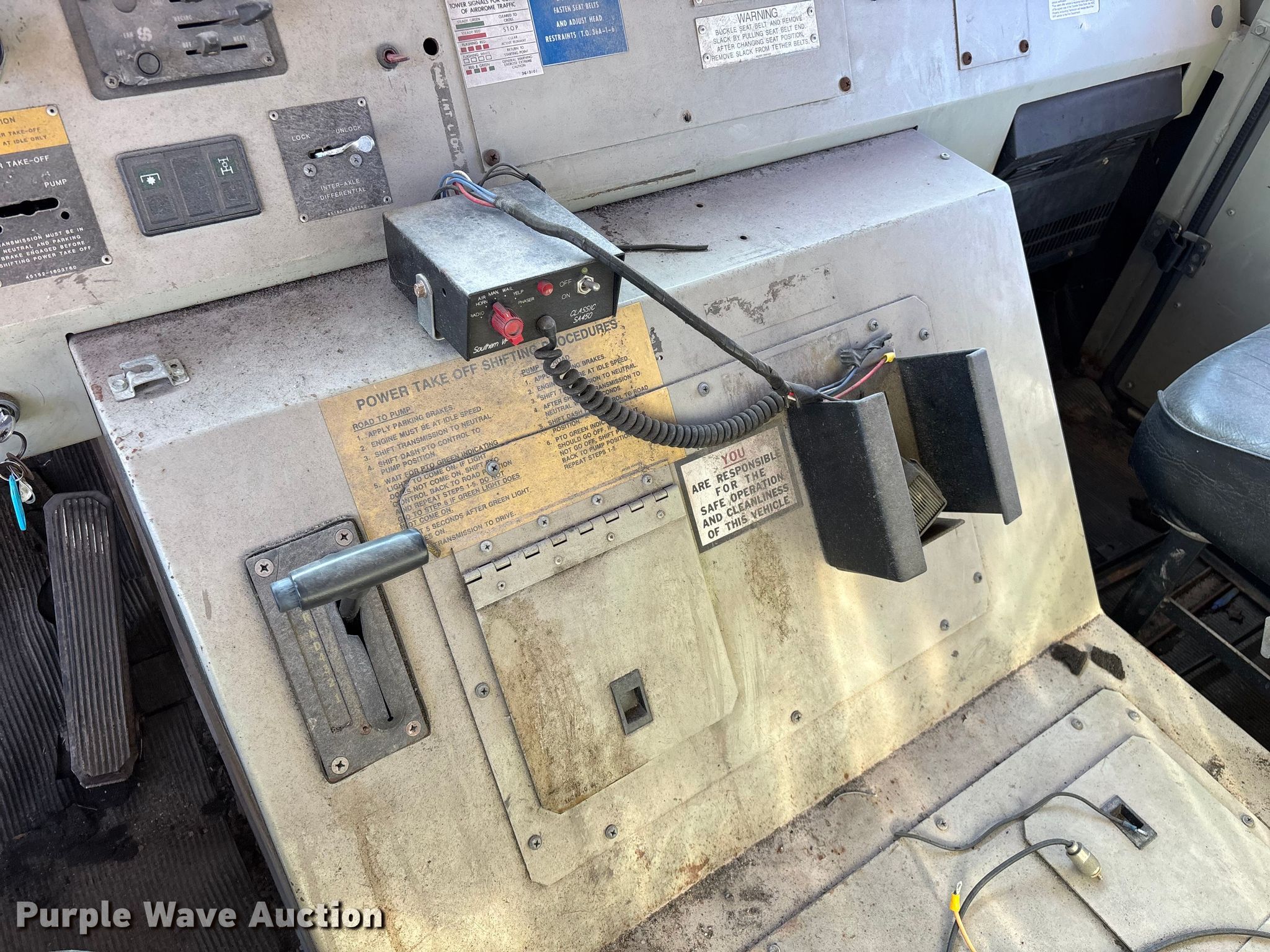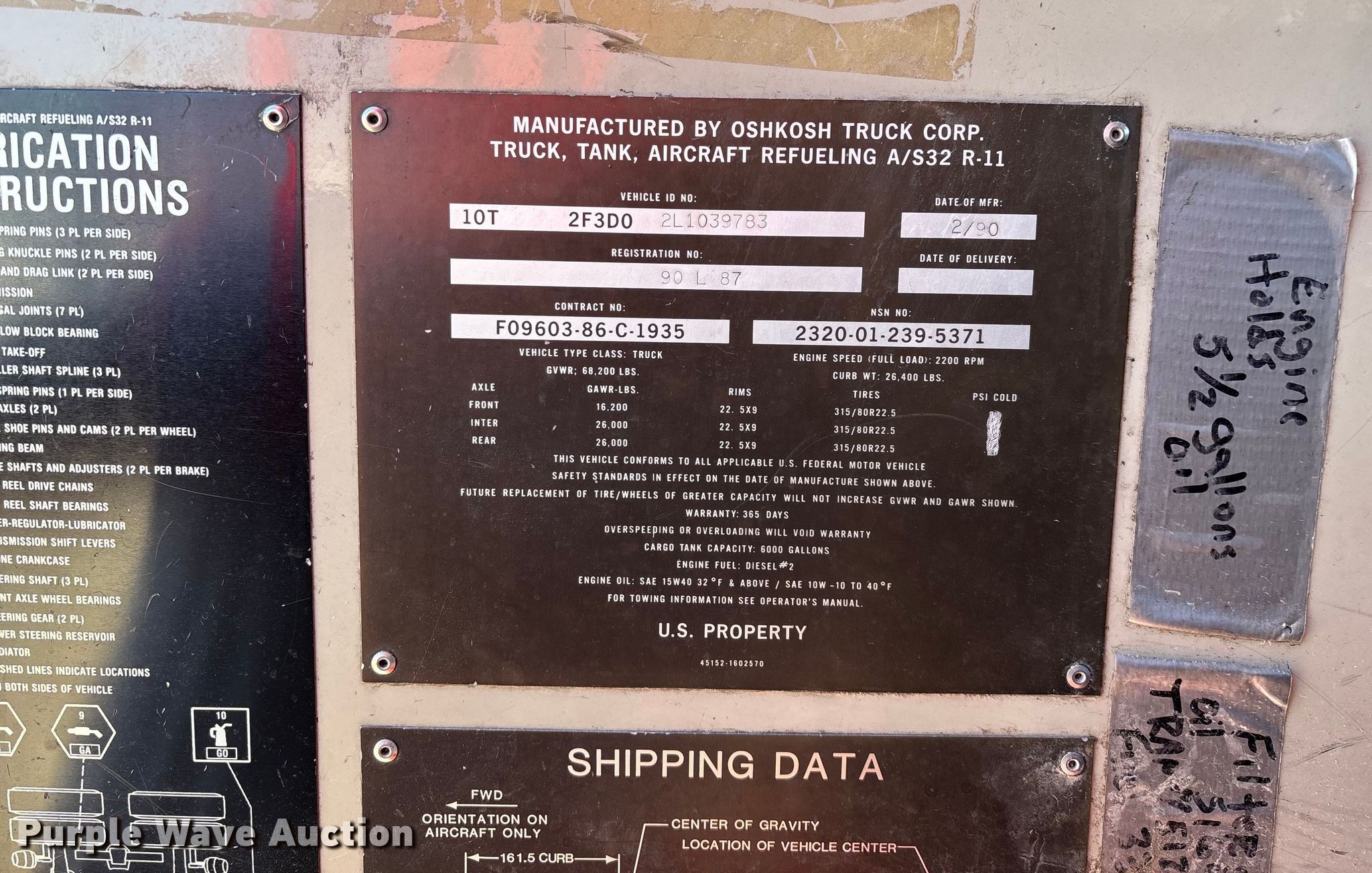 1990 Oshkosh pumper fire truck. Miles: 10,393 on odometer, Hours: 3,503 on meter, VIN: 10T2F3D02L1039783. Engine Cummins, Displacement: 8.3L, Cylinders: 6, Fuel type: Diesel. Transmission Automatic. Chassis Suspension: Spring over walking beam, Axles: Tandem, Brakes: Air, GVWR: 68,200 lbs. Interior Heat. Features Fire truck body Tank Capacity: 6,000 gallons, Pump, PA/ siren controls. Tires Size: 315/80R22.5. Notes Jump start required during on-site data collection, Unknown operating condition of blower motor, Non-operational passenger window, will not roll up. Missouri title. Title distribution may be delayed up to 14 days from verification of funds. Purdy Fire Protection District. Purdy, MO 65734