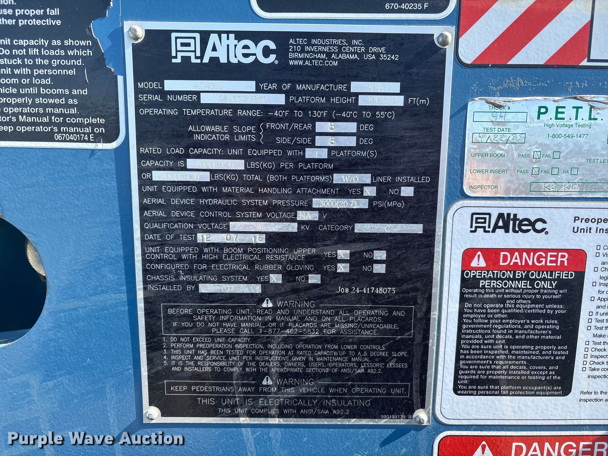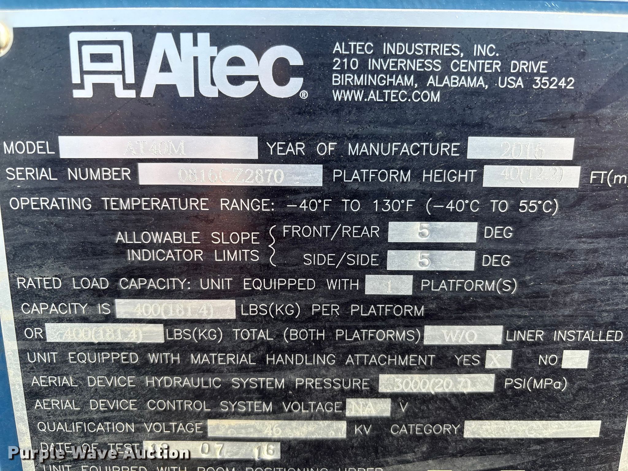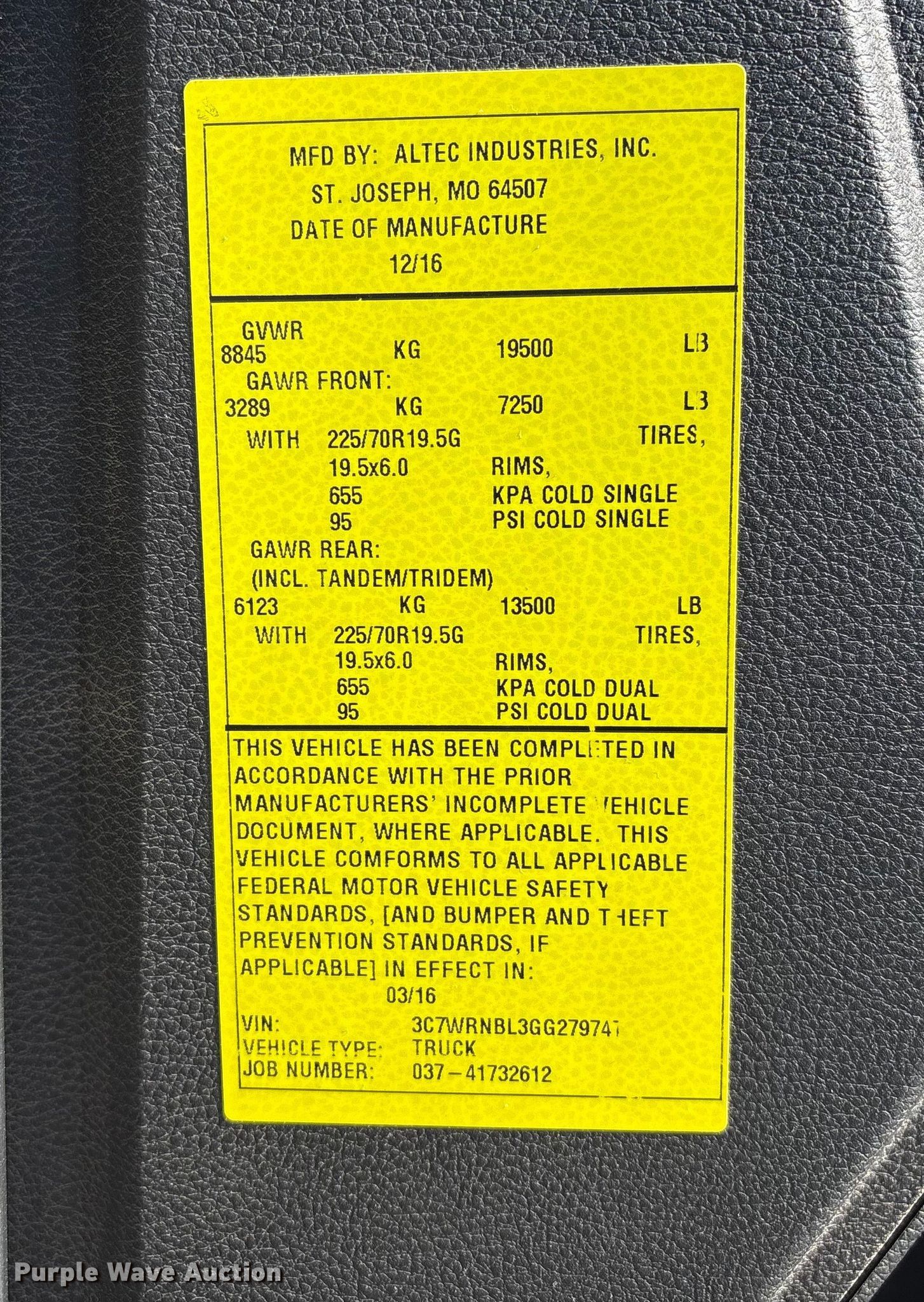 2016 RAM 5500HD bucket truck. Miles: 145,660 on odometer, Hours: 7,291 on meter, VIN: 3C7WRNBL3GG279747. Engine Displacement: 6.7L, Cylinders: 6, Fuel type: Diesel. Transmission Automatic. Chassis Four wheel drive, Axles: Single, Suspension: Spring, Brakes: Hydraulic, Wet kit, GVWR: 19,500 lbs.. Interior AC, Heat, Heated mirrors, Power windows, Power locks, Cruise control, Backup camera, Auxiliary controls, Brake controller. Features Bed Utility bed, Altec, Serial: 37-41732612, Length: 10' 6", Width: 94", Height: 5' 3", Boom 2016 Altec AT40M, Serial: 0816CZ2870, Mast height: 40', Maximum lift capacity: 400 lbs., Boom type: Articulating, Insulated, Telescopic, Man basket, Boom controls Lower, Basket, Material handler, Certification valid through: 04/2026. Tires Size: 225/70R19.5. Notes Dash warning indicator: Check engine. Nebraska title. Title distribution may be delayed up to 14 days from verification of funds. Norris Public Power District. Beatrice, NE 68310