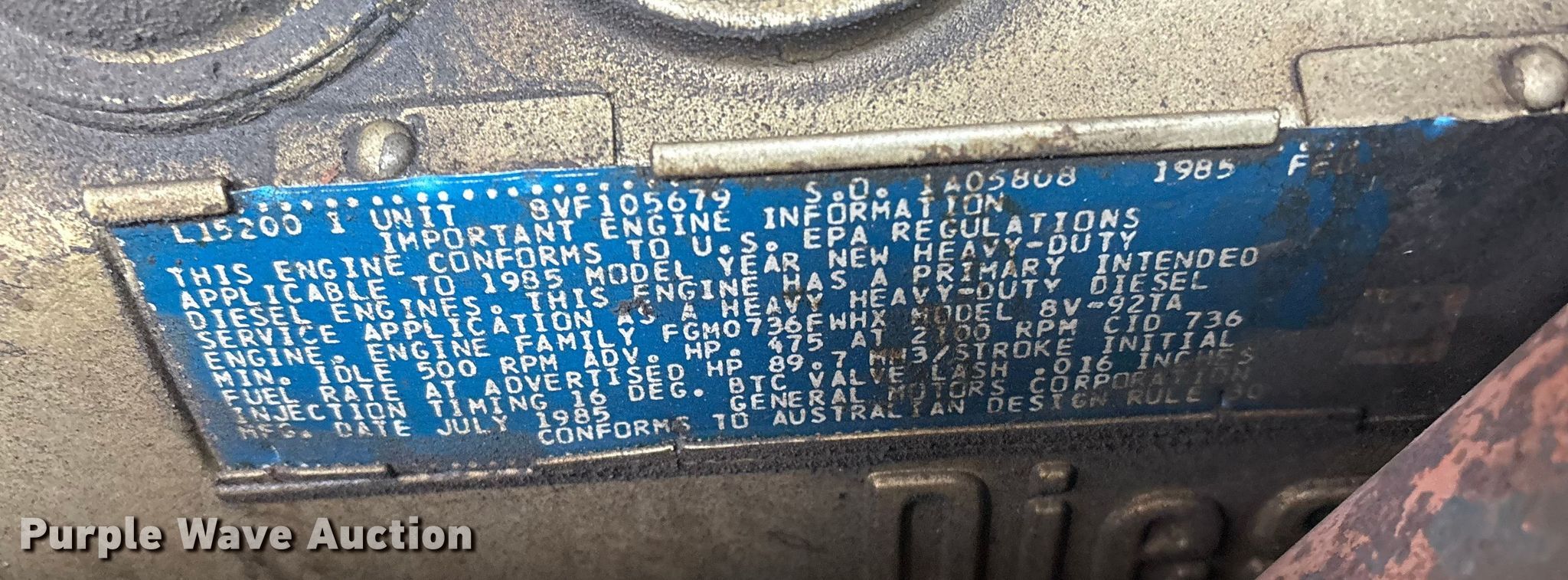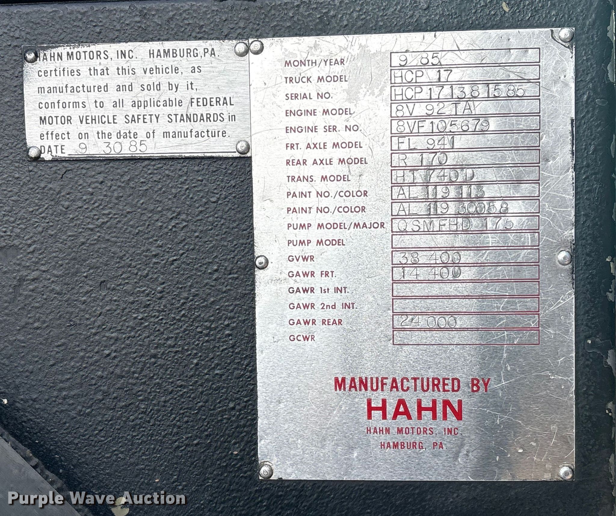 1985 Hahn HCP17 pumper fire truck. Miles: 305 on odometer, Miles: Actual unknown, Hours: 3,719 on meter, VIN: HCP171381585, Unit #: 351. Engine Detroit Diesel 8V-92A, Serial: 8VF105679, Displacement: 12.1L, Cylinders: 8, Fuel type: Diesel. Transmission Morse, Automatic. Chassis Axles: Single, Suspension: Spring, Brakes: Air, GVWR: 38,400 lbs. Interior Heat. Features Fire truck body Elevated deck gun, Tank, Pump 1,750 gpm, Ground ladder, Generator McGraw-Edison 3.0DJA-3CP/3005V, Fuel type: Diesel, kW: 3, PA/ siren controls. Tires Size: 11.00R20. Oklahoma classic title. Title distribution may be delayed up to 30 days from verification of funds. Hickory Grove Fire Department. Grove, OK 74344