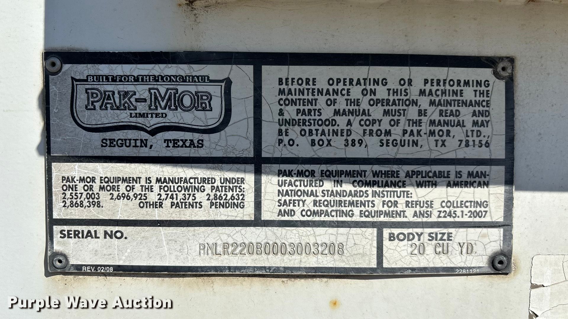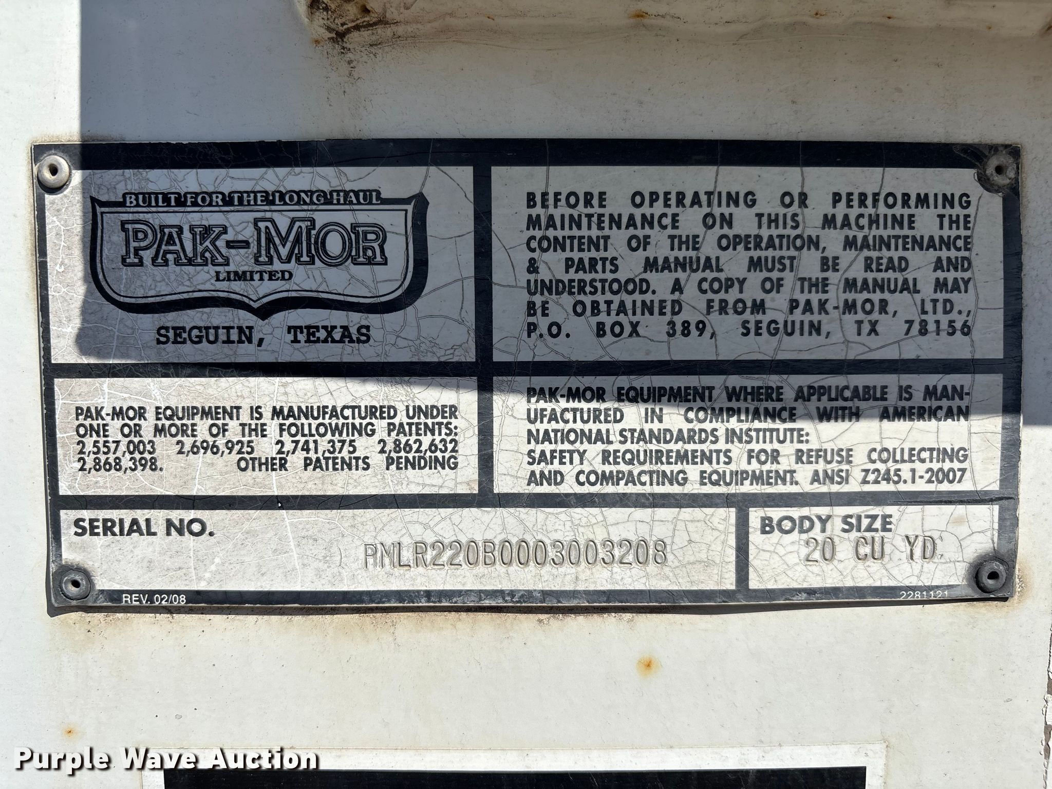 2009 Freightliner Business Class M2 refuse truck. Miles: 38,901 on odometer, Hours: 1,739 on meter, VIN: 1FVACXBS29HAF7921. Engine Cummins, Displacement: 8.3L, Fuel type: Diesel. Transmission Allison, Automatic. Chassis Axles: Single, Suspension: Spring, Brakes: Air, GVWR: 33,000 lbs, Wheelbase: 204". Interior Heat, Cruise control, Backup camera. Features Refuse bed Pak-Mor, Serial: PMLR220B0003003208, Capacity: 20 cu.yd., Load: Rear, Cart tipper, Winch. Tires Size: 11R22.5, Brand: Goodyear. Notes Decals will be removed prior to auction, Oil leak, Air brakes issues, leaks, Dash warning indicator: Check engine. Kansas title. Title distribution may be delayed up to 14 days from verification of funds. City Of Atchison. Atchison, KS 66002