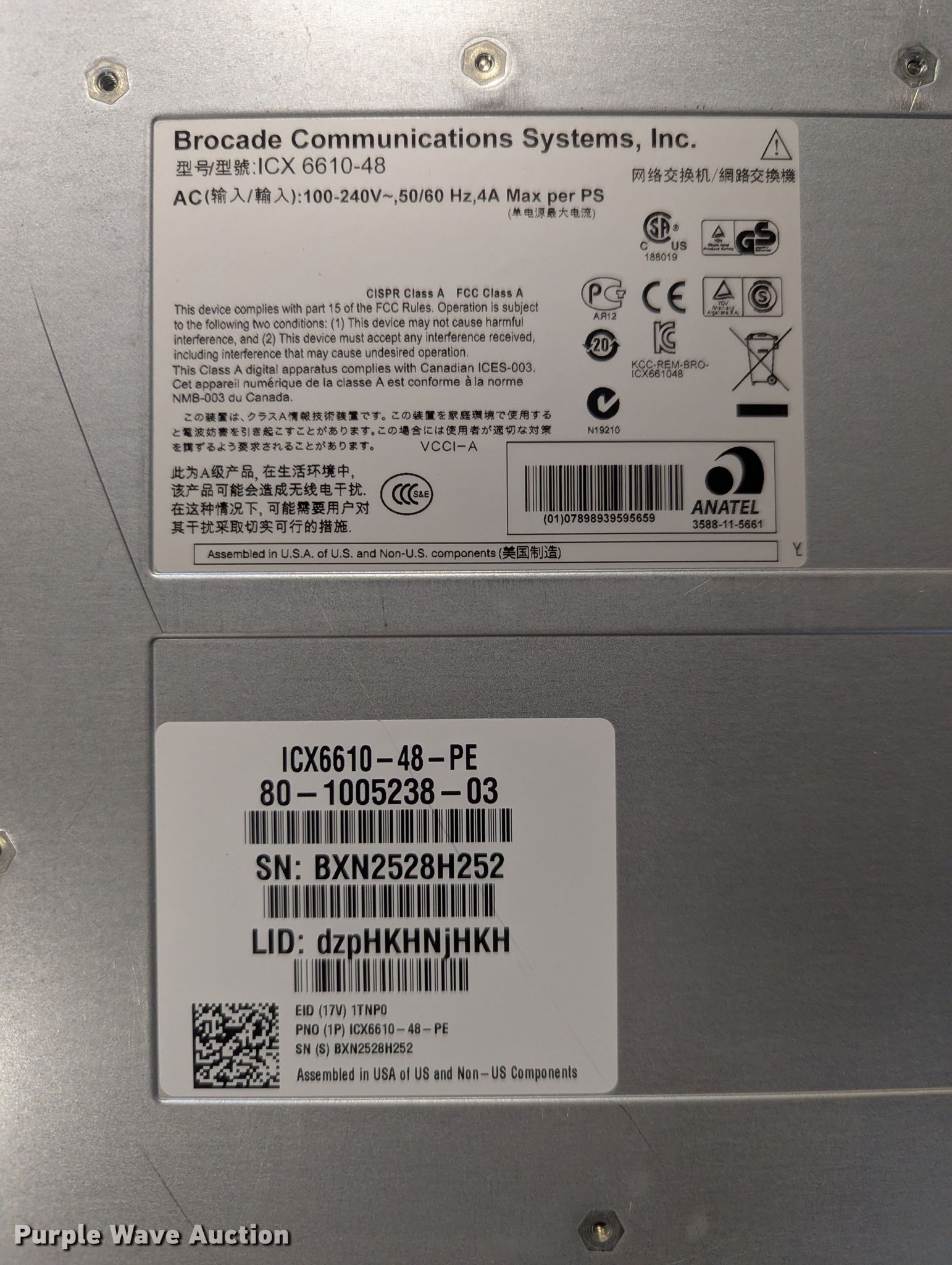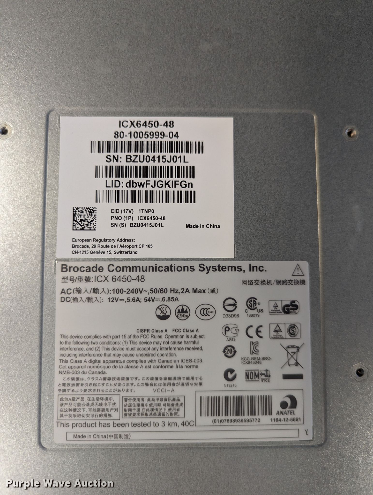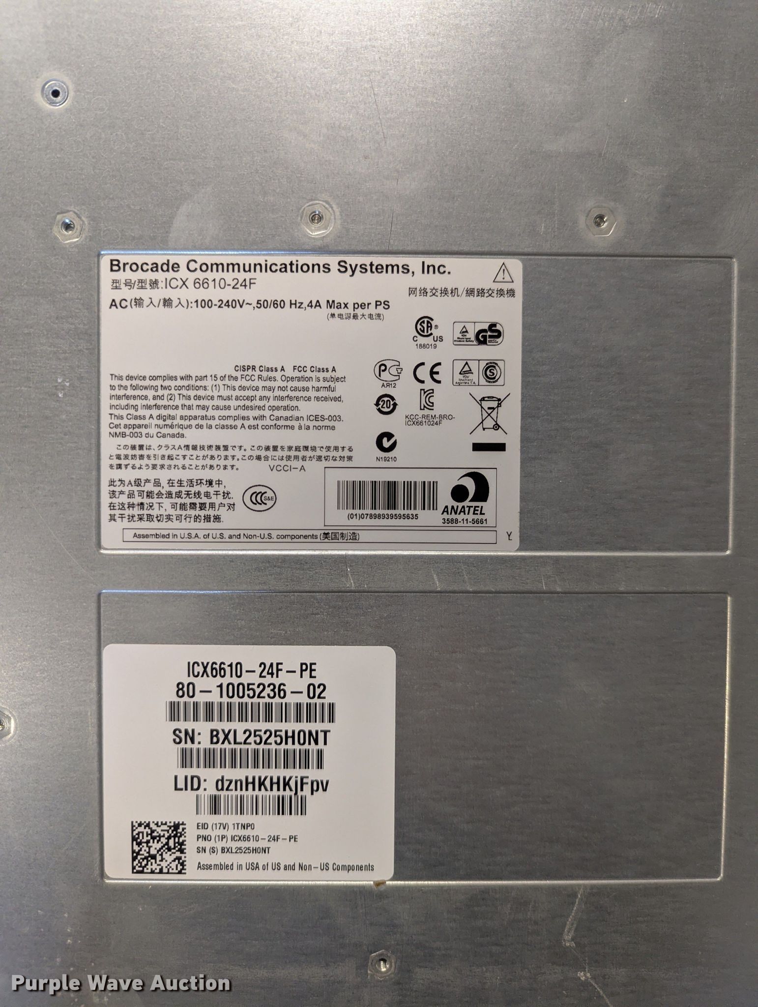 Purple Wave is selling a used Electronics in Iowa. This item is a Brocade ethernet switches with the following: ICX 6610-24F-PE, (5) ICX 6610-48-PE, (4) ICX 6450-24, (22) ICX 6450-48, Power cables may be missing