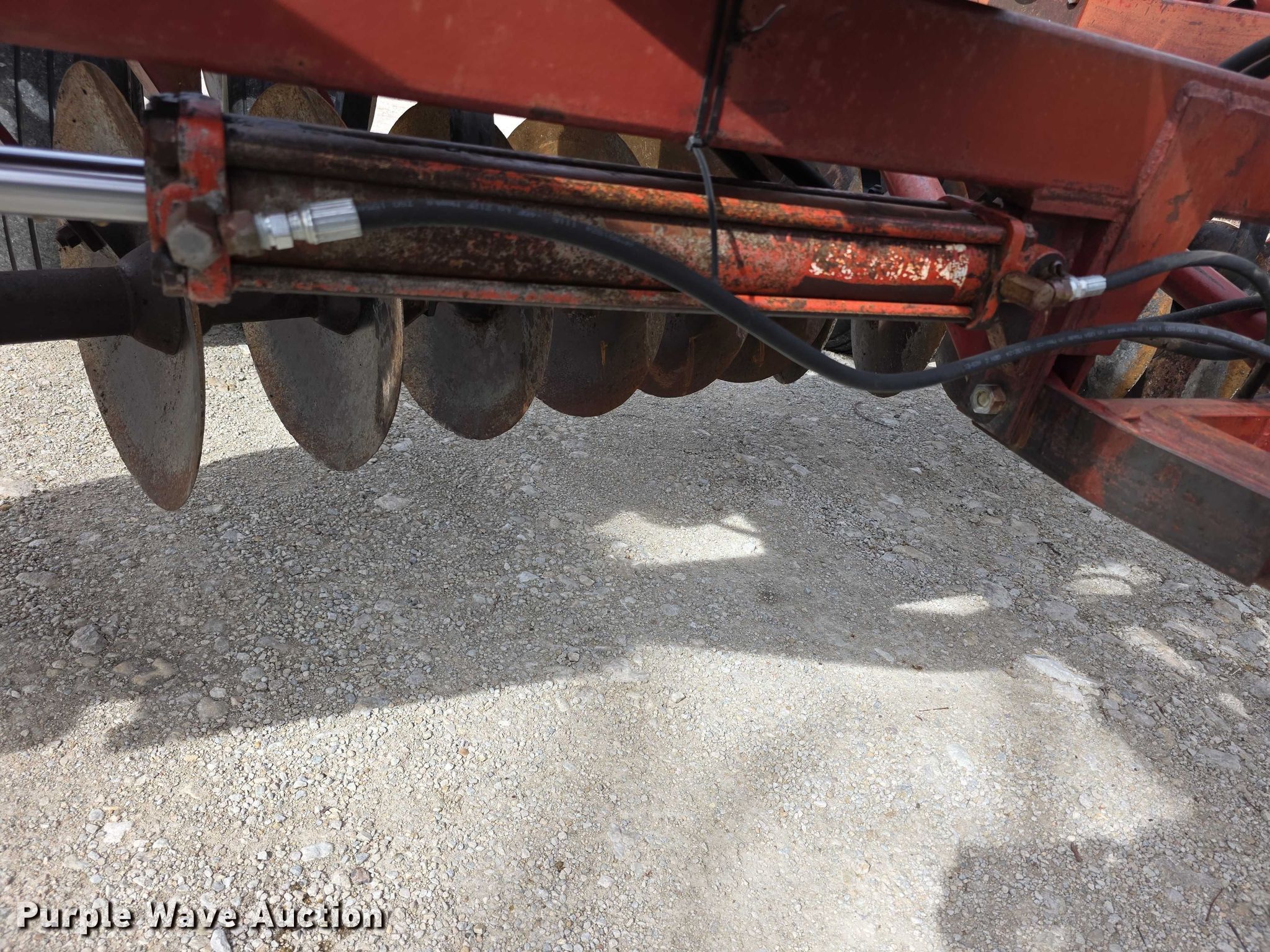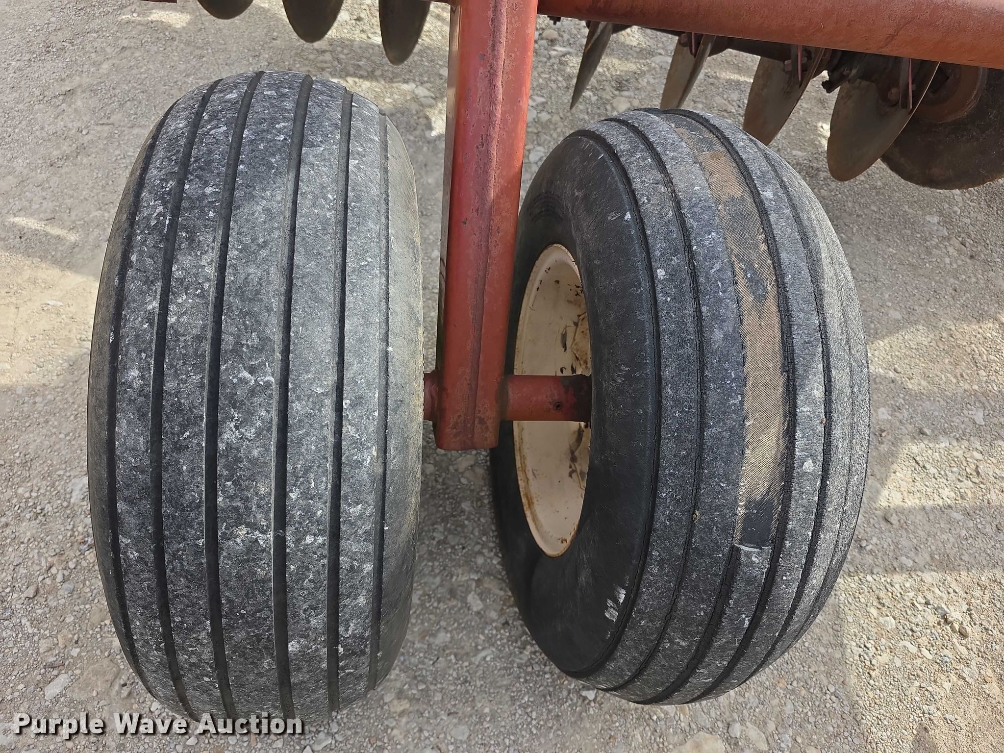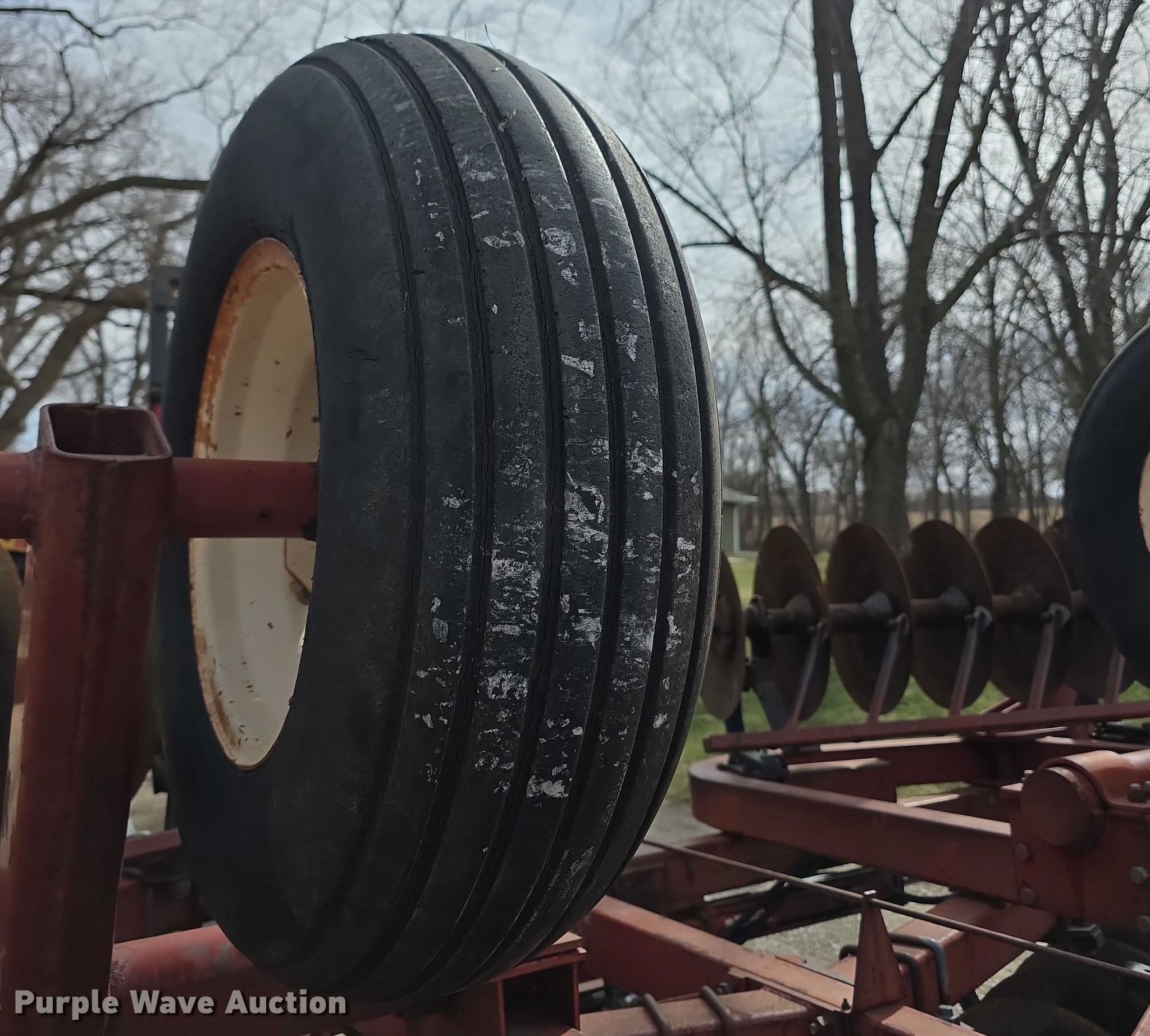 Kewanee 1100 tandem disk. Overall width: 22'. Features Front blades Diameter: 20", Spacing: 8", Rear blades Diameter: 20", Spacing: 8", Disk scrapers, Operation Hydraulic lift, Hydraulic fold, Hitch: Pin. Tires Tire size: 11L-15. Saint George, KS 66535