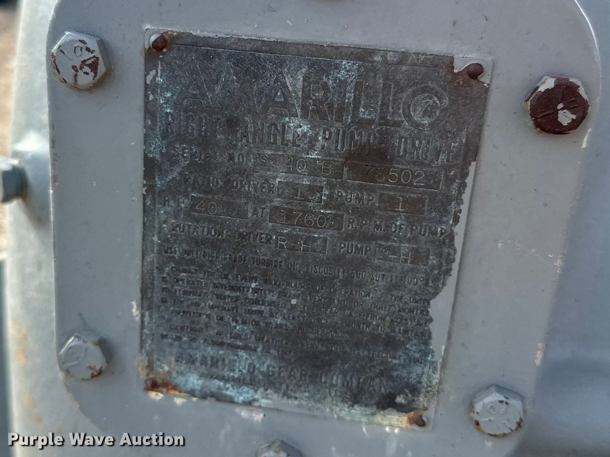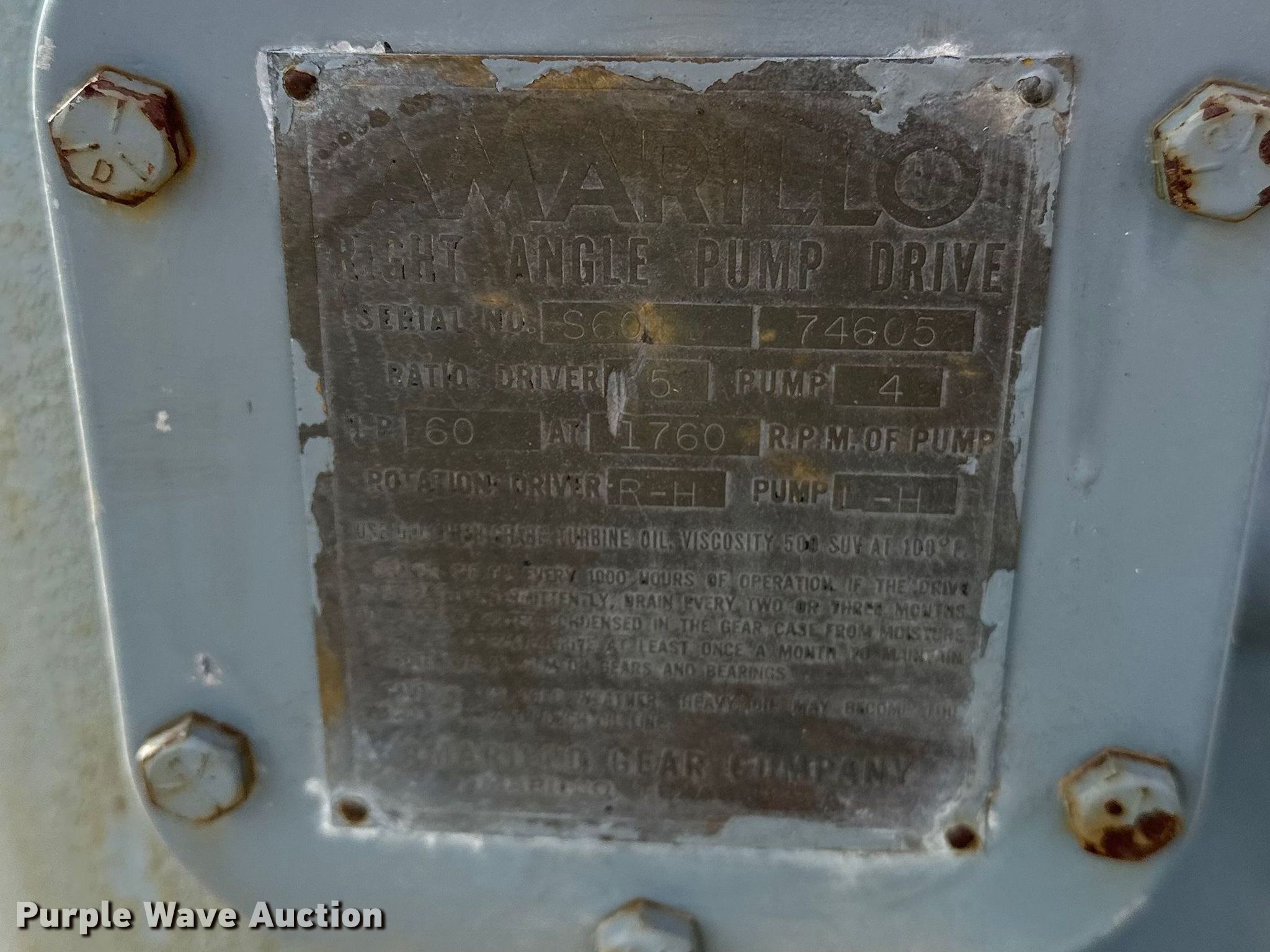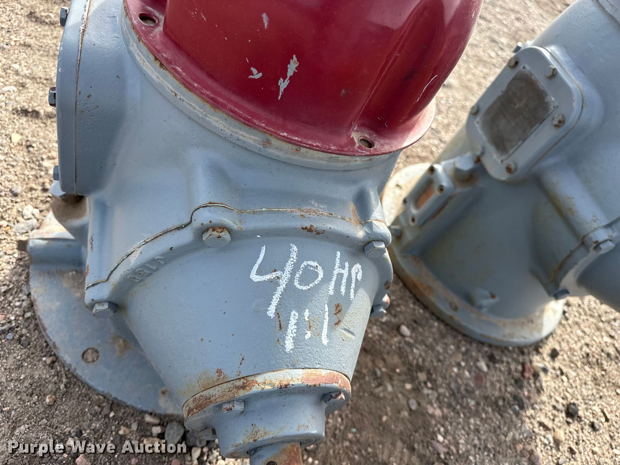 Purple Wave is selling a used Electric Motor in Kansas. This item is a (2) Amarillo right angle drives with the following: Serial: S60 74605, HP: 60, Ratio: 5:4, Serial: S40B 76502, HP: 40, Ratio: 1:1