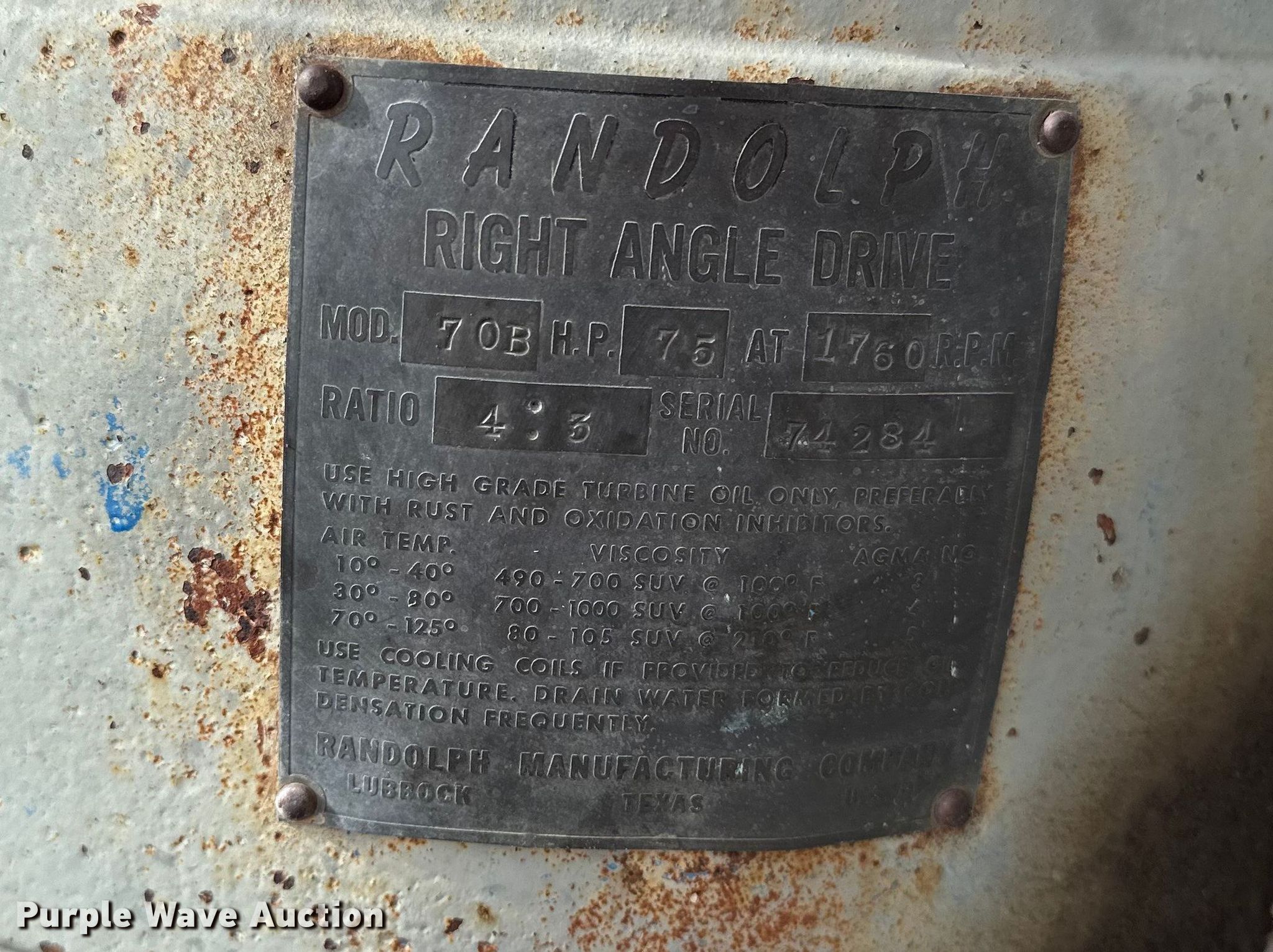 Purple Wave is selling a used Electric Motor in Kansas. This item is a (2) right angle drives with the following: Randolph 70B, Serial: 74284, HP: 70, Ratio: 4:3, Unknown make, HP: 100, Ratio: 1:1