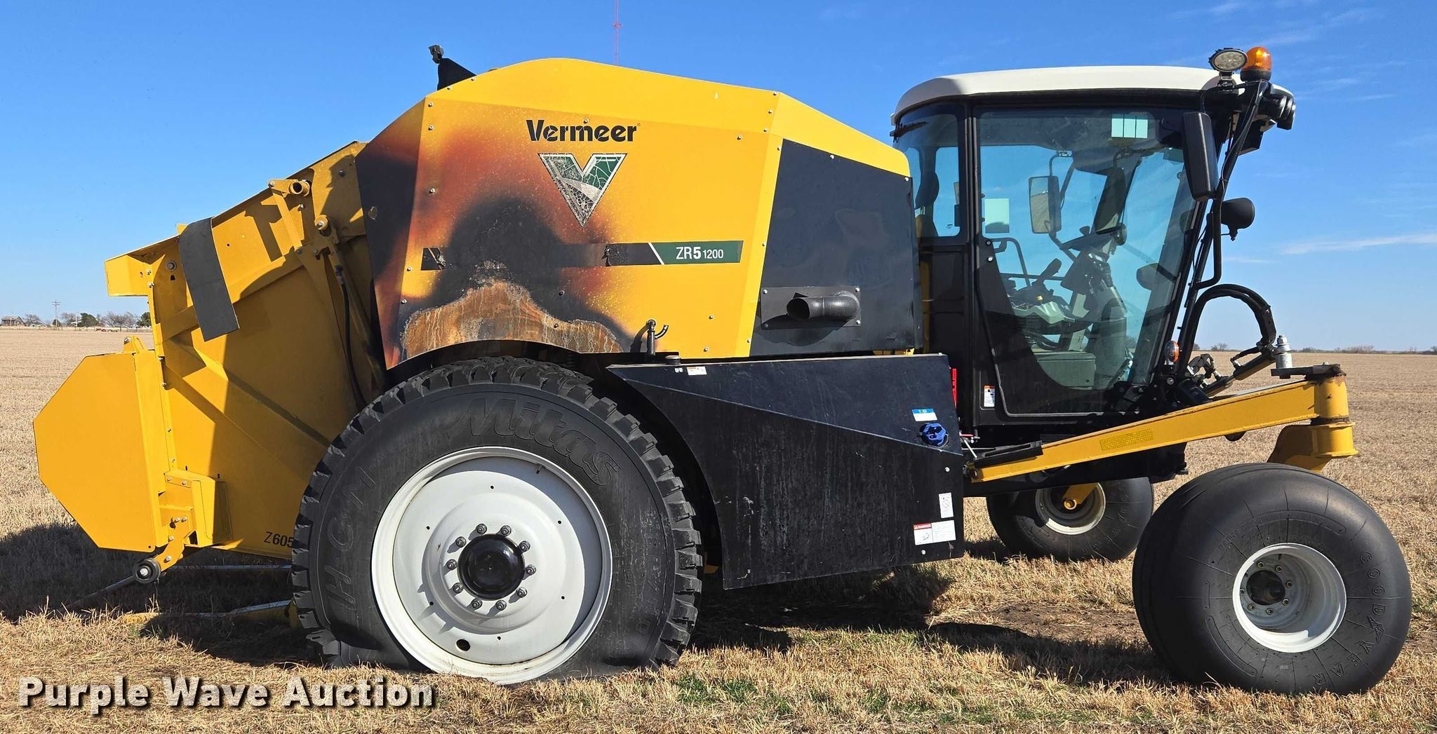 Purple Wave is selling a used Round Baler in Oklahoma. This item is a 2023 Vermeer ZR5-1200 round baler with the following: Miles: 2928, Hours: 346 on meter, Bale count: 10,034, Serial: 1VRN1727LP1008002, Insurance Claim #: 5-816448