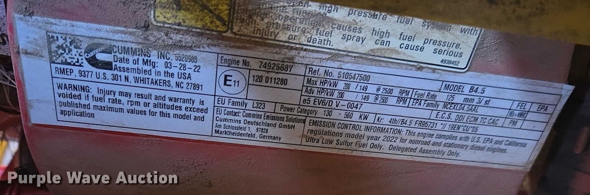 2023 Vermeer ZR5-1200 round baler. Miles: 2928, Hours: 346 on meter, Bale count: 10,034, Serial: 1VRN1727LP1008002, Insurance Claim #: 5-816448. Engine Cummins B4.5, Displacement: 4.5L, Cylinders: 4, Fuel type: Diesel. Transmission Hydrostatic. Features Monitor Vermeer VR5, Transport lights, Hydraulic pickup lift, Bale size: 5' x 6', Net-wrap, Bale ramp. Tires Size: Front: 12.5L-16.1FL, Rear: 480/80R38. Notes Burn damage, Non-operational unit. Oklahoma Farm Bureau Insurance. Lawton, OK 73501
