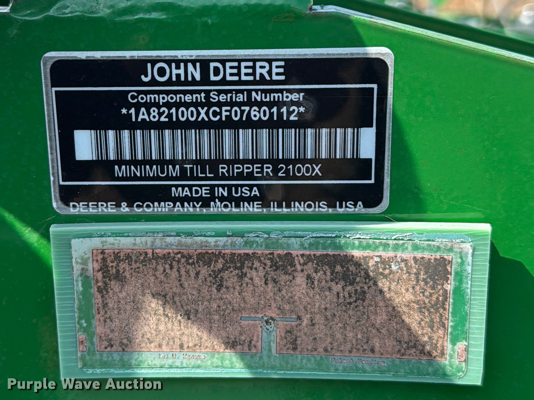 Purple Wave is selling a used Ripper in Kansas. This item is a 2015 John Deere 2100 in-line ripper with the following: Overall width: 21', Serial: 1A82100XCF0760112