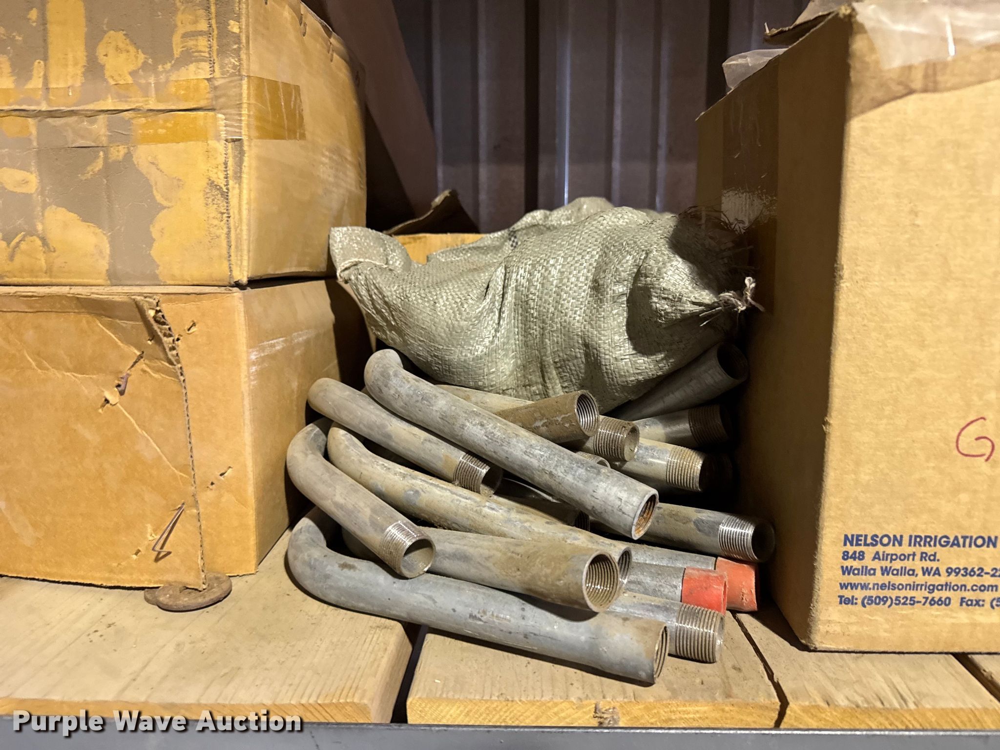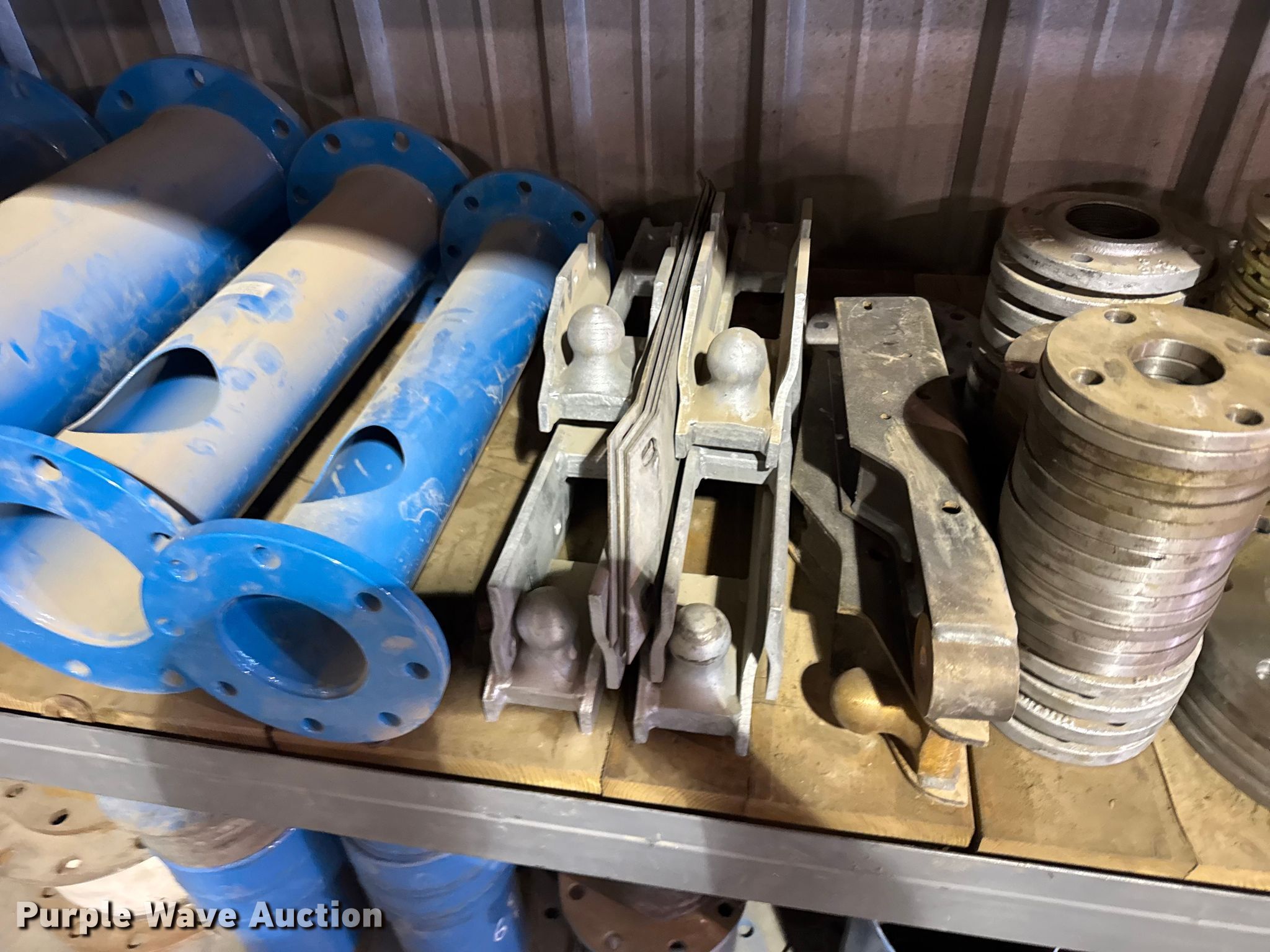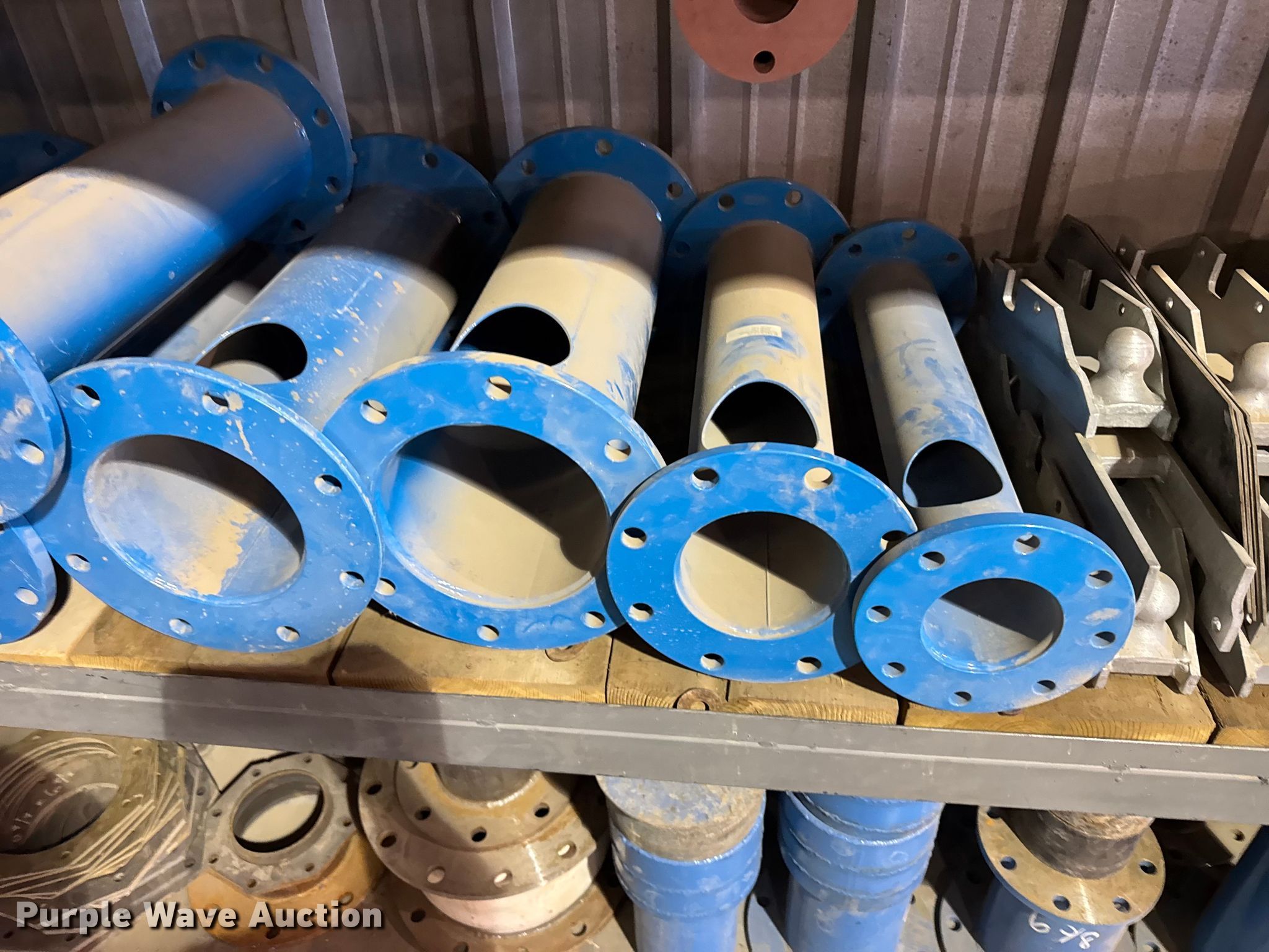 Purple Wave is selling a used Irrigation Equip. Attach. in Kansas. This item is a Pivot irrigation parts with the following: Pipe flanges, Pipe, Hitches, Impellers, Shelving not included