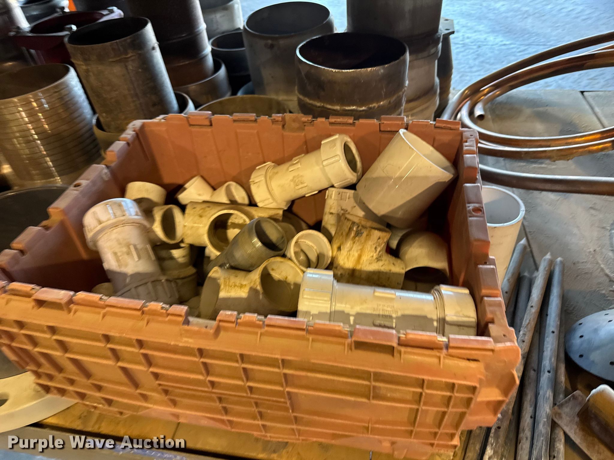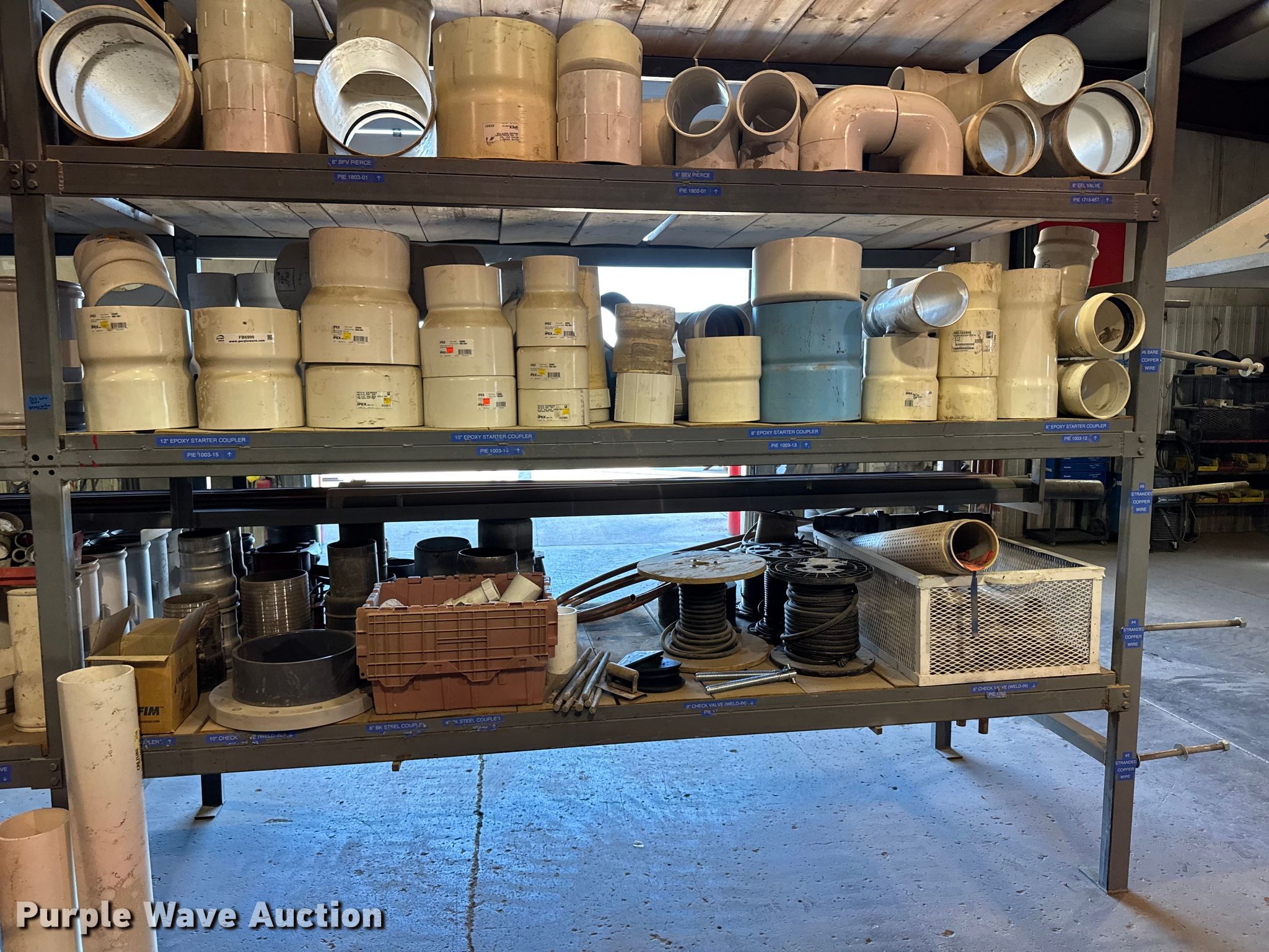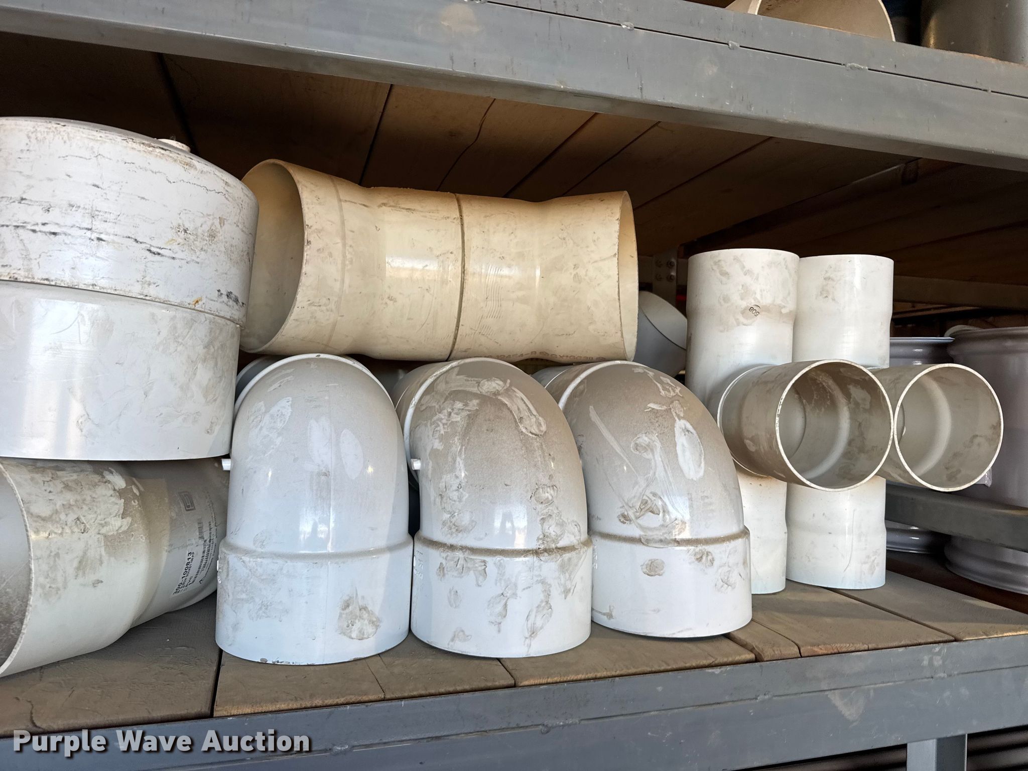 Purple Wave is selling a used Pipe in Kansas. This item is a PVC pipe fittings with the following: Wire, Shelving not included